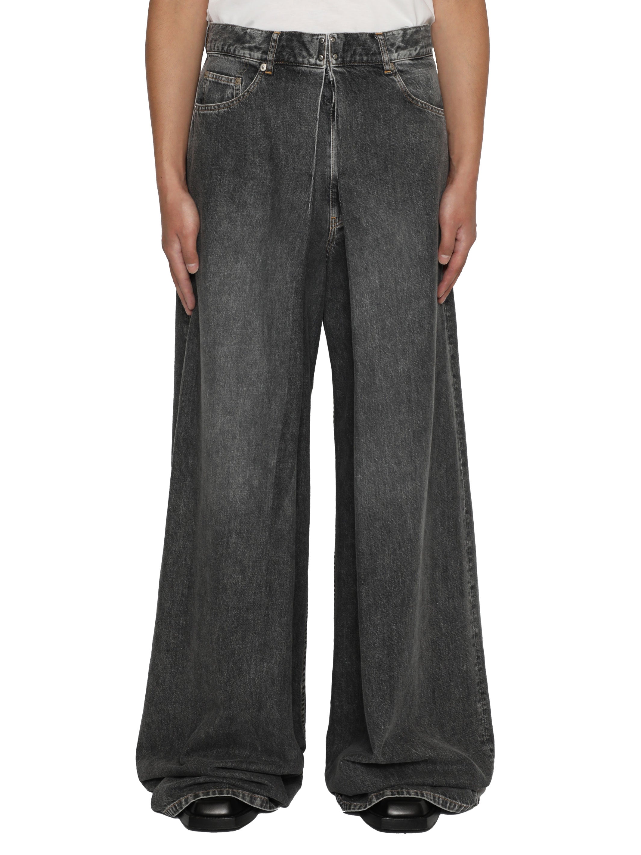 折り畳まれたデニムをフロントのホックで立体感を表現。たっぷりとしたボリューム感のスーパーワイドシルエット。