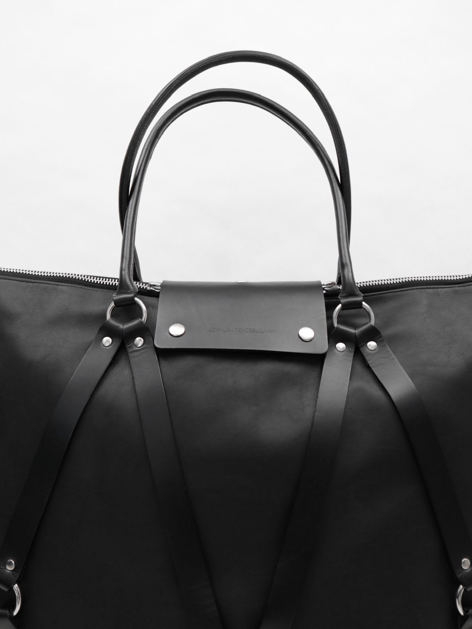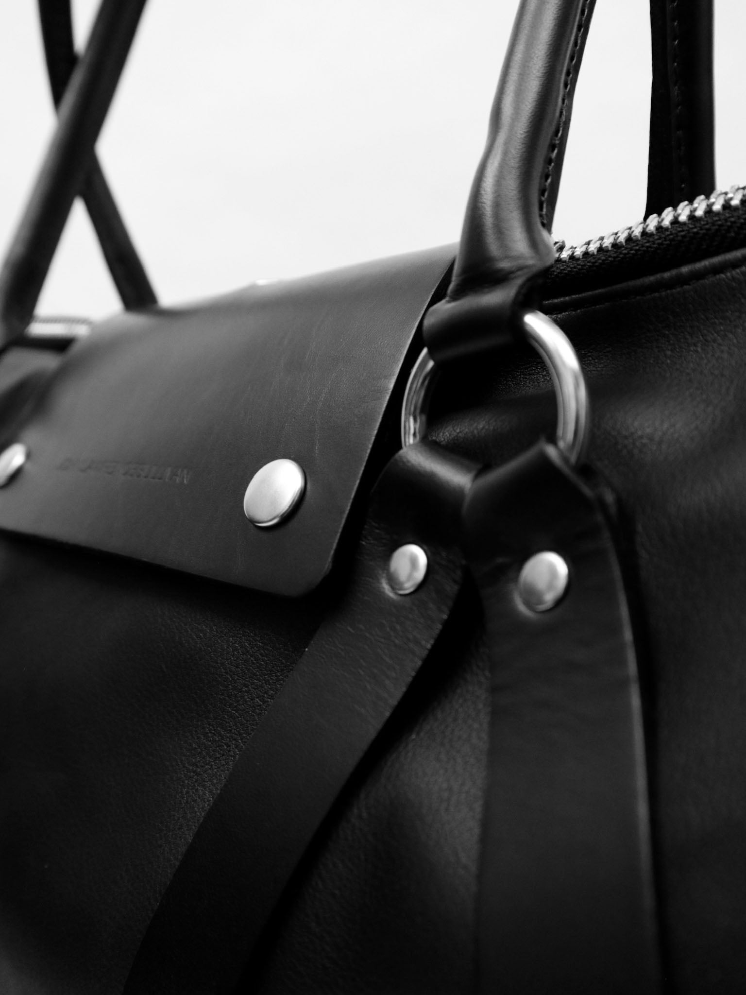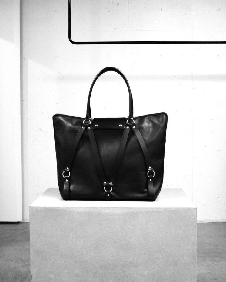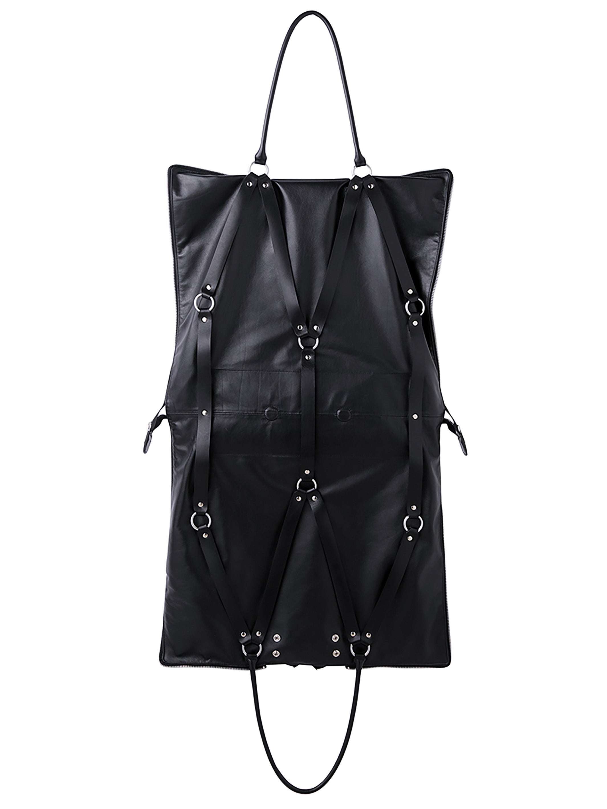 レザーとリングパーツのコンビネーションでフェティッシュ且つインダス トリアルな雰囲気のレザーバッグ。 スーツなどを持ち運ぶガーメントバッグとしても使用できる2WAY仕様。