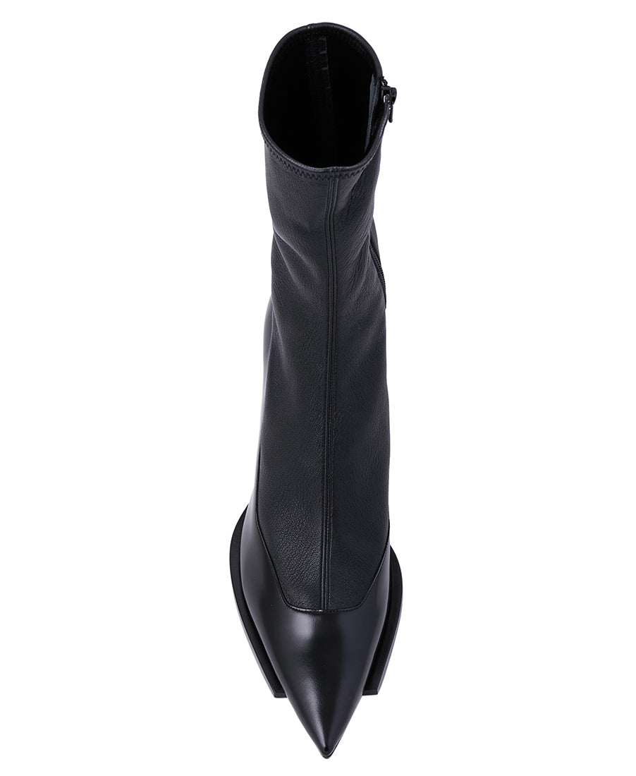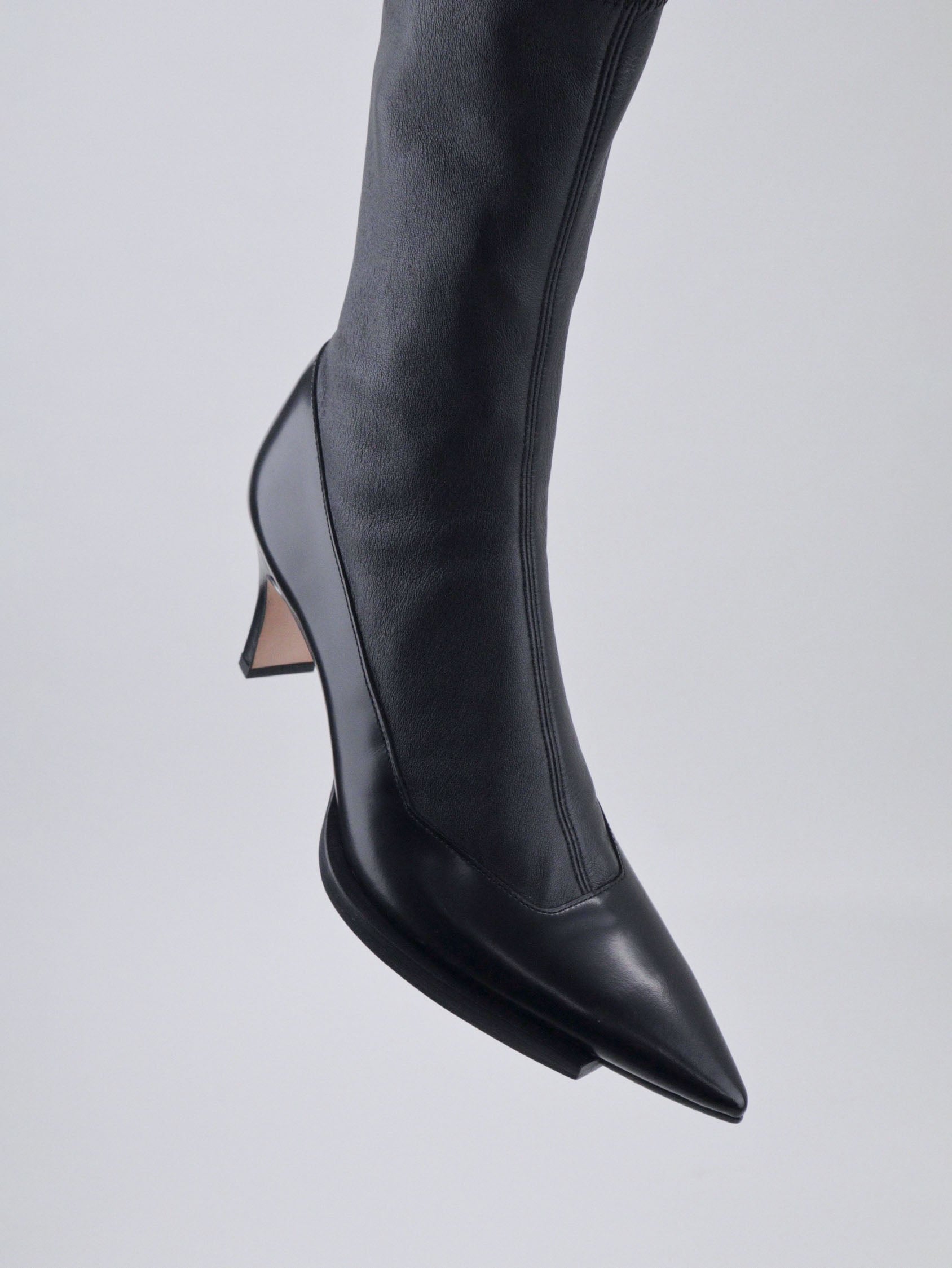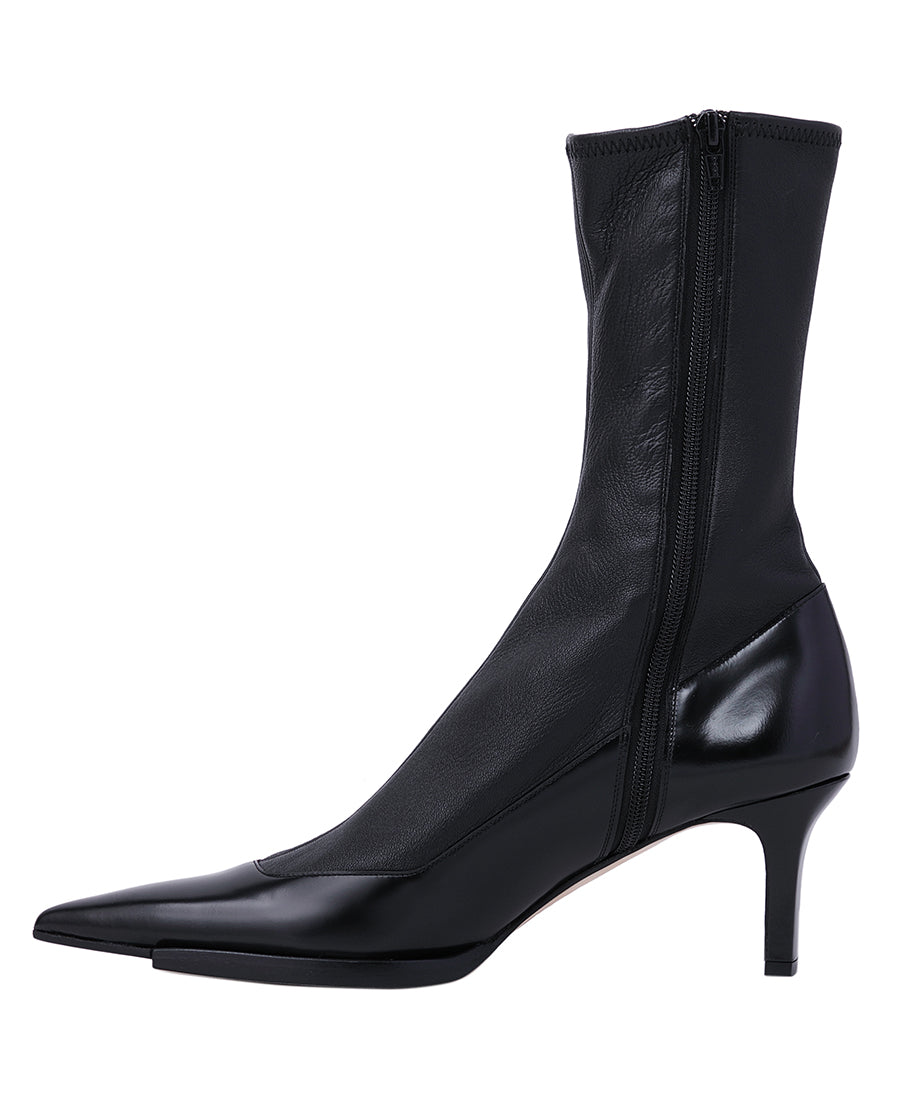 フロント部分をカットオフされたソールが特徴のポインテッドトゥブーツ。ソックスを組み合わせたように見えるストレッチレザーとのコンビネーション。ヒール高 6.5cm。