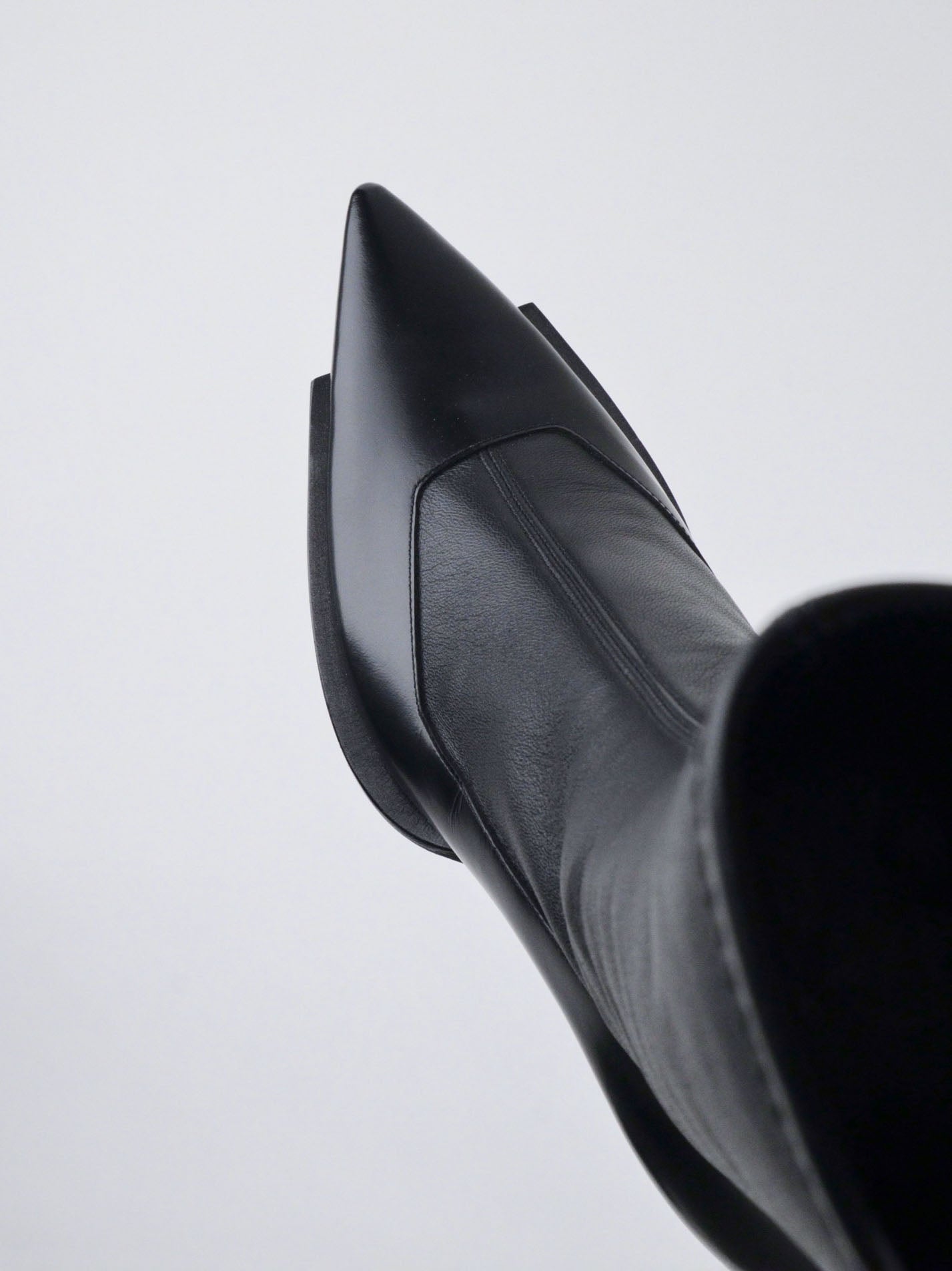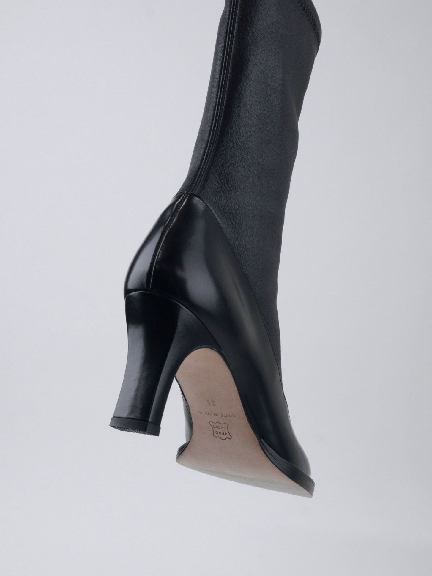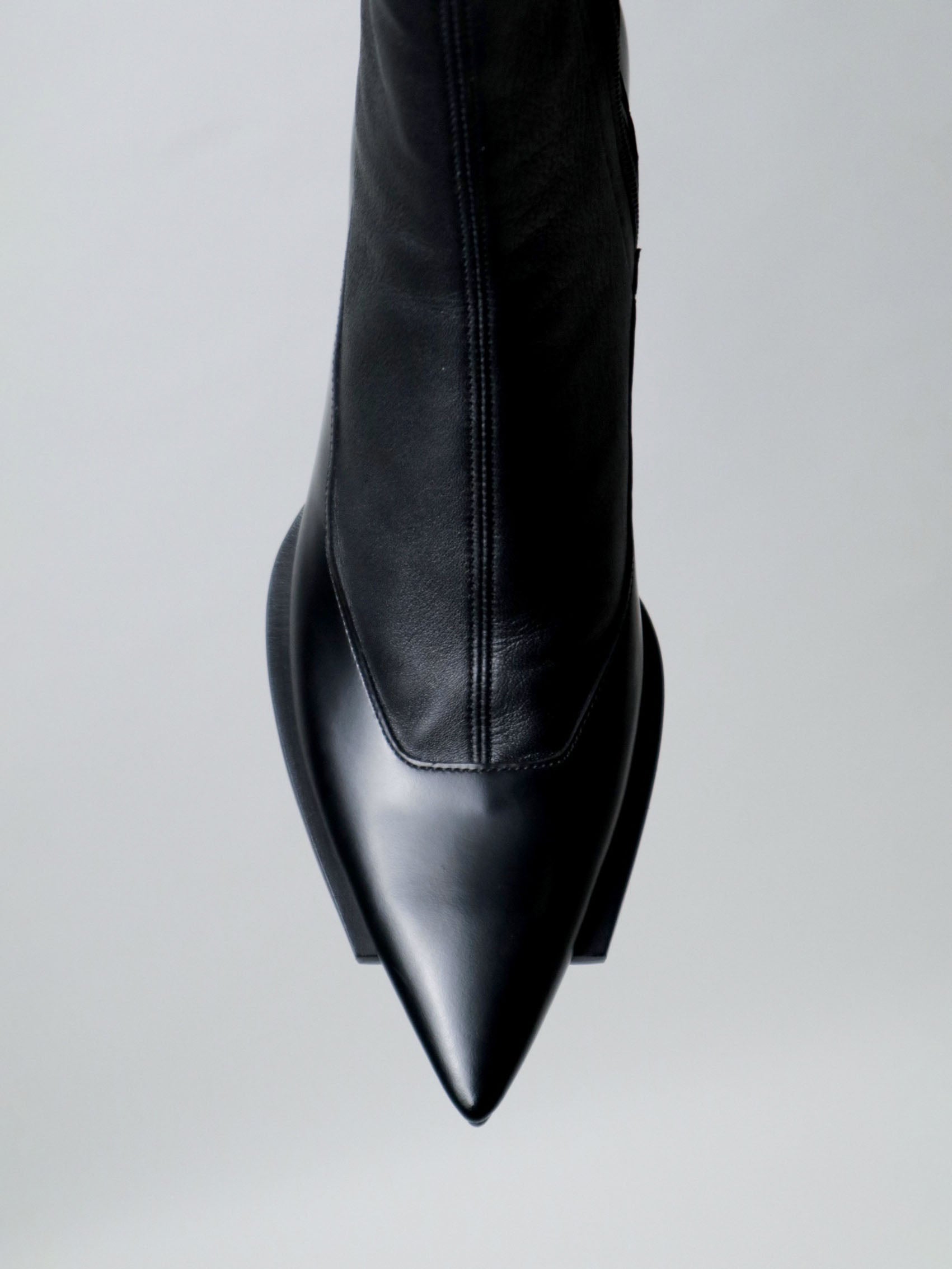 フロント部分をカットオフされたソールが特徴のポインテッドトゥブーツ。ソックスを組み合わせたように見えるストレッチレザーとのコンビネーション。ヒール高 6.5cm。