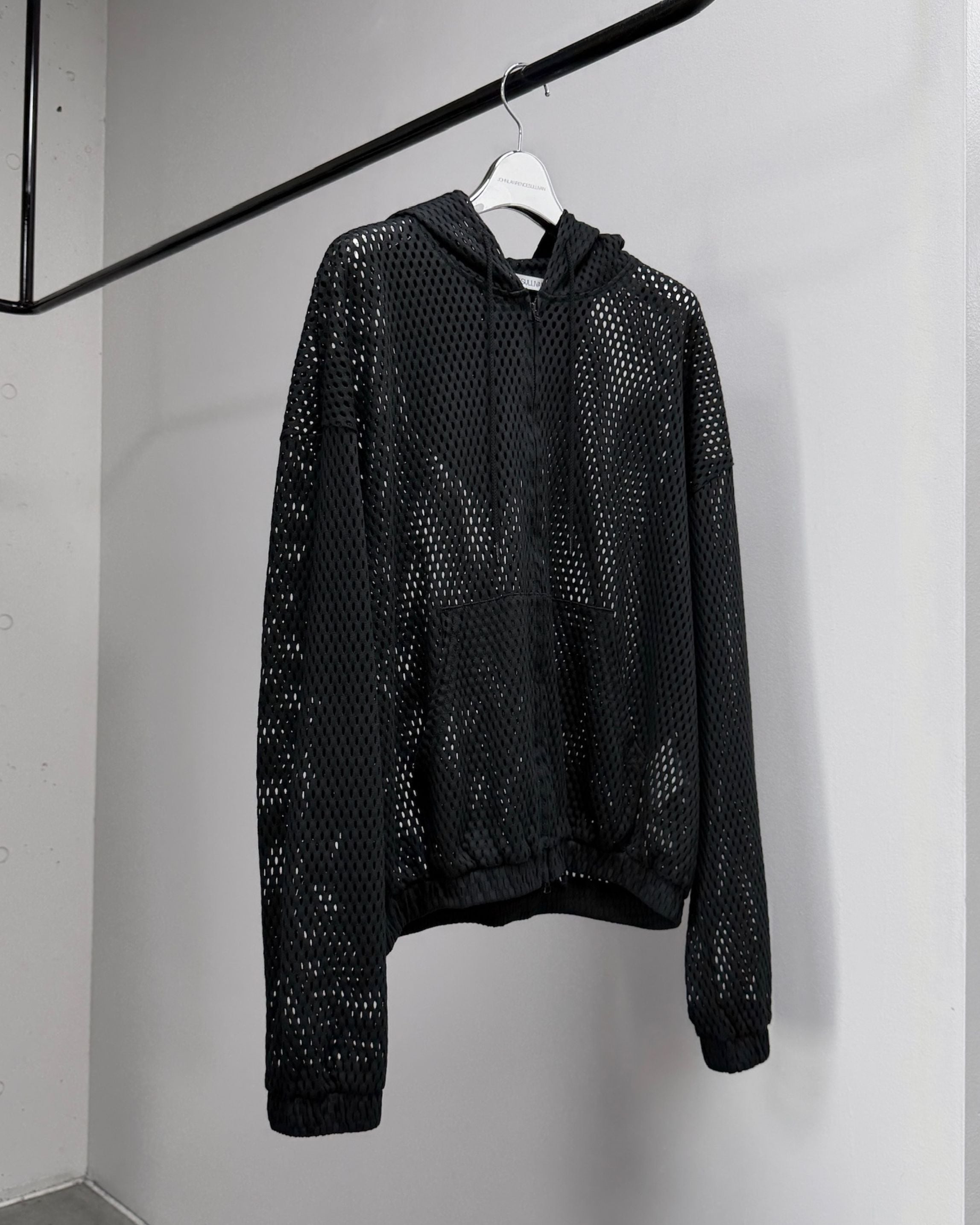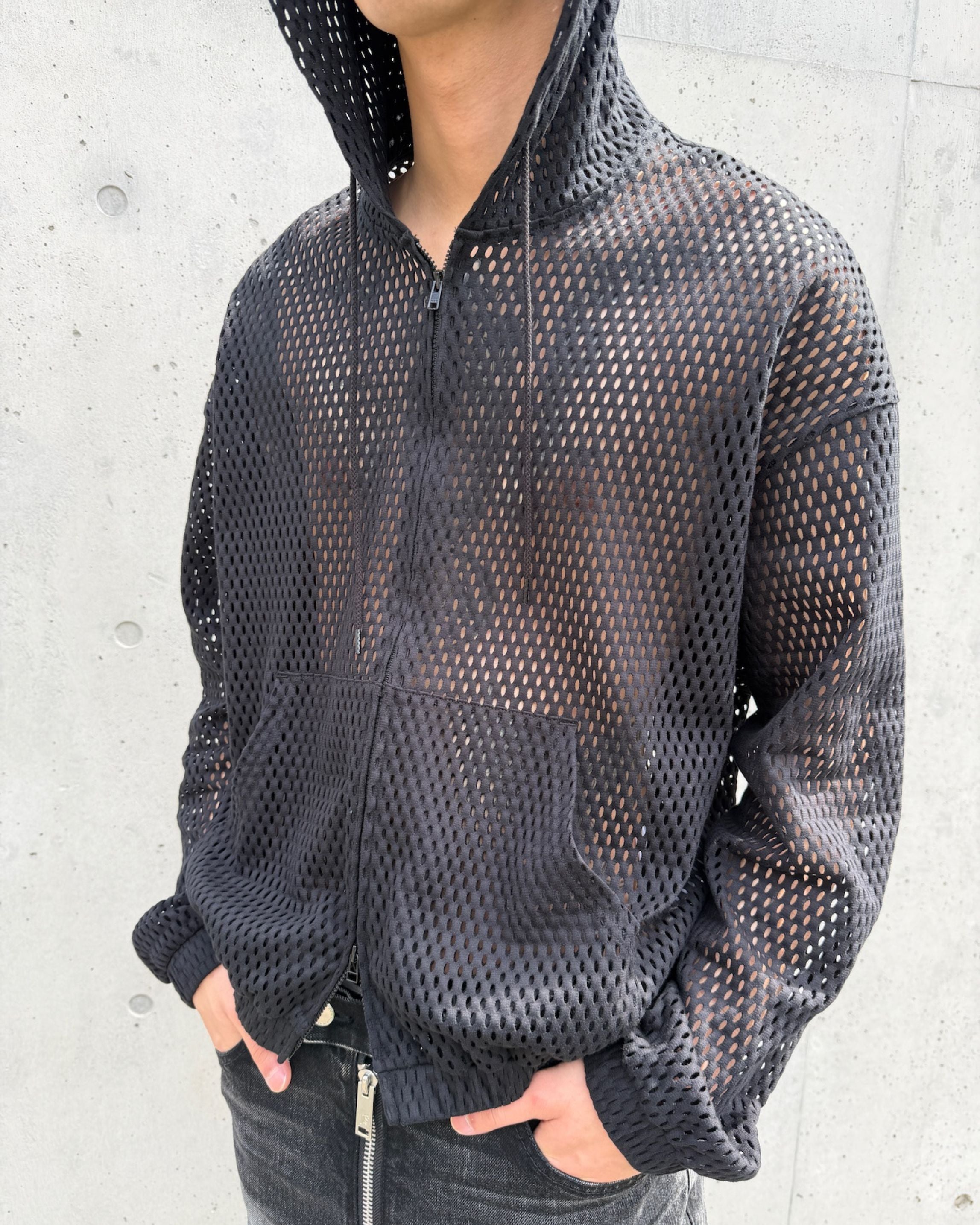 Tight-fitting mesh zip-up hoodie.