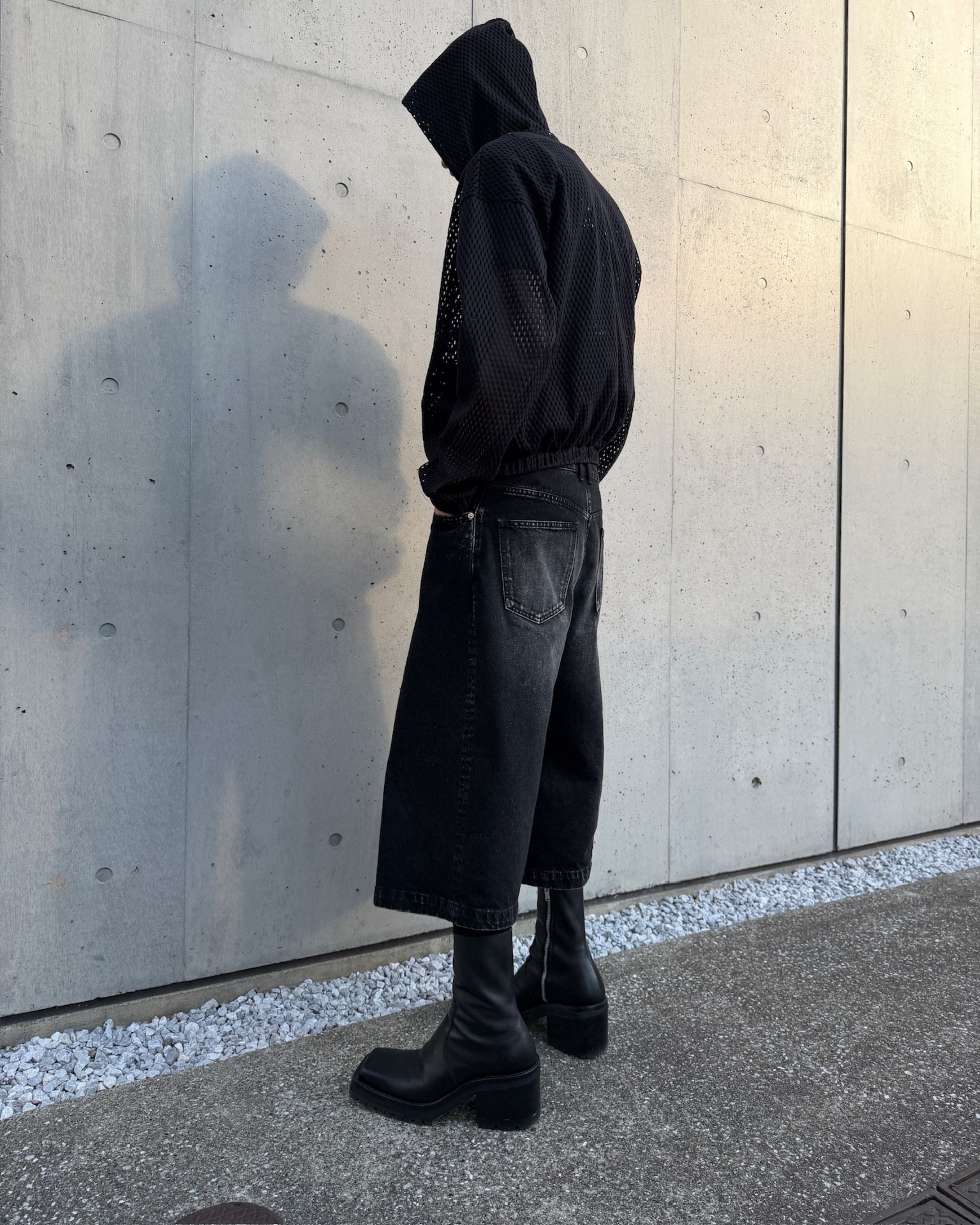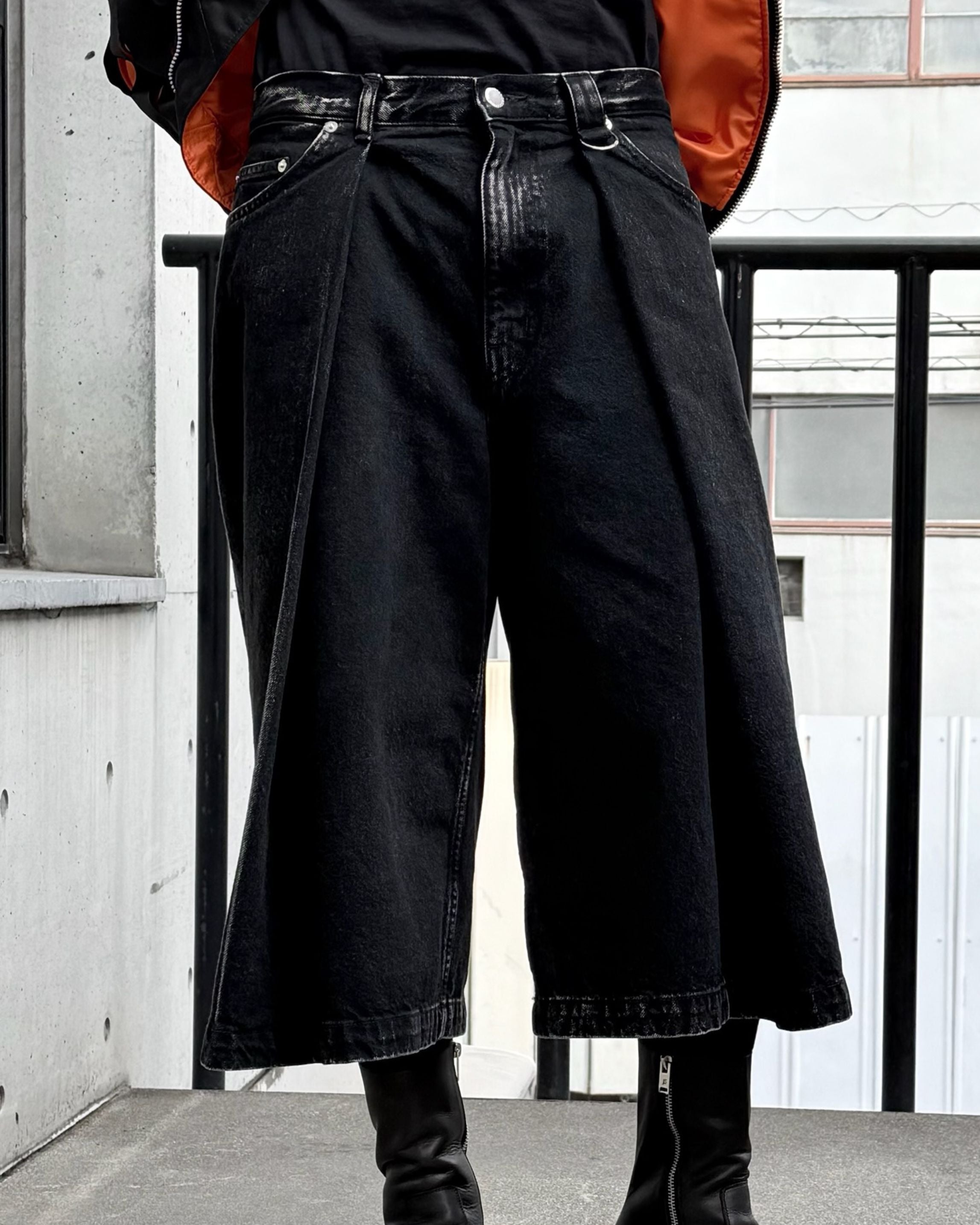 These denim shorts feature deep tucks reminiscent of hakama.