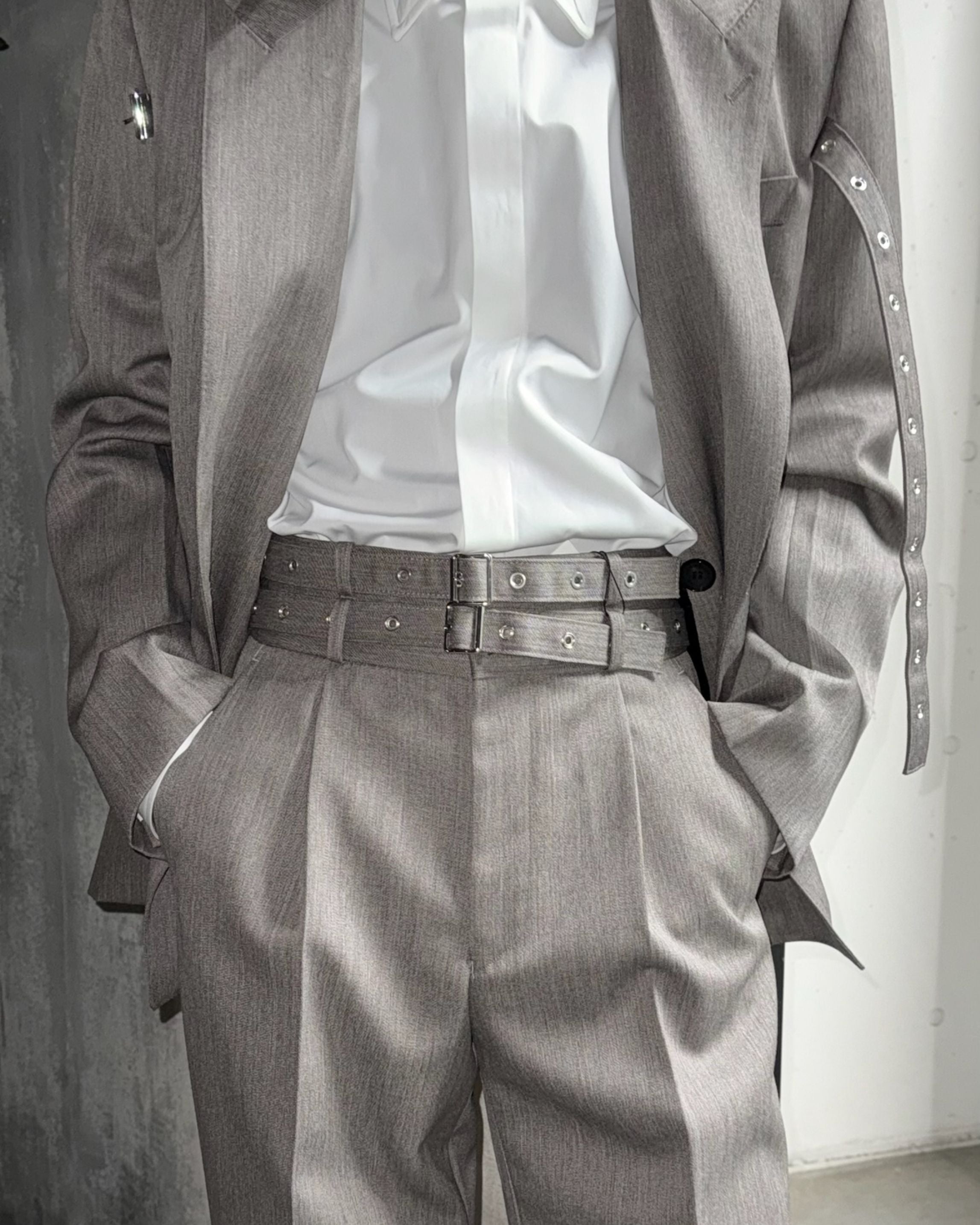 These double-belt trousers feature a two-tiered belt design reminiscent of a cummerbund.