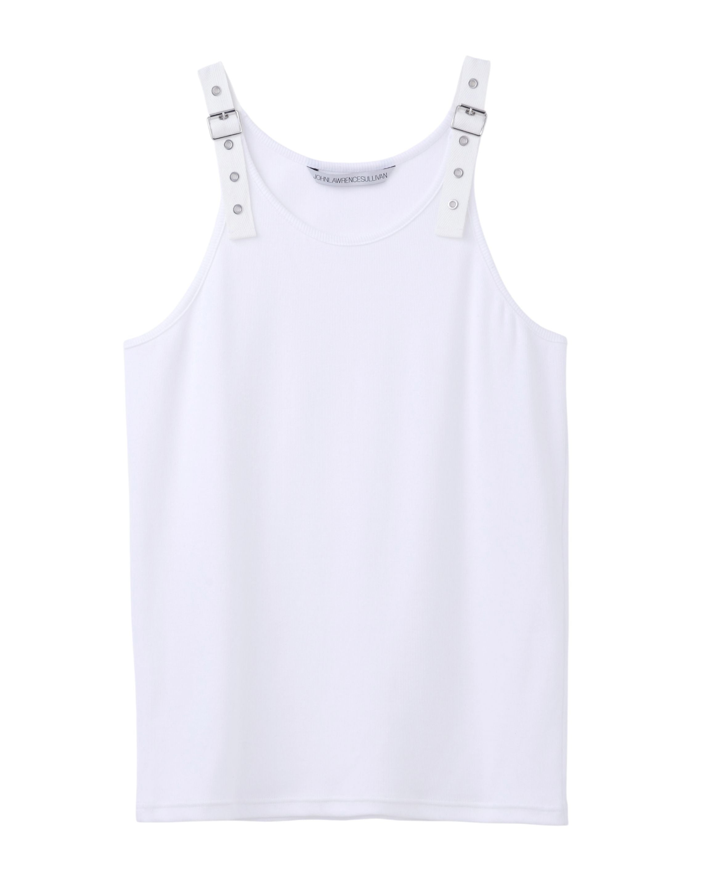 フロントショルダーにベルトストラップを配置したフェティッシュなデザインのリブタンクトップ。