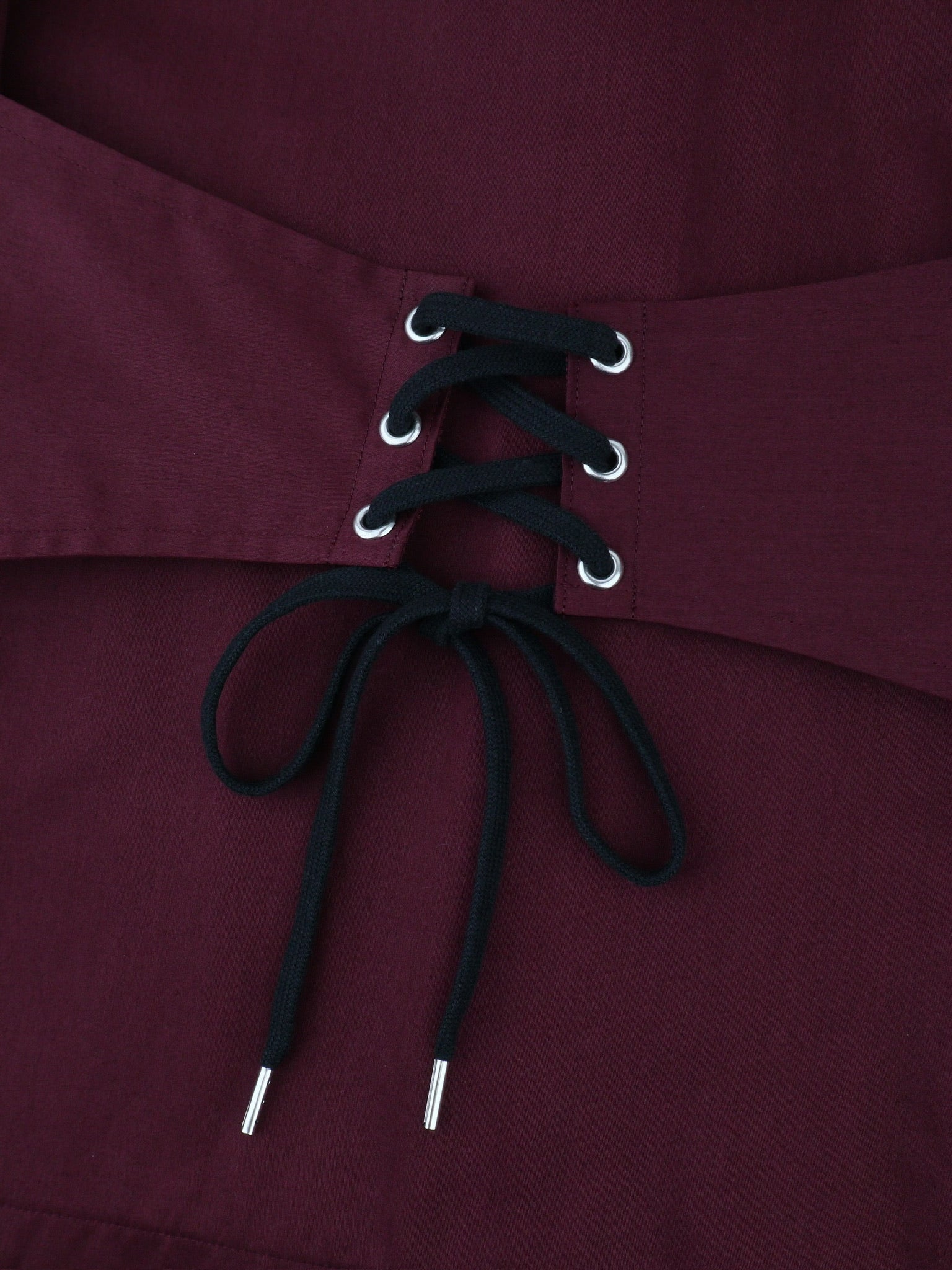 前細腹から背中にかけて伸びるレースアップディテールにより、ウエストシェイプの効いたフィットアンドフレアシルエットに。