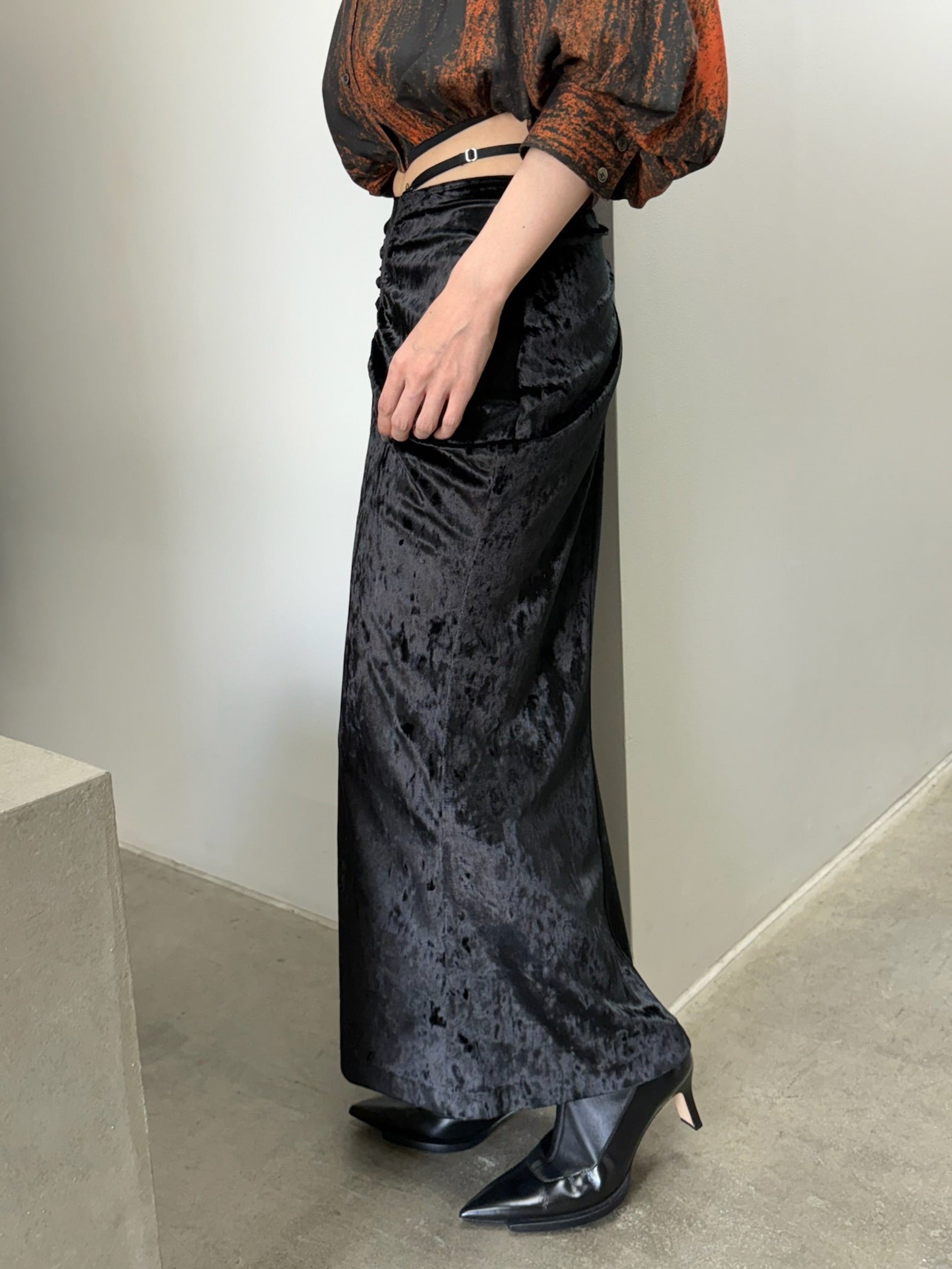 女性らしいシルエットを象徴するようなギャザータックラインが特徴的。ミモレ丈のフィットアンドフレアシルエット。