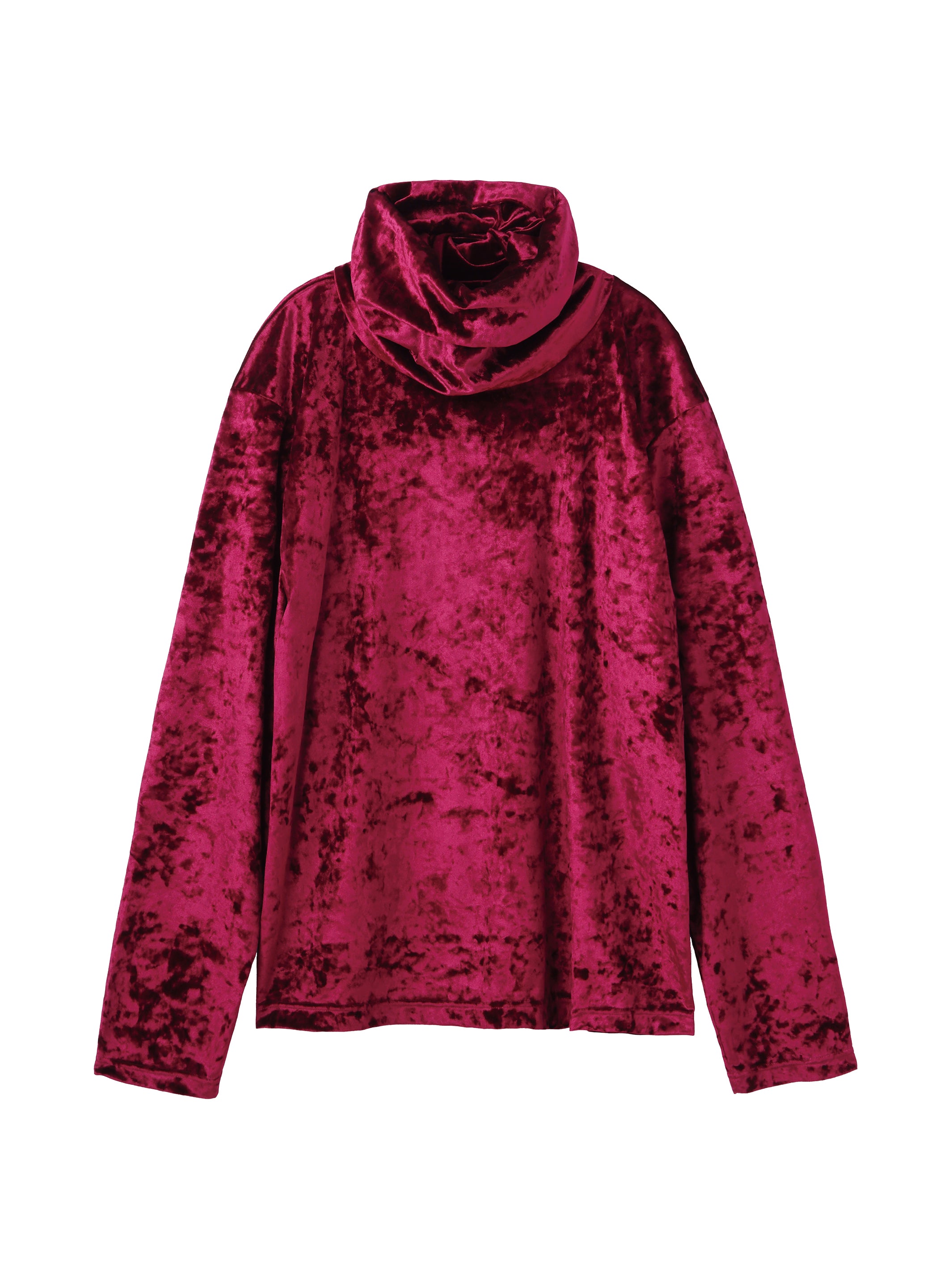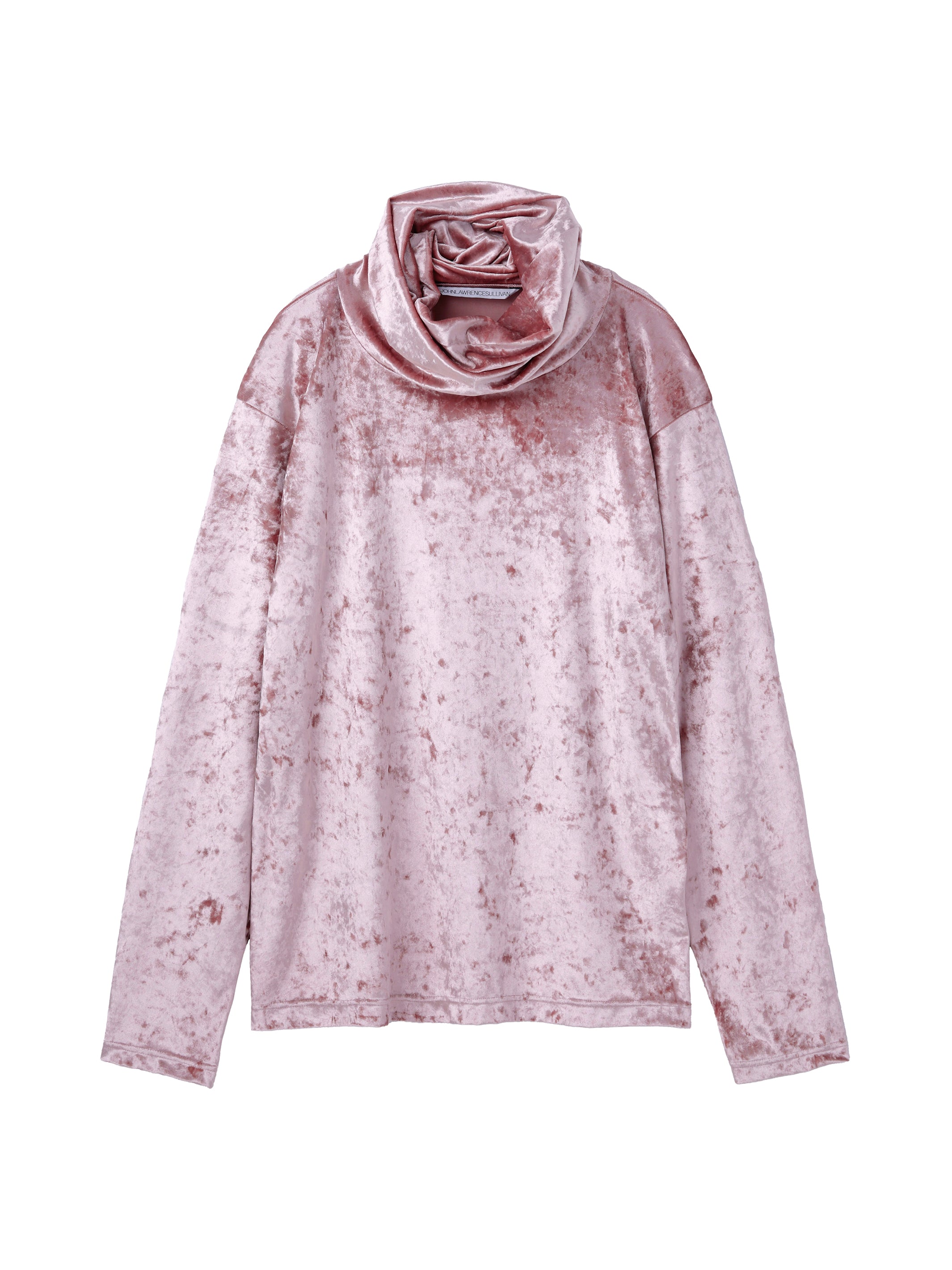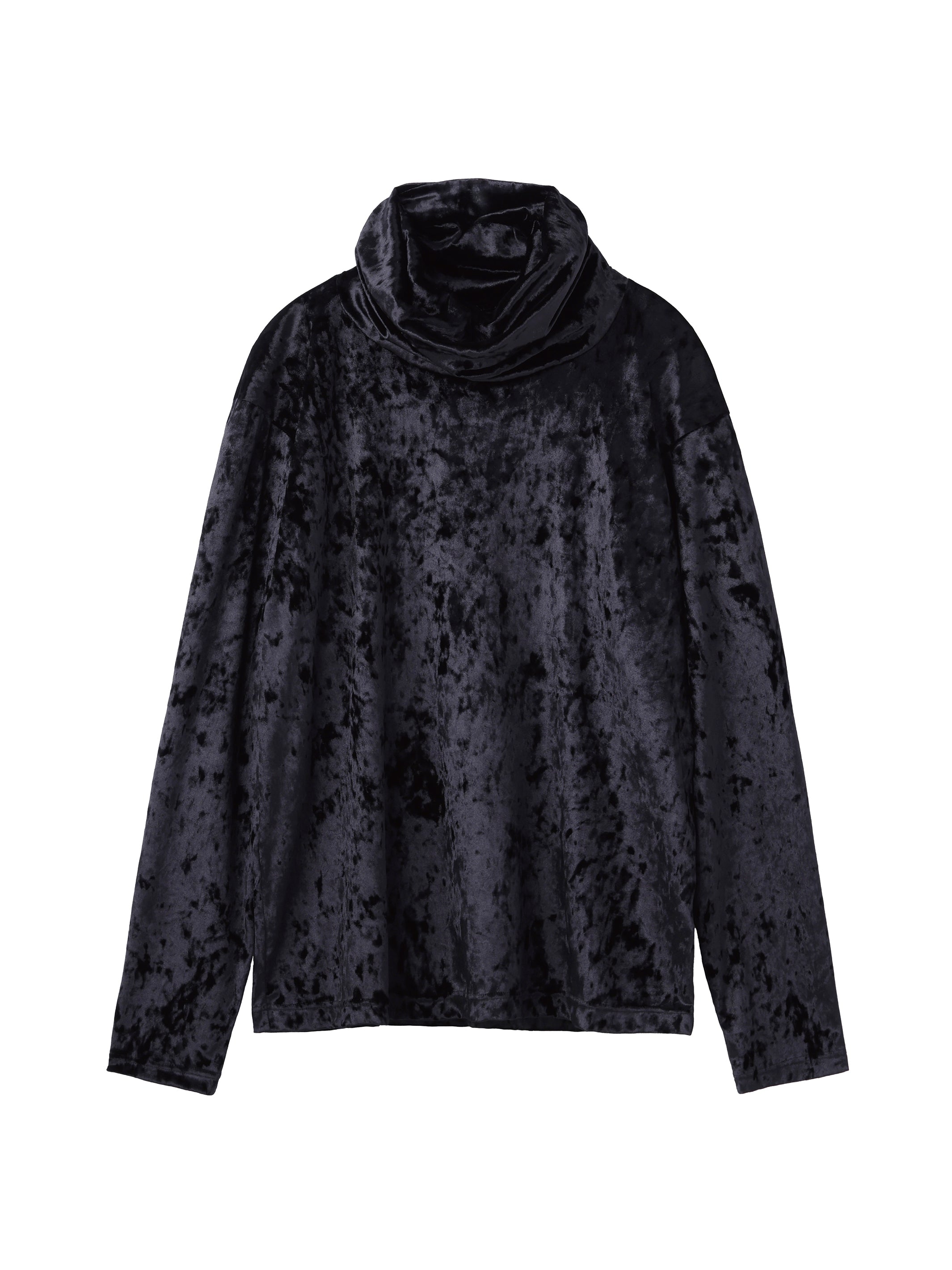 テーラードの様に、肩線を後ろへ流した立体的な構造が特徴のワイドタートルネックトップ。ゆったりとしたオーバーサイズシルエット。