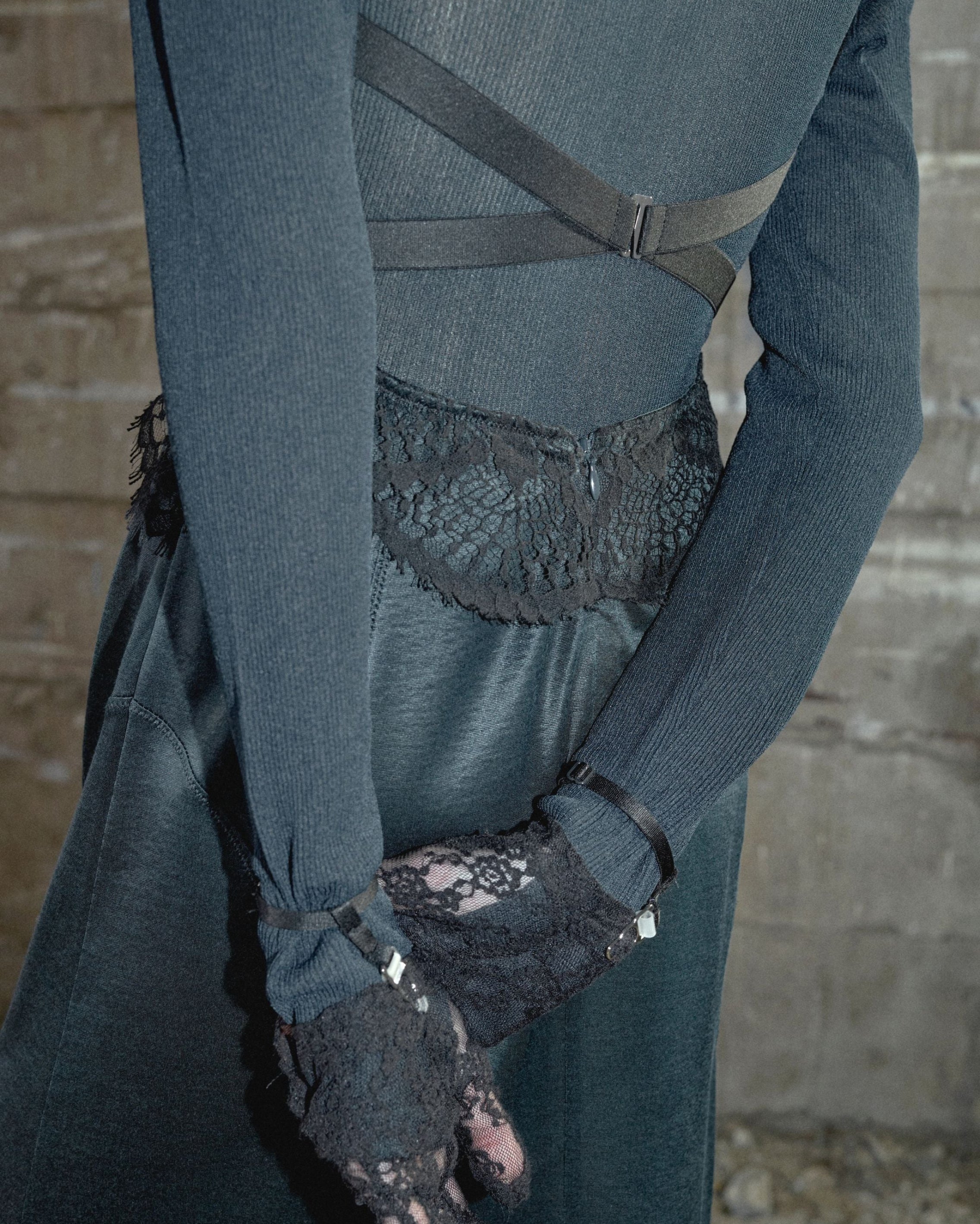 A slip dress featuring houndstooth stitching reminiscent of underwear and stretch straps running down the boldly open back.