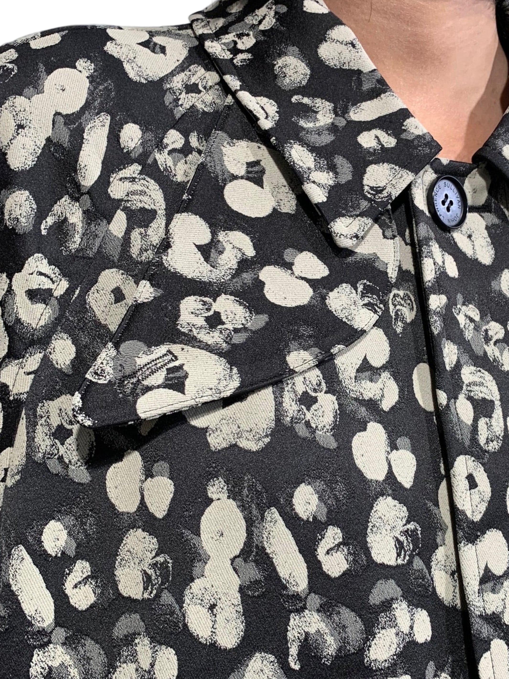 Uses a jacquard fabric reminiscent of a leopard pattern and floral pattern. The first place with a beautiful drape with a back yoke gathering.