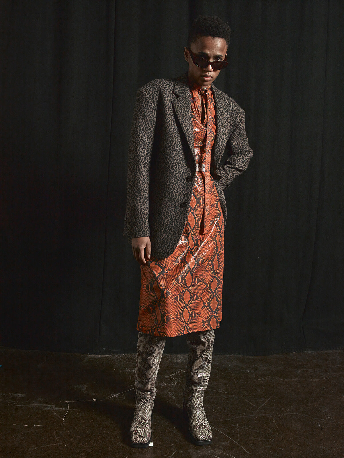 襟元にベルトディテールが施されたフェティッシュなデザインのパイソン柄ドレス。