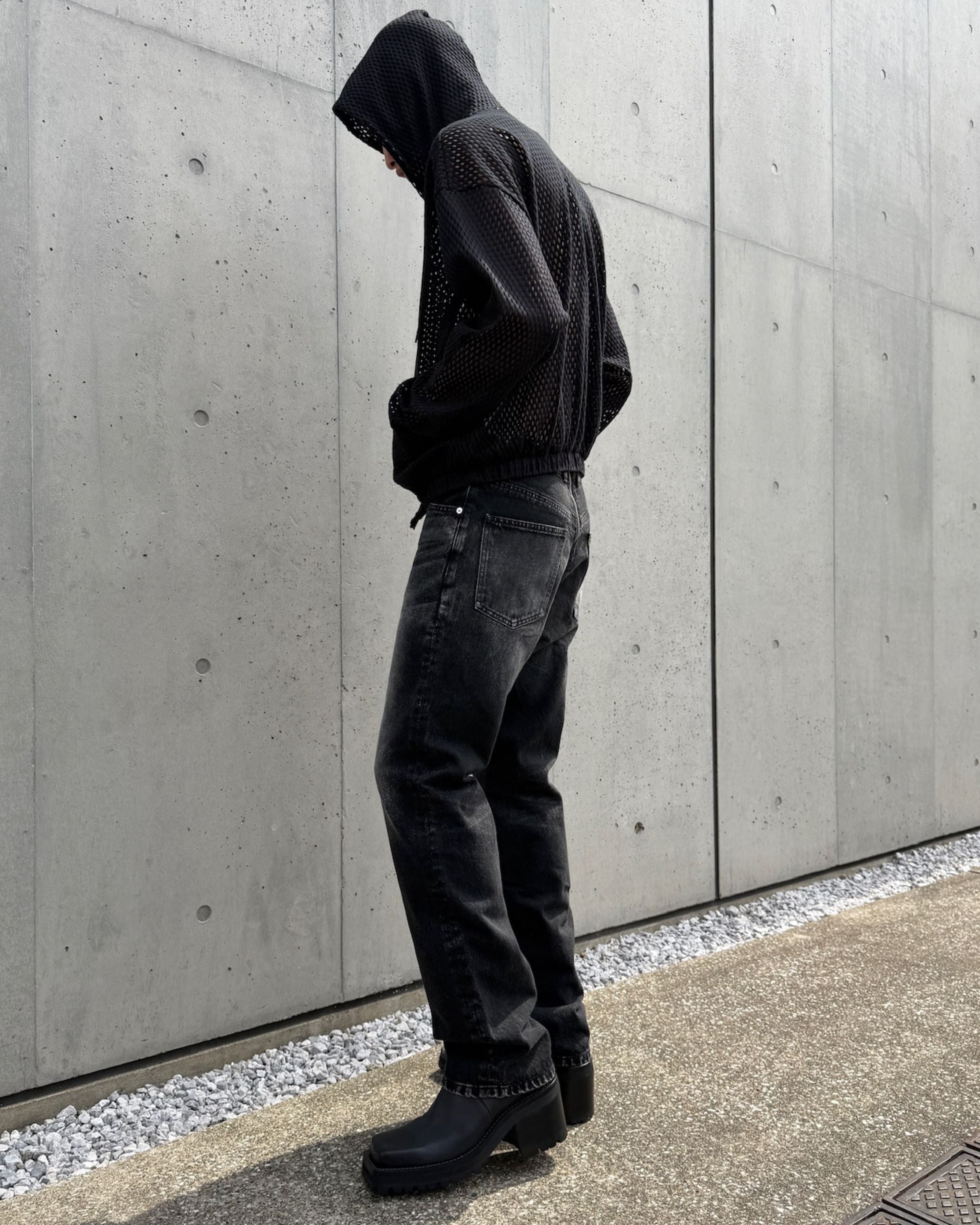 ジップで左右がセパレートでき、2色を組み合わせてバイカラーデニムパンツとして、またルックのようにLAMBSKIN WRAPAROUND ZIP PANTS とのドッキングカスタムも可能。