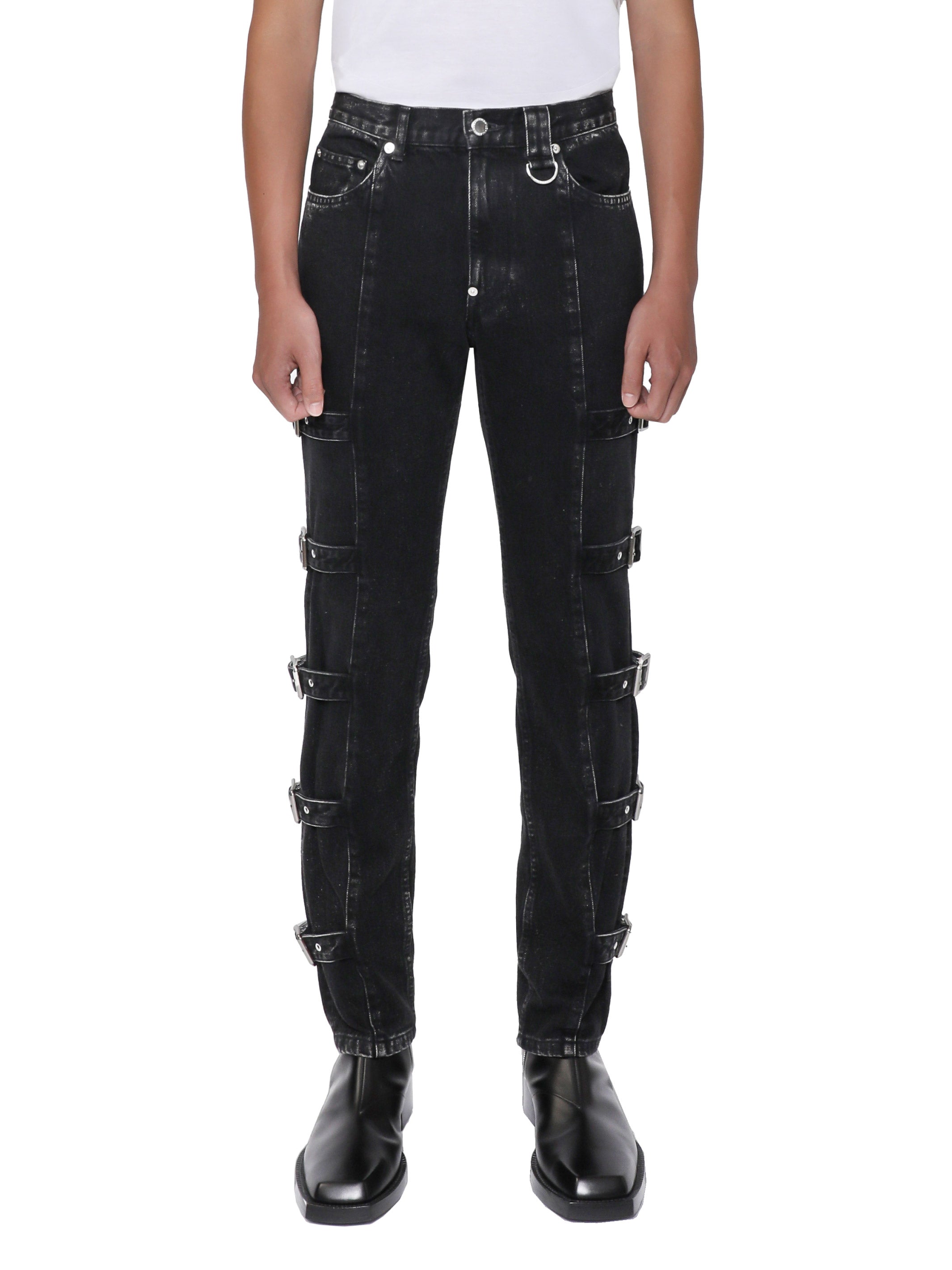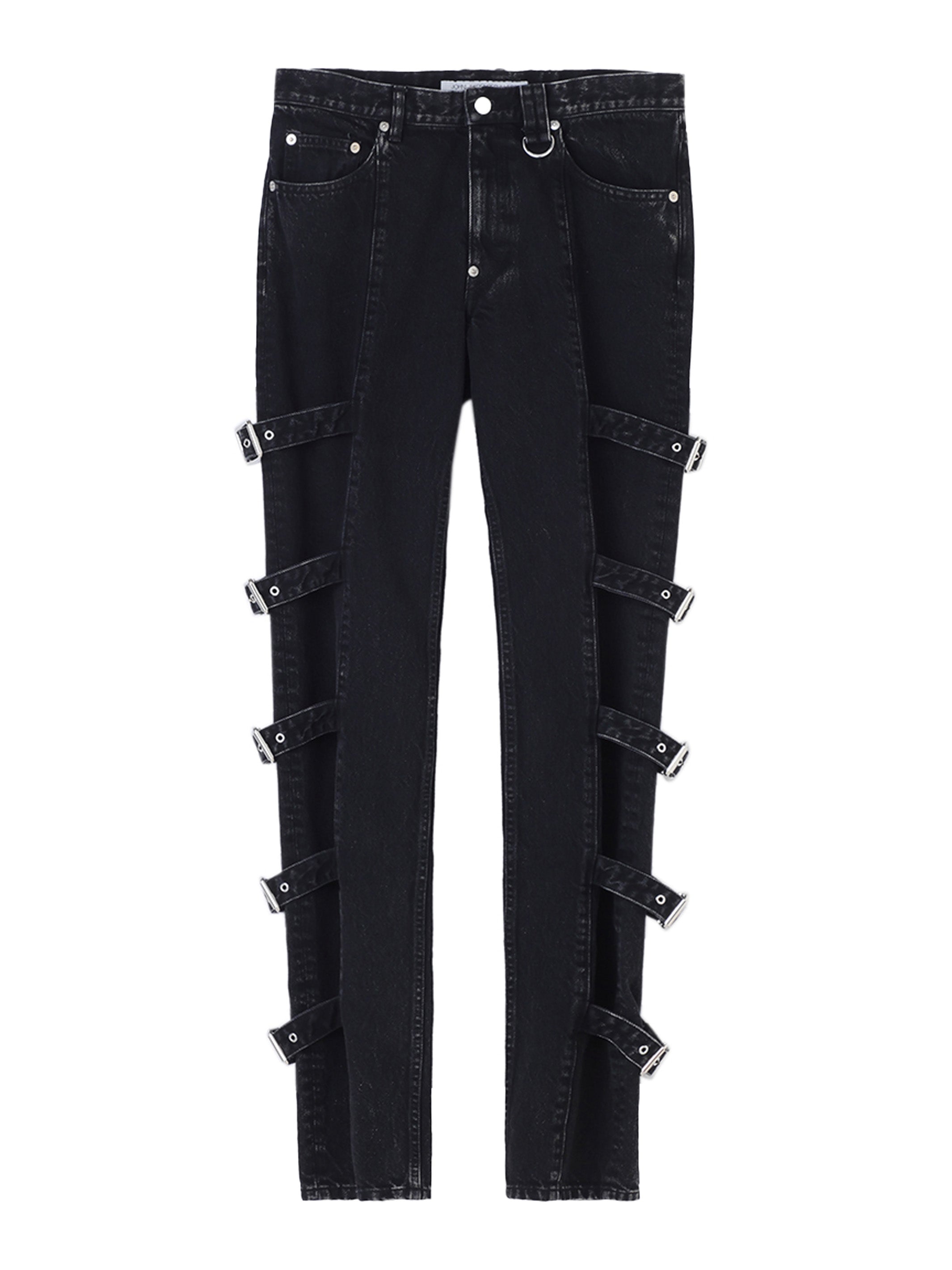 ウォッシュドデニム素材のボンデージパンツ。サイドについたベルトで足幅の調節が可能。