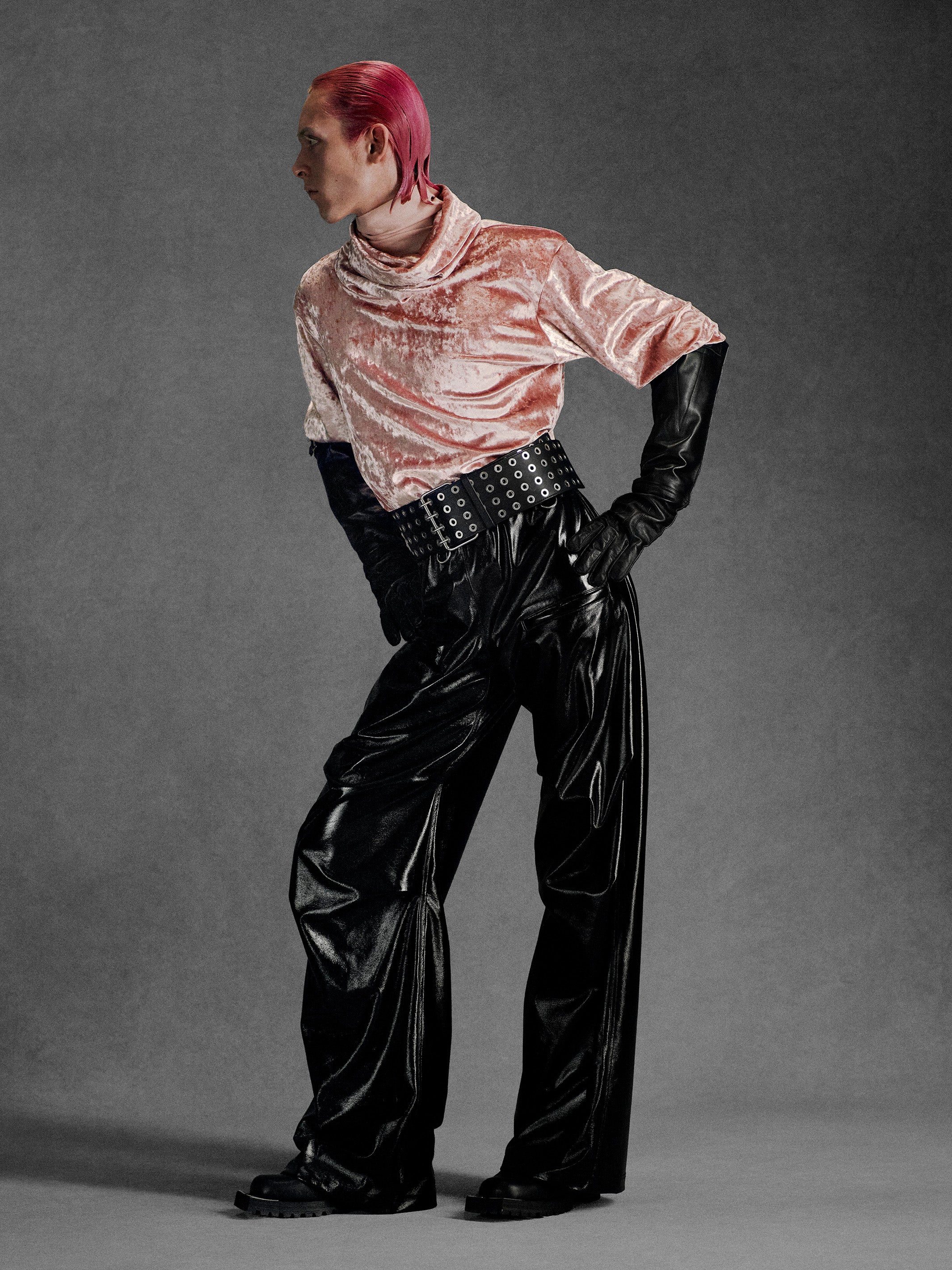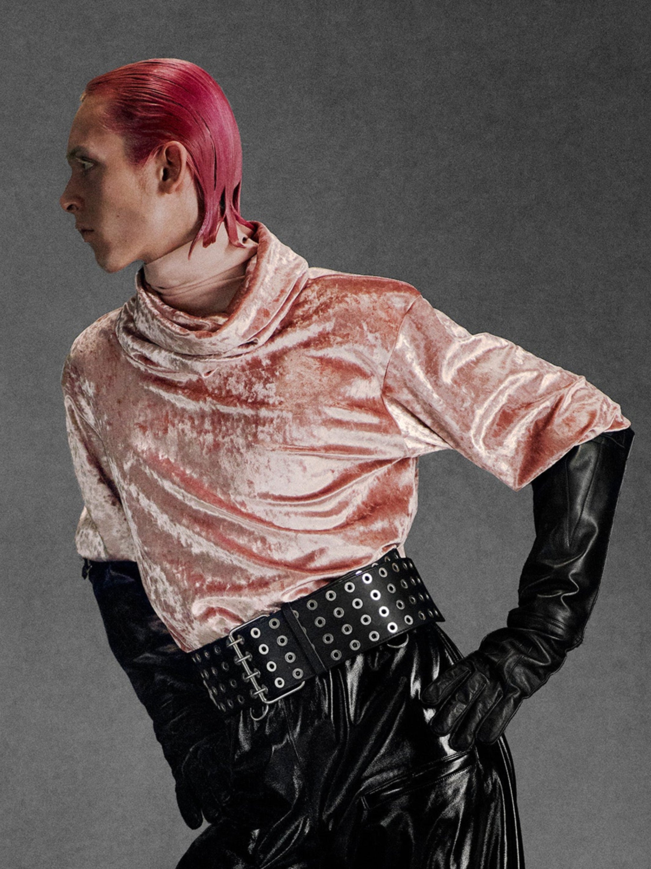 テーラードの様に、肩線を後ろへ流した立体的な構造が特徴のワイドタートルネックトップ。ゆったりとしたオーバーサイズシルエット。