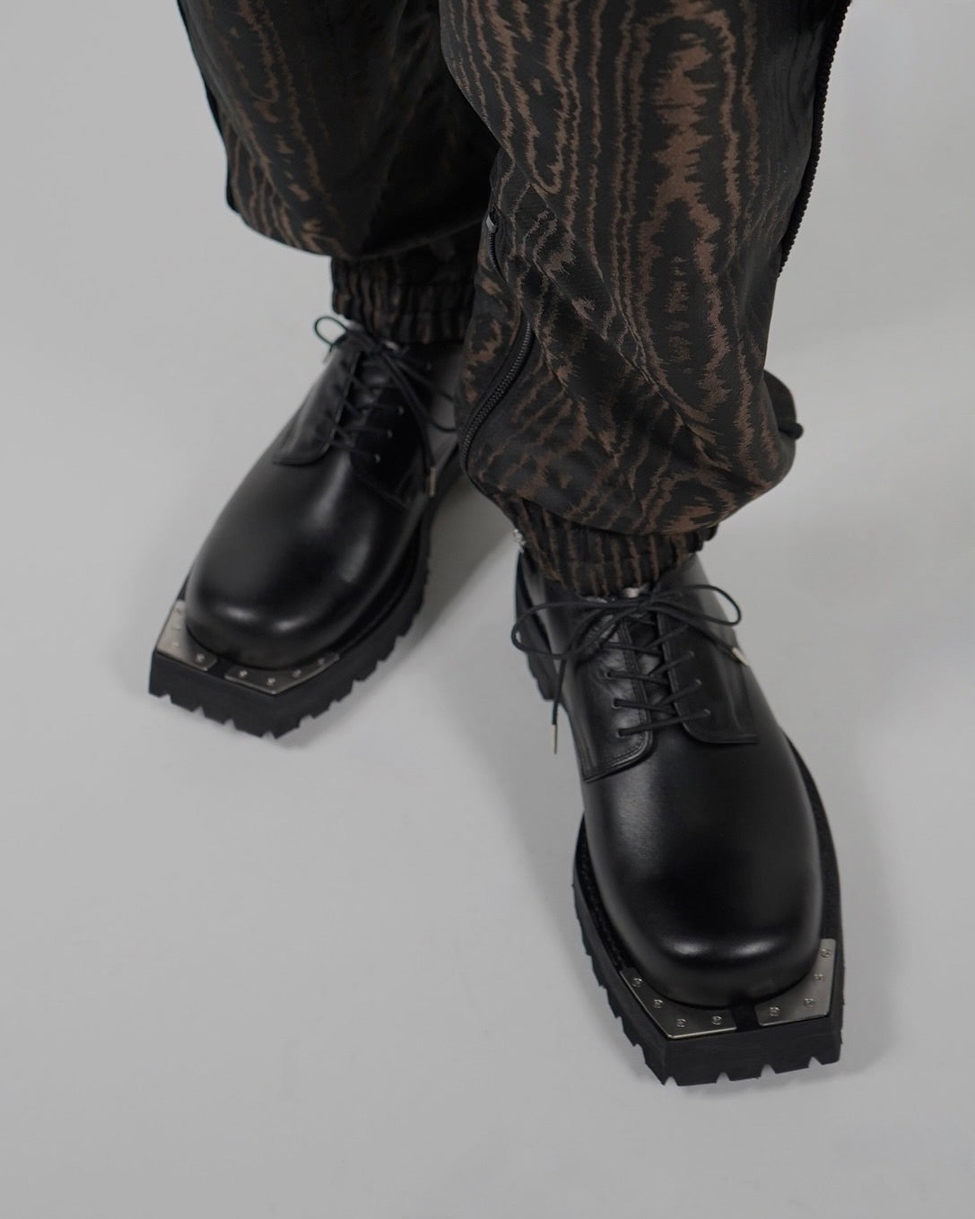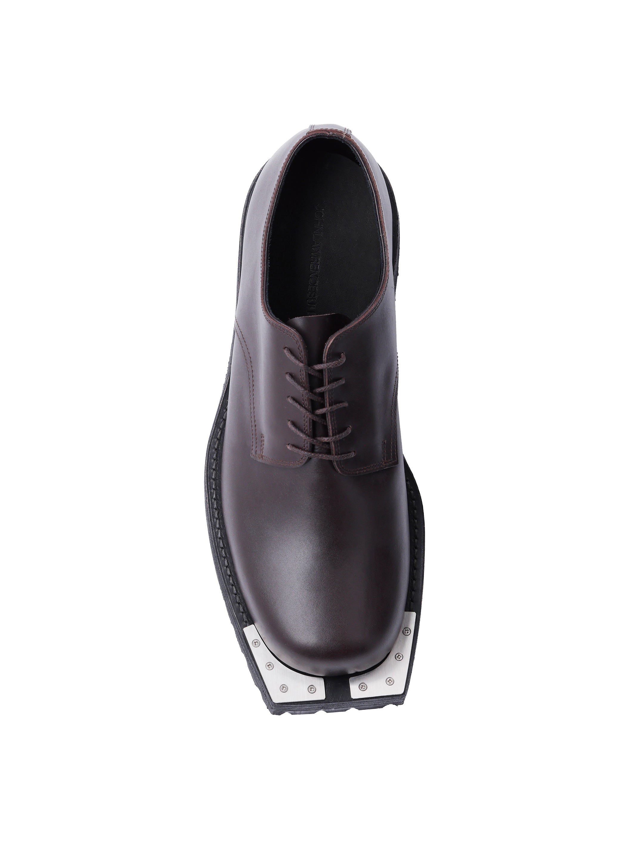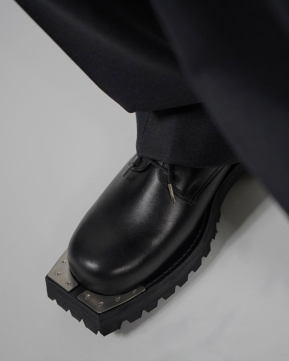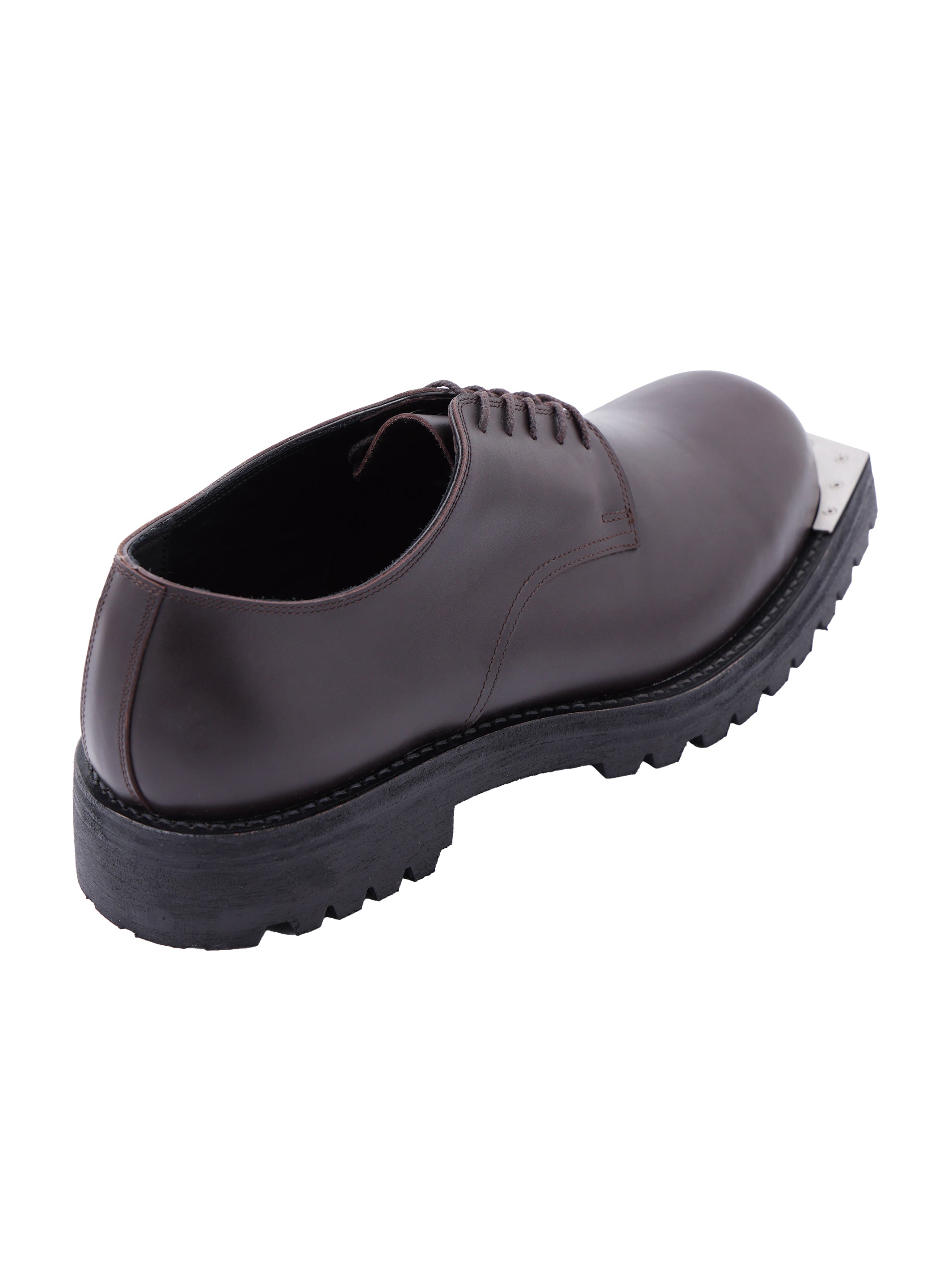 インパクトのあるメタルパーツをトゥに施し、無骨でありながらもモードな印象のポストマンシューズ。