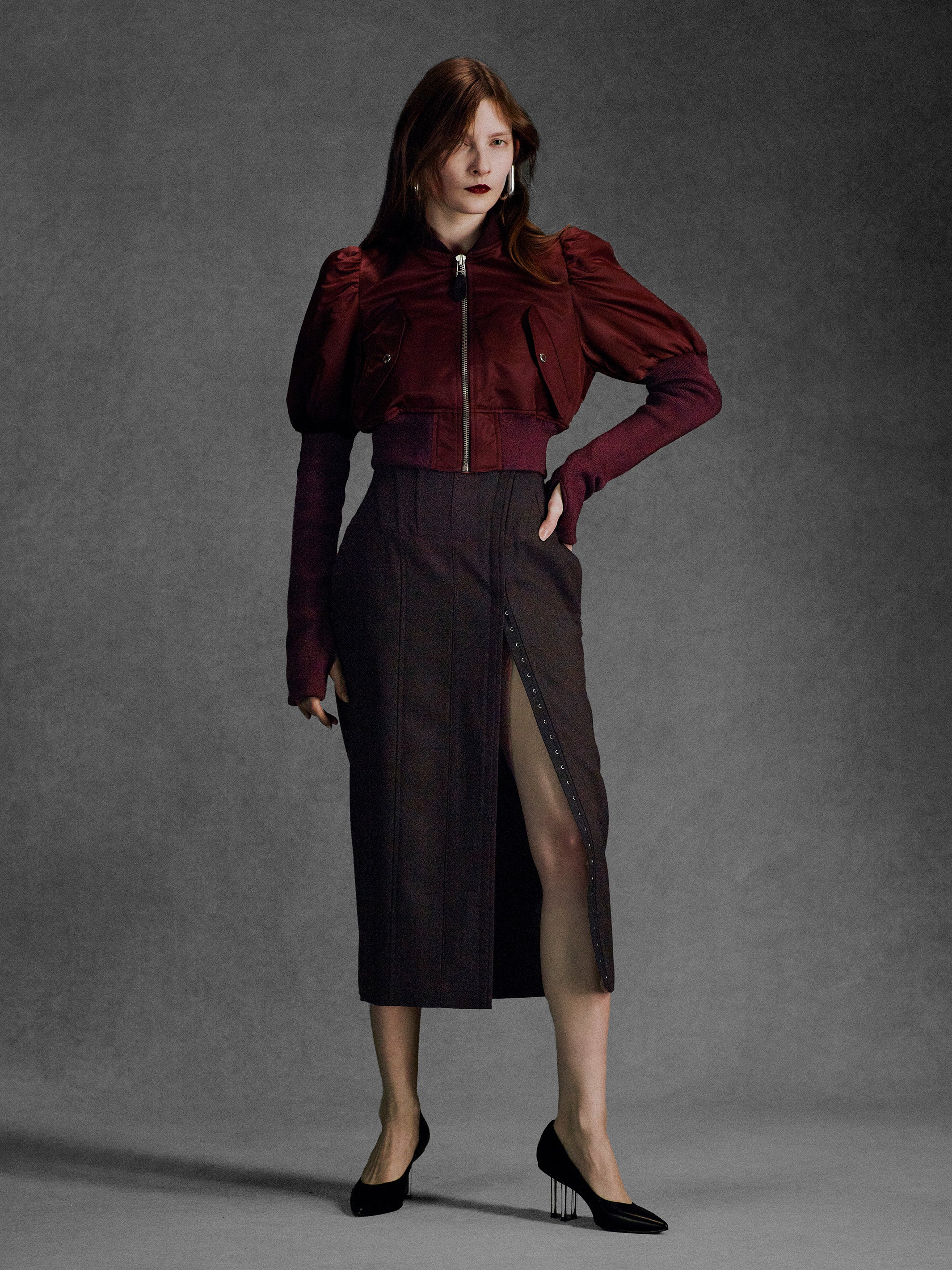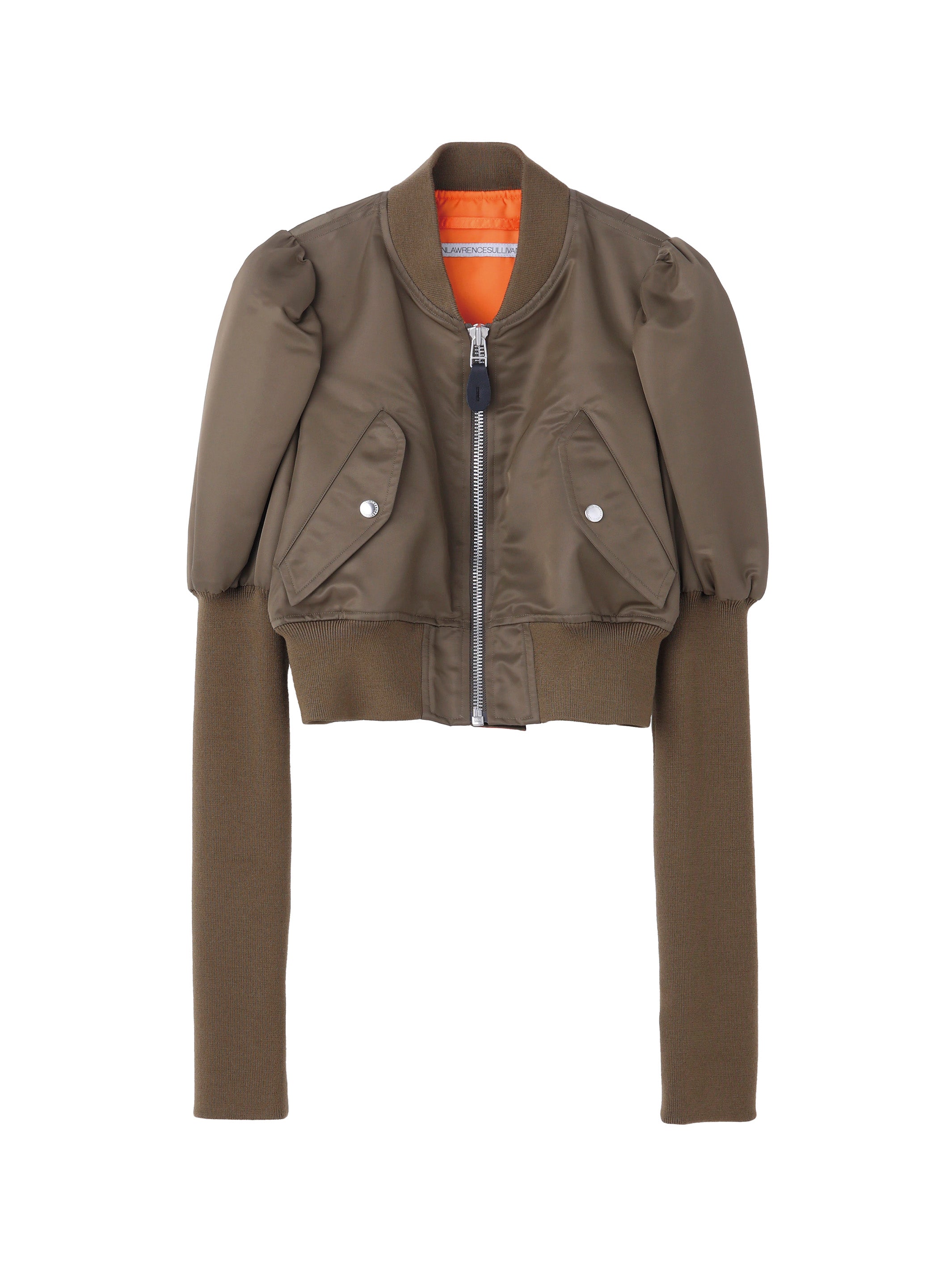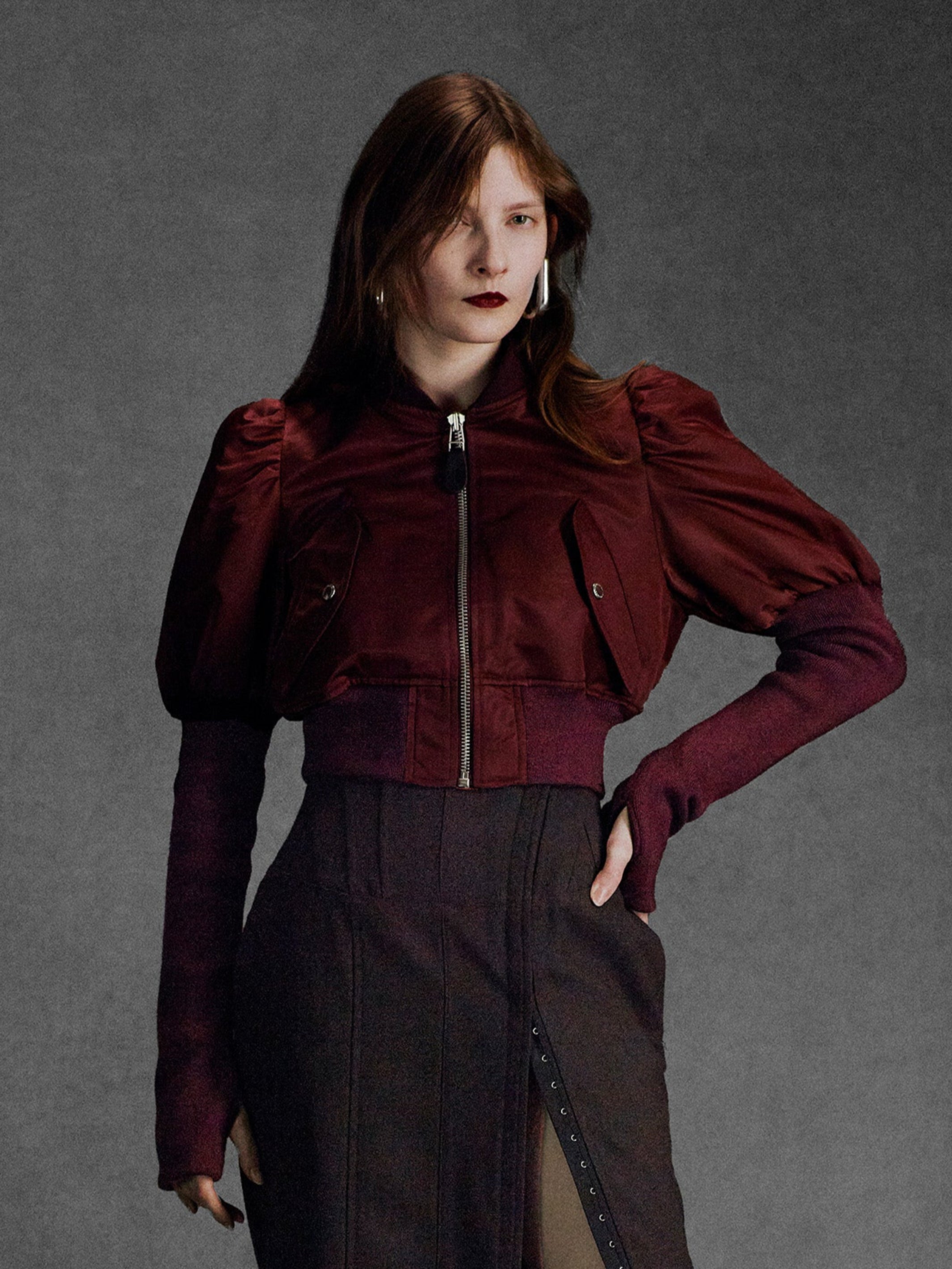 クロップド丈の身頃にドレス袖のようなボリュームのあるパフスリーブが特徴的なボンバージャケット。