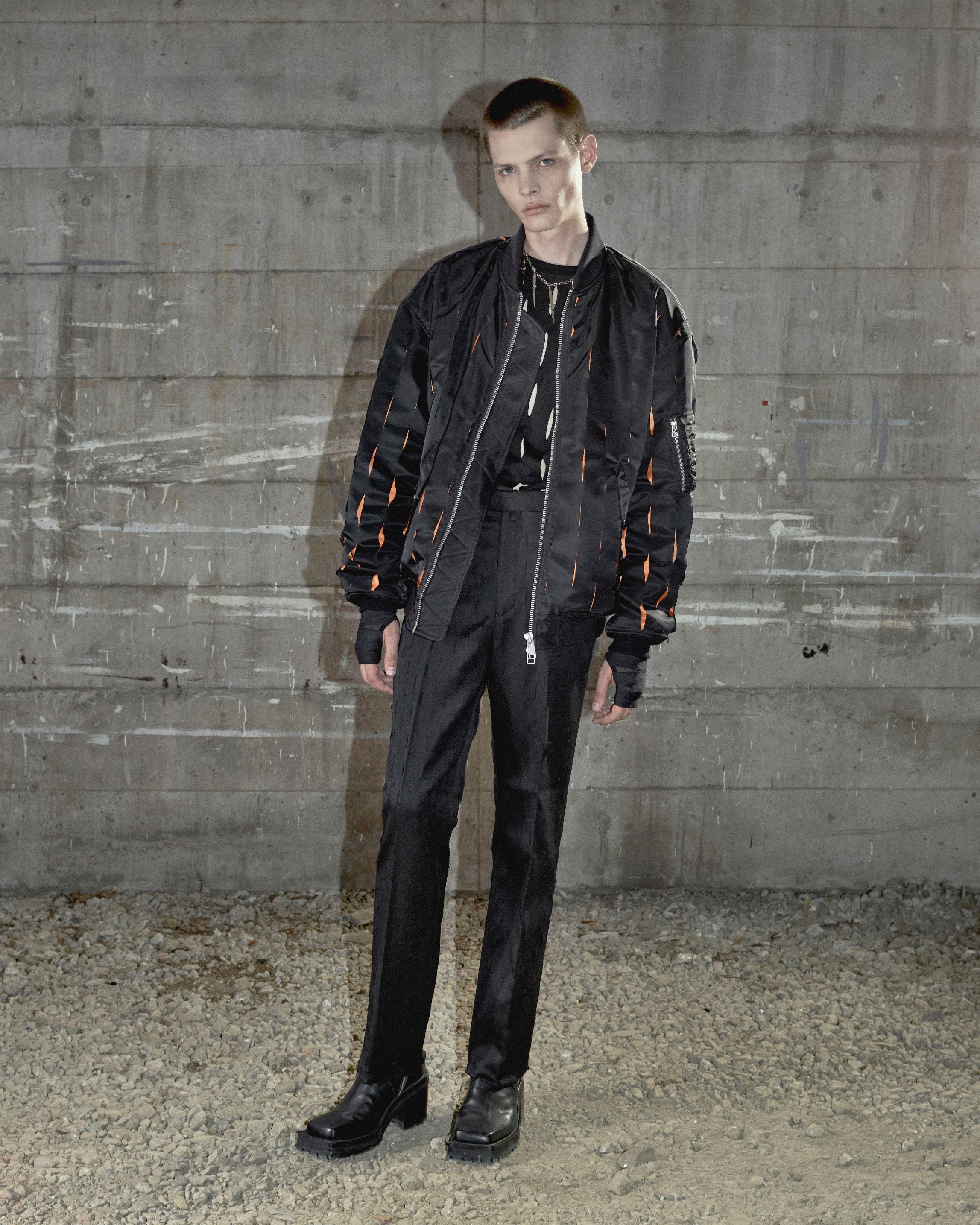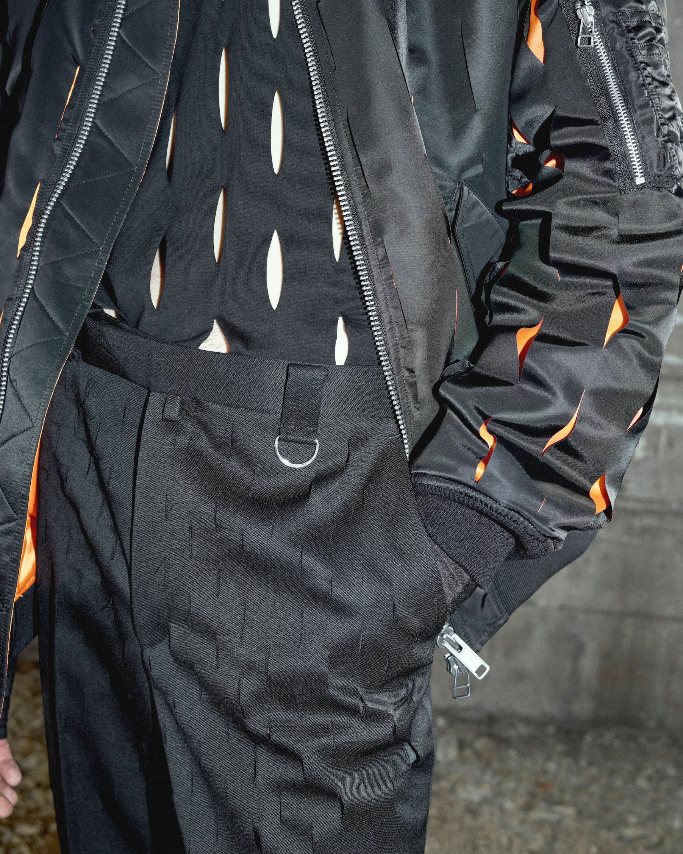 キャンバスを切り裂き、絵画に”空間”を持ち込んだ、アルゼンチン出身の美術家ルチオ・フォンタナから着想を得た、ナイフカットストレートトラウザーズ。