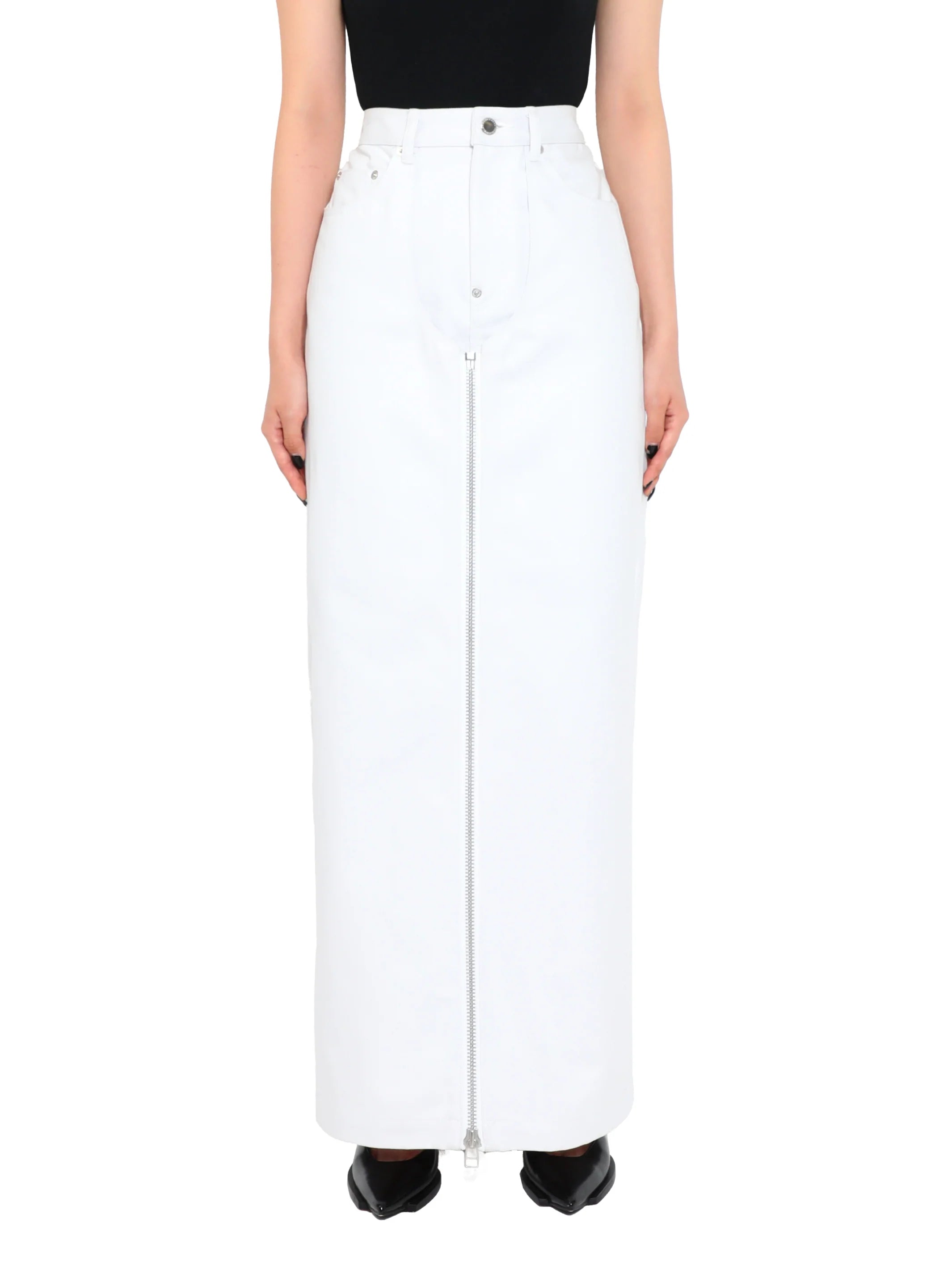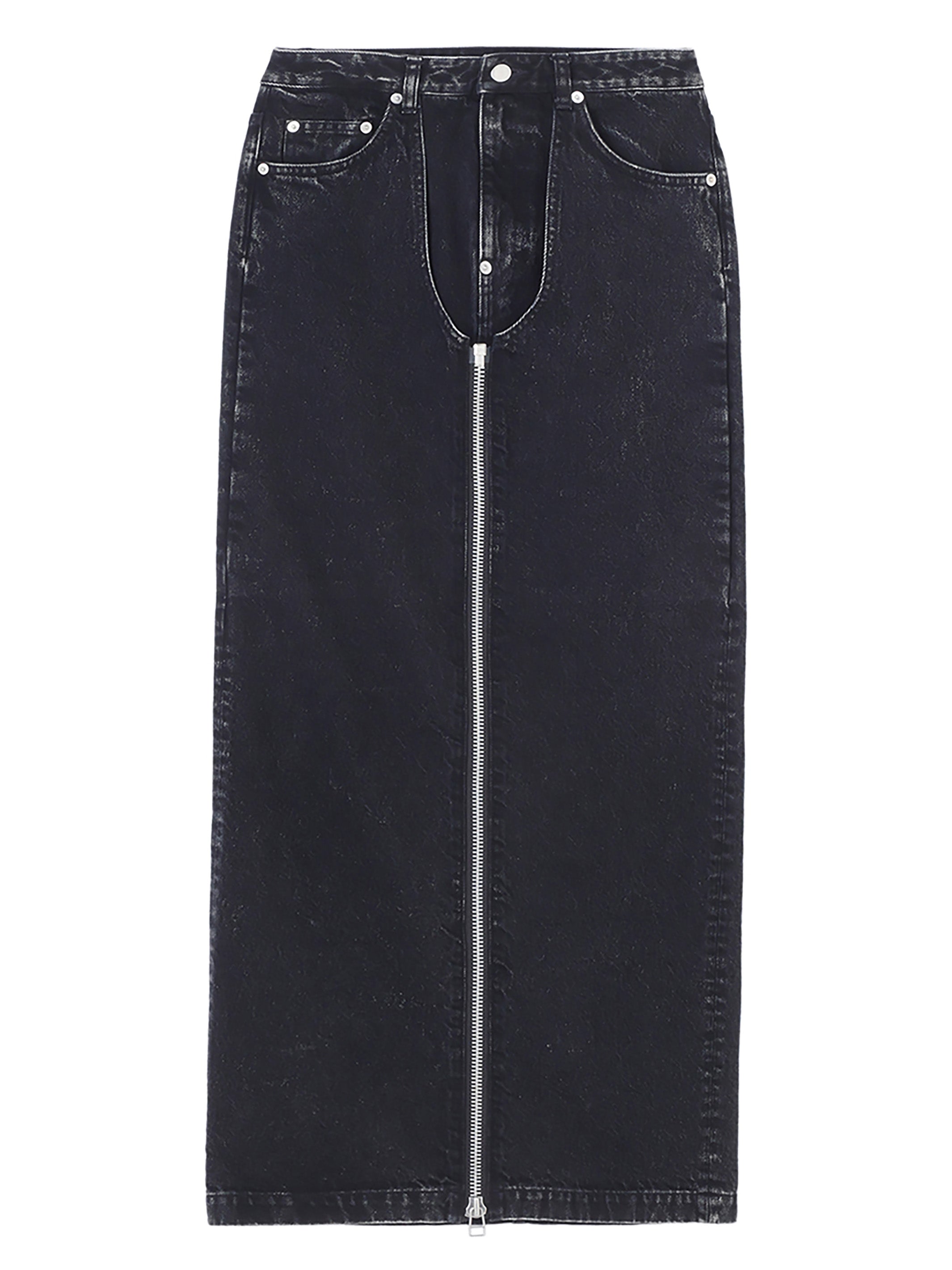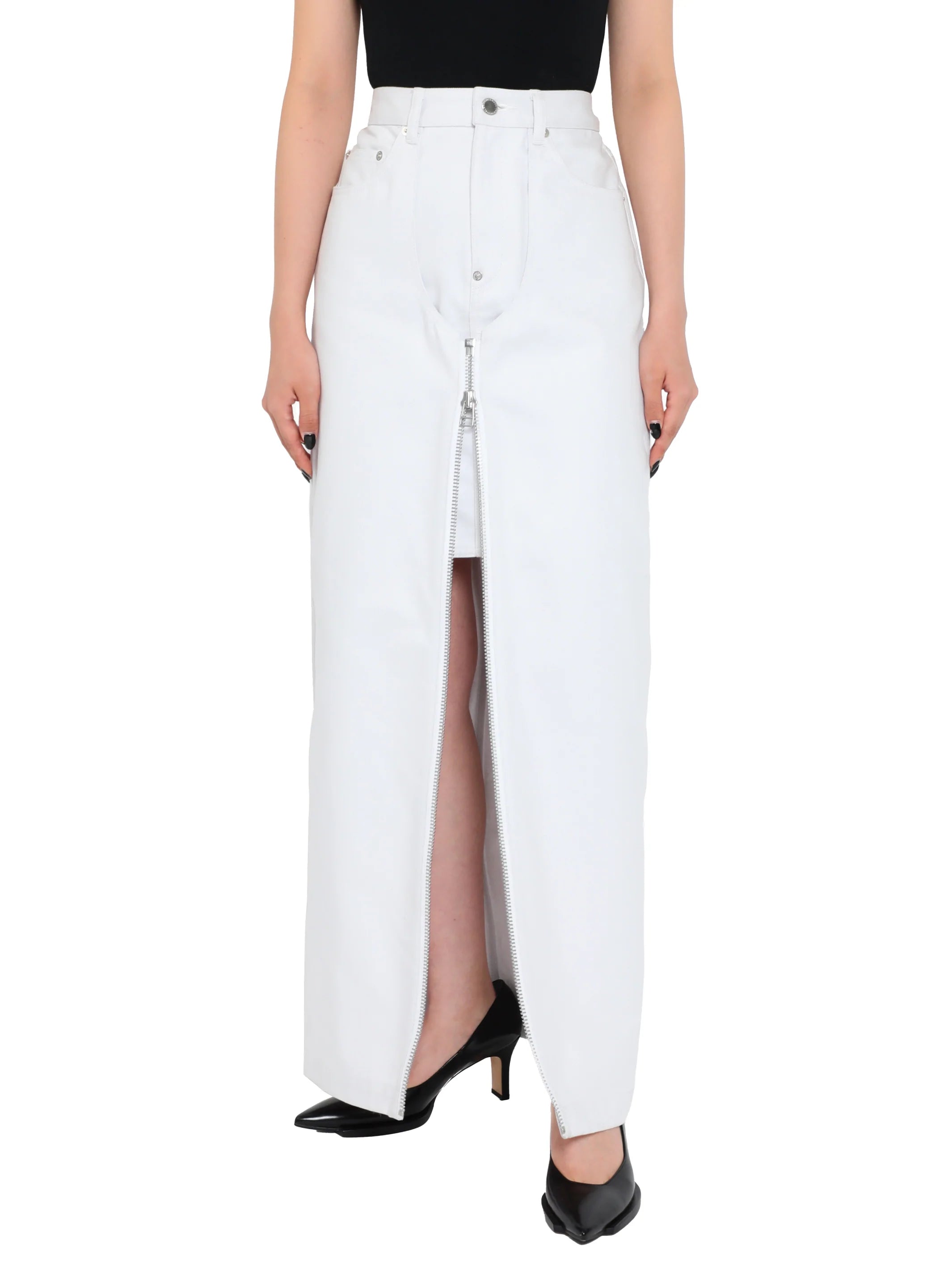 脚部の保護に使用するチャップスのディテールを取り入れたデニムロングスカート。フロントのジップを開けることで中に膝上丈のミニスカートが覗くレイヤードデザイン。