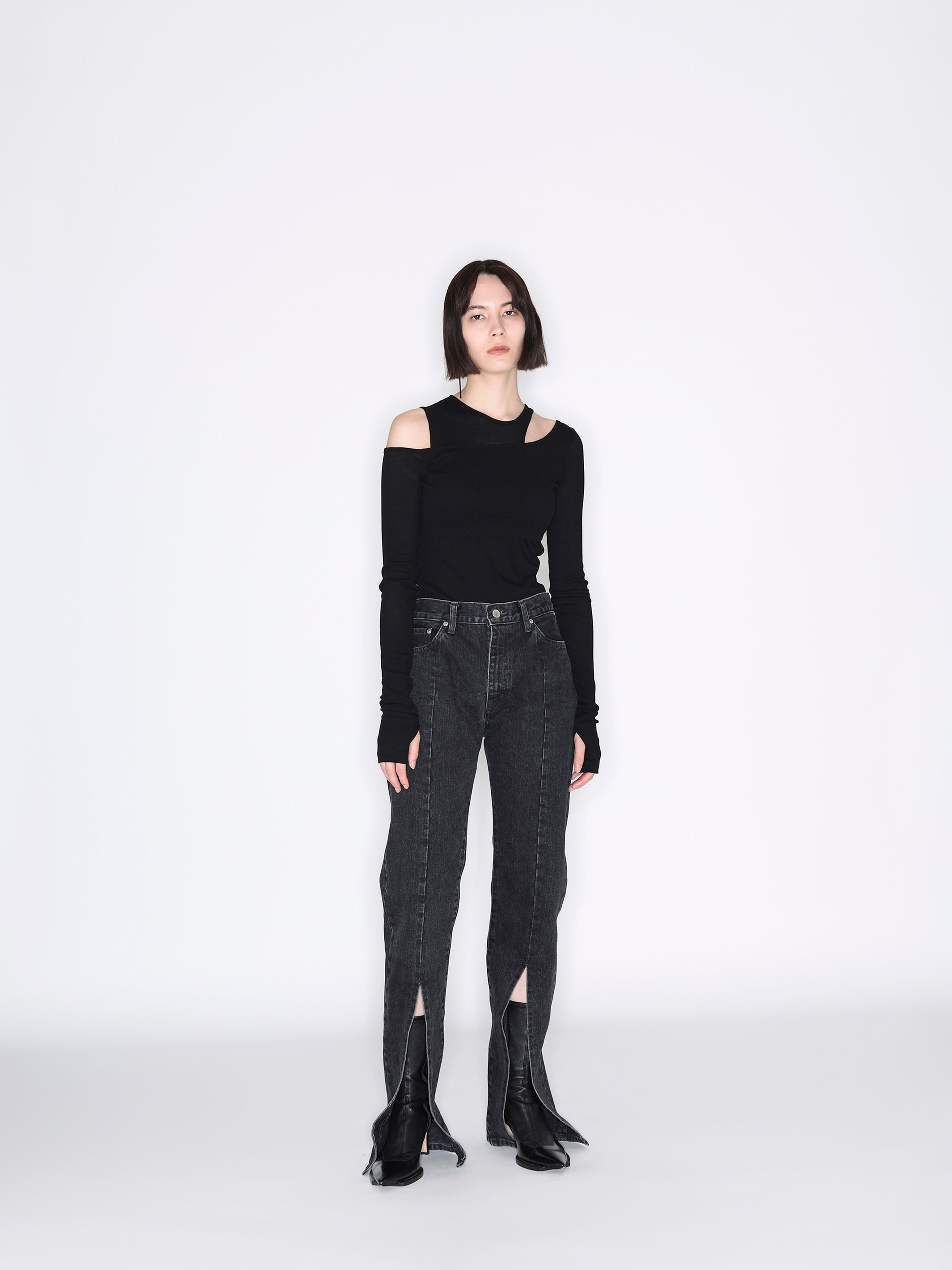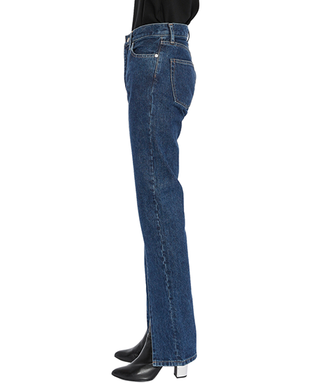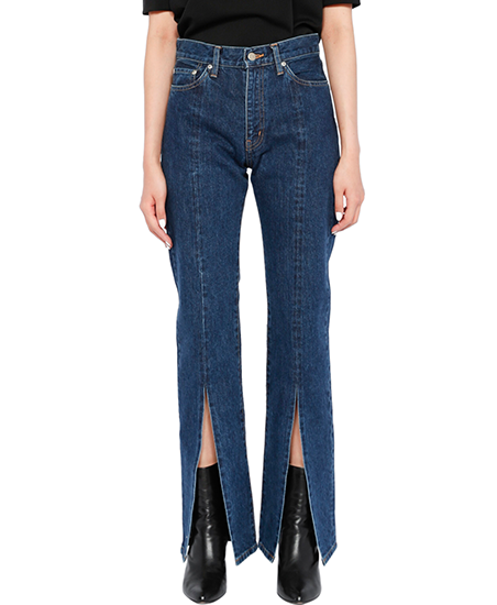 ウォッシュドデニムのフロントにスリットを入れ、裾にかけて自然と広がるデニムパンツ。スリット部分にはセルビッジを使用。