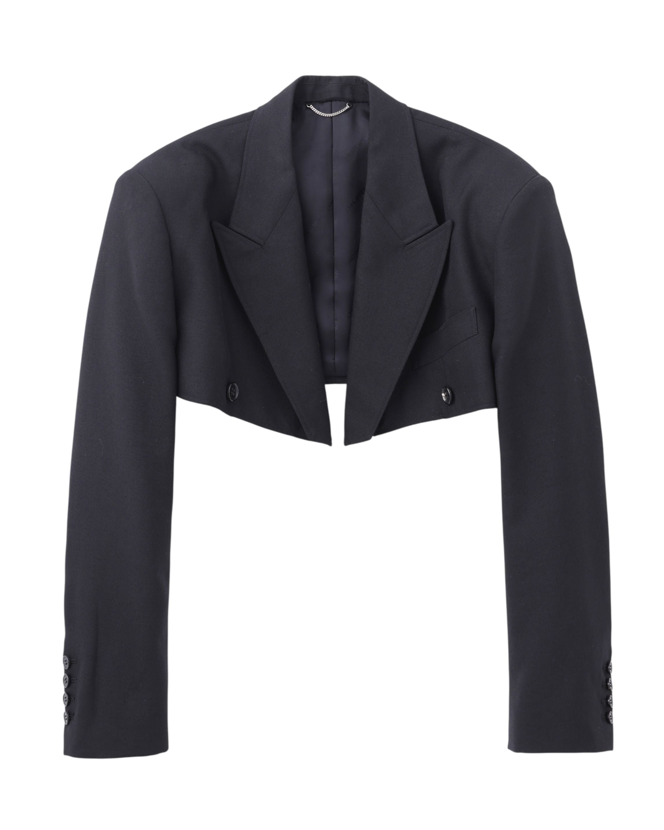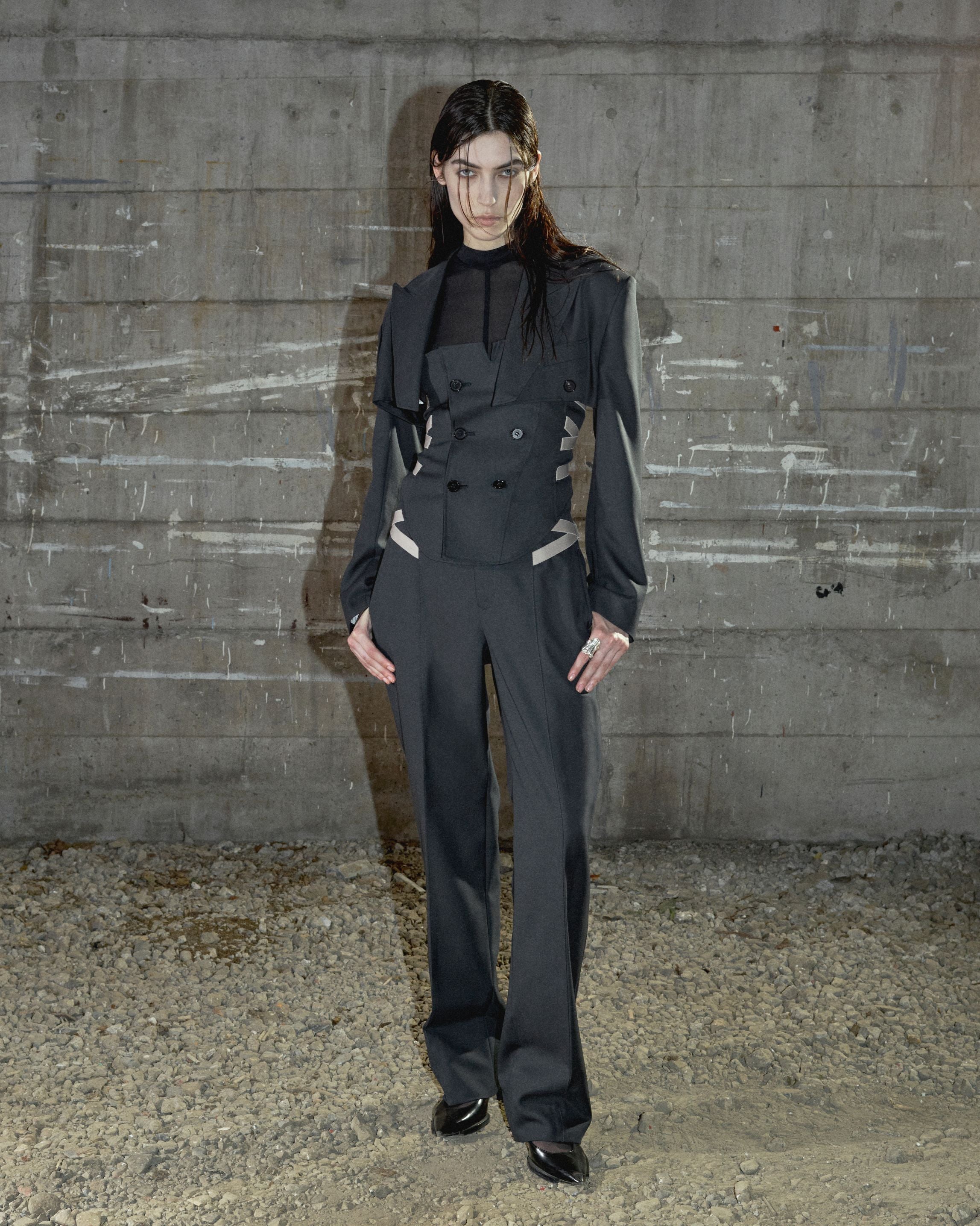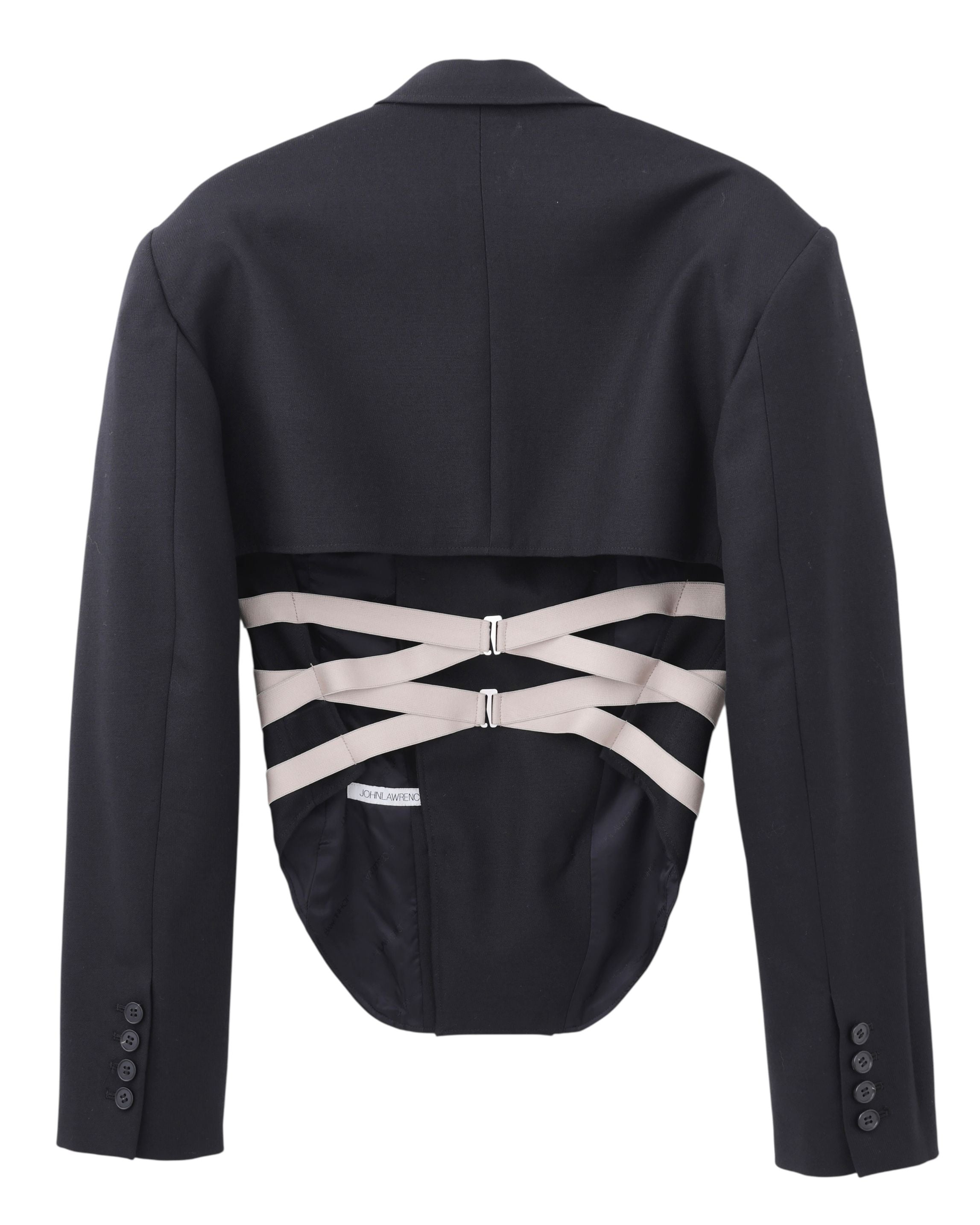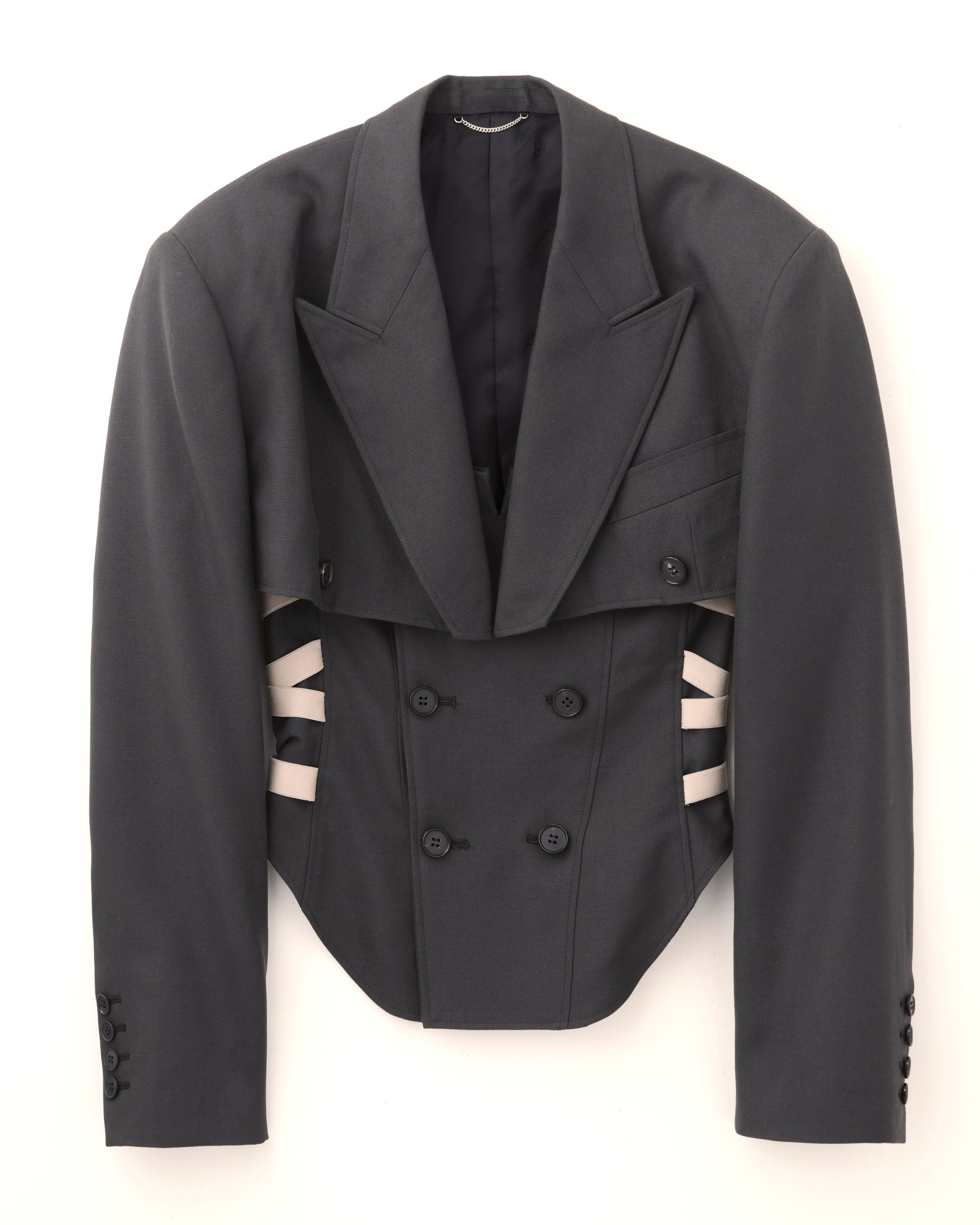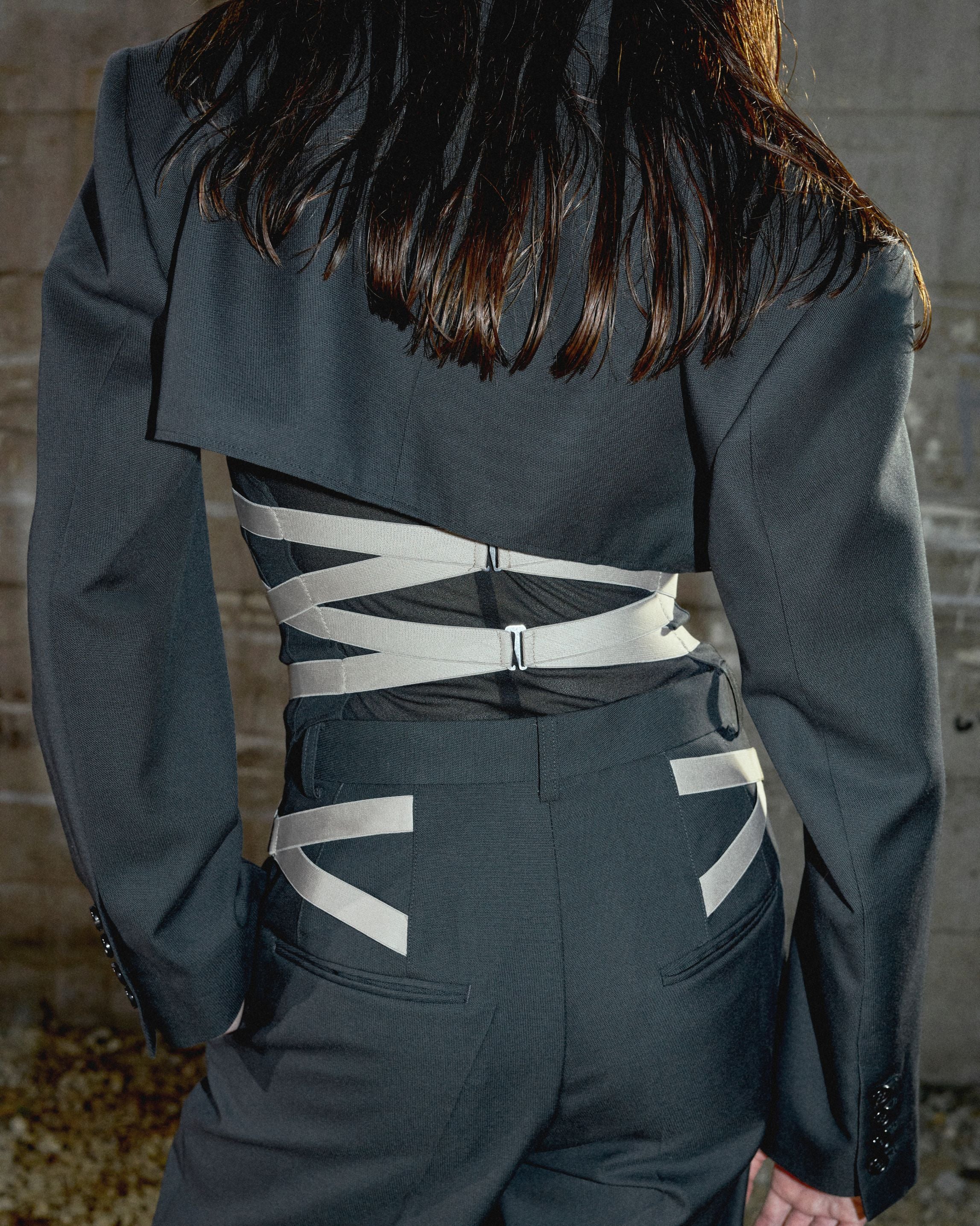 バストラインで大胆にカットしたクロップド丈のジャケットと、ボディをランジェリーコルセットへと落とし込んだデザイン。