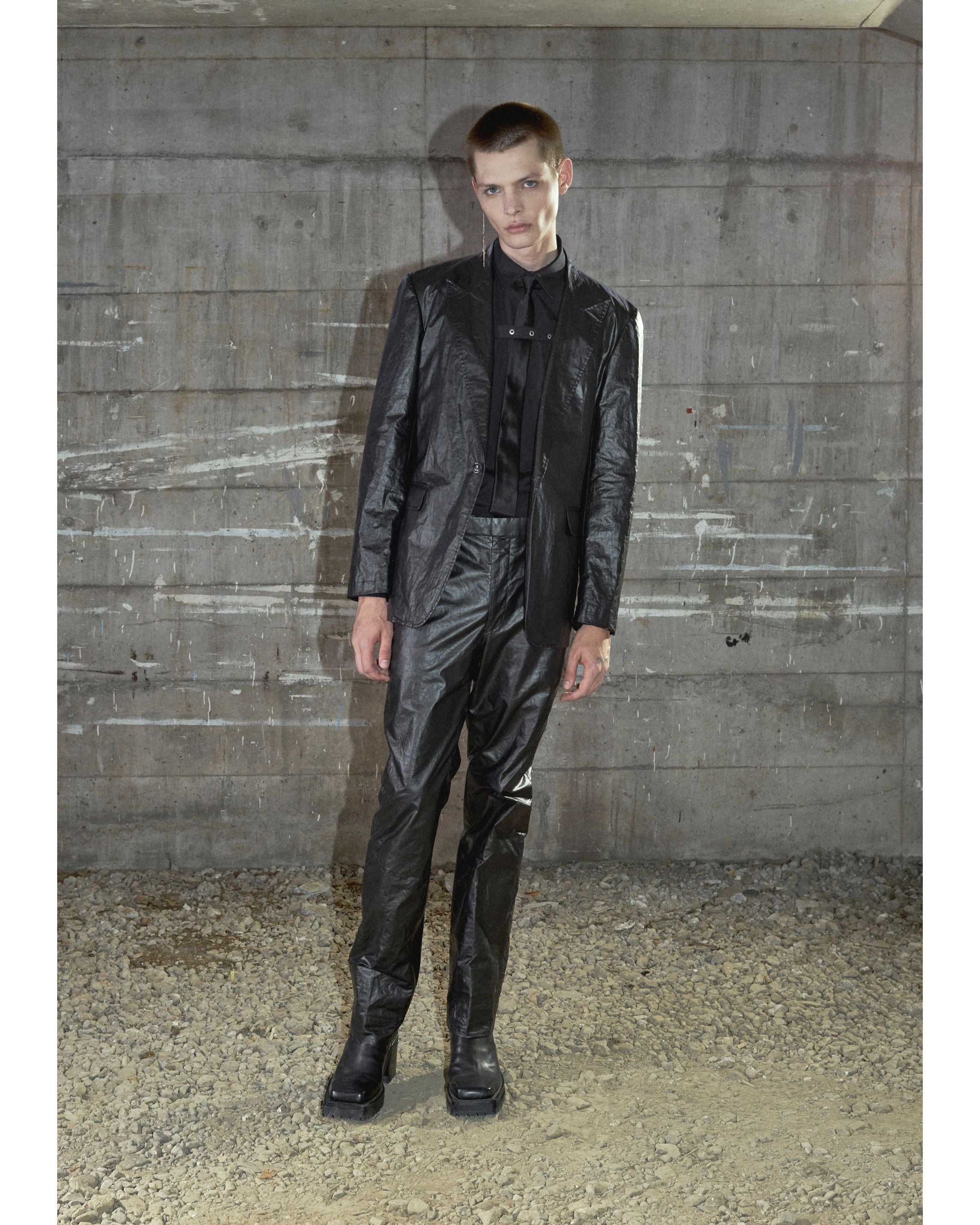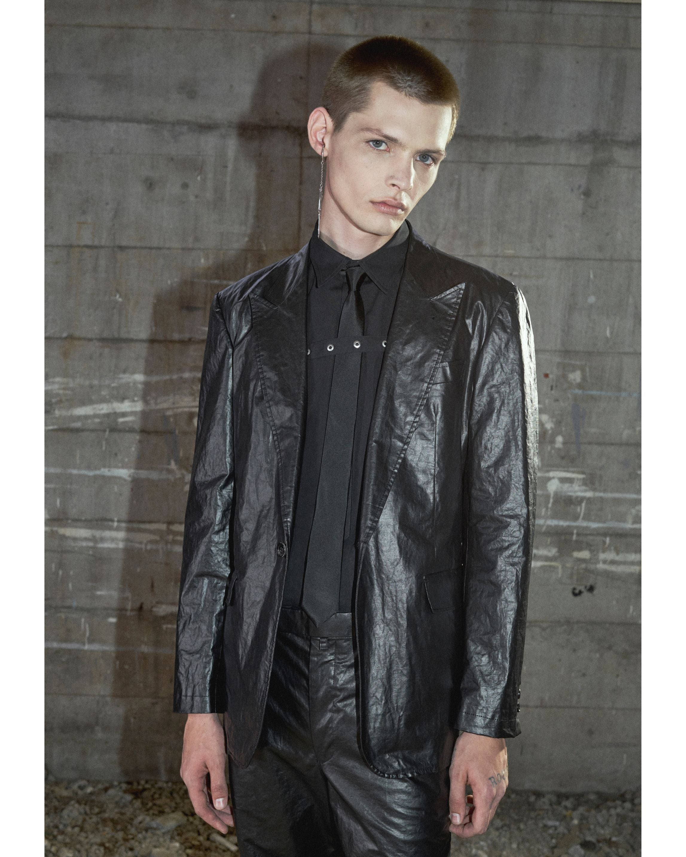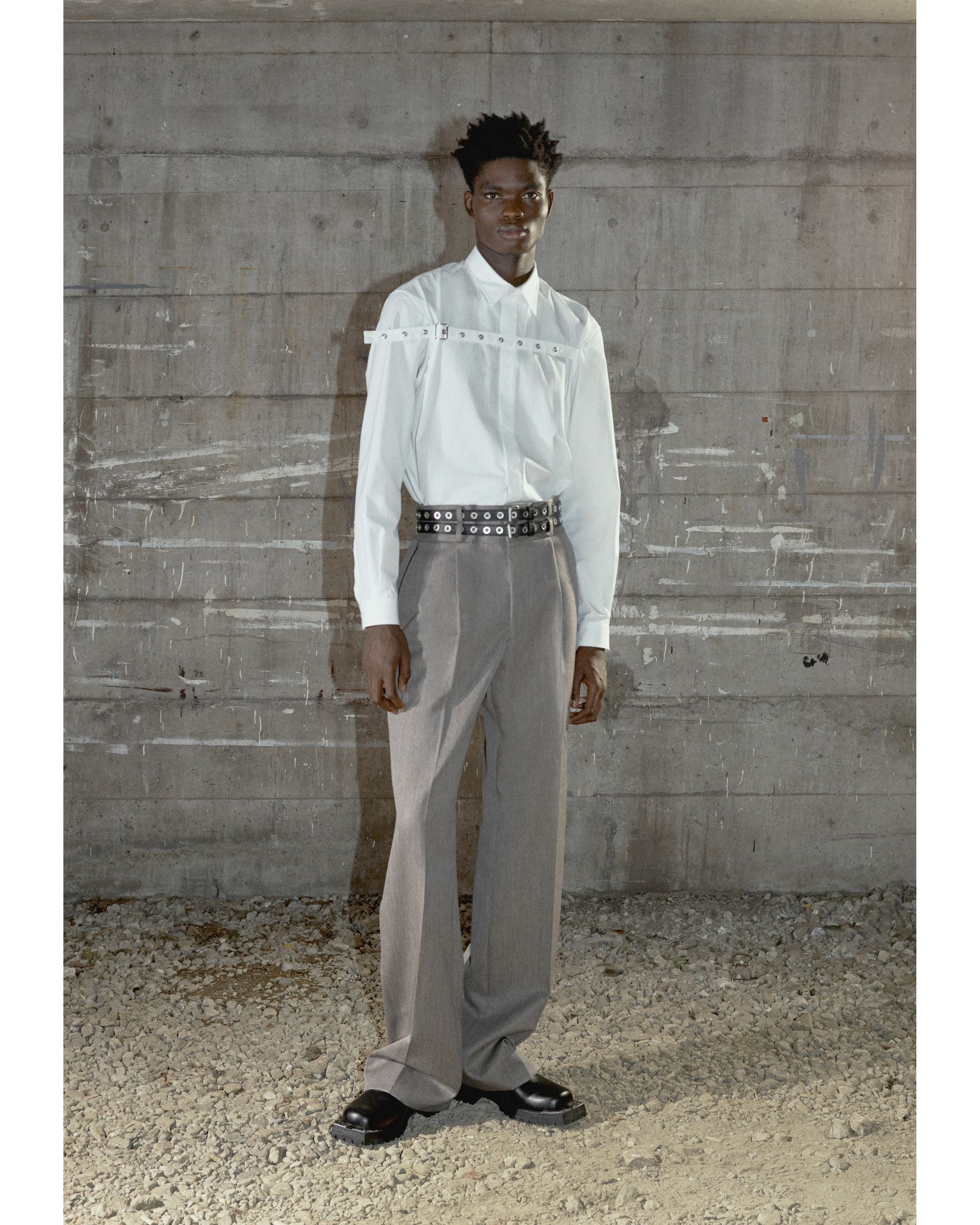 胸元を横断するベルトディテールが身体に緊張感のあるラインを描き、ベルトの調整によって、よりストイックな印象へと変化します。