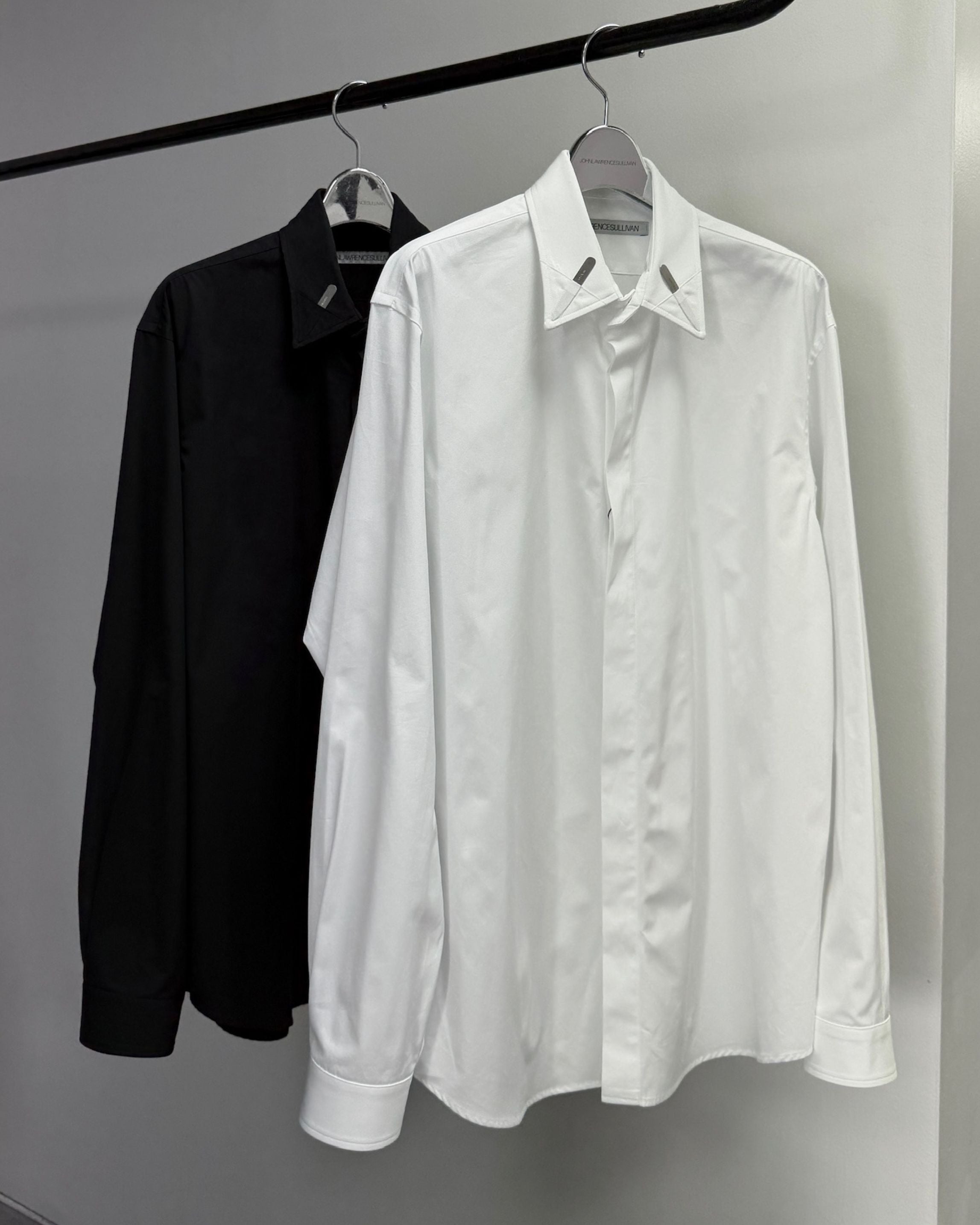 オリジナルのスレンレスカラーキーパーが表襟から覗くデザインのレギュラーカラーシャツ。