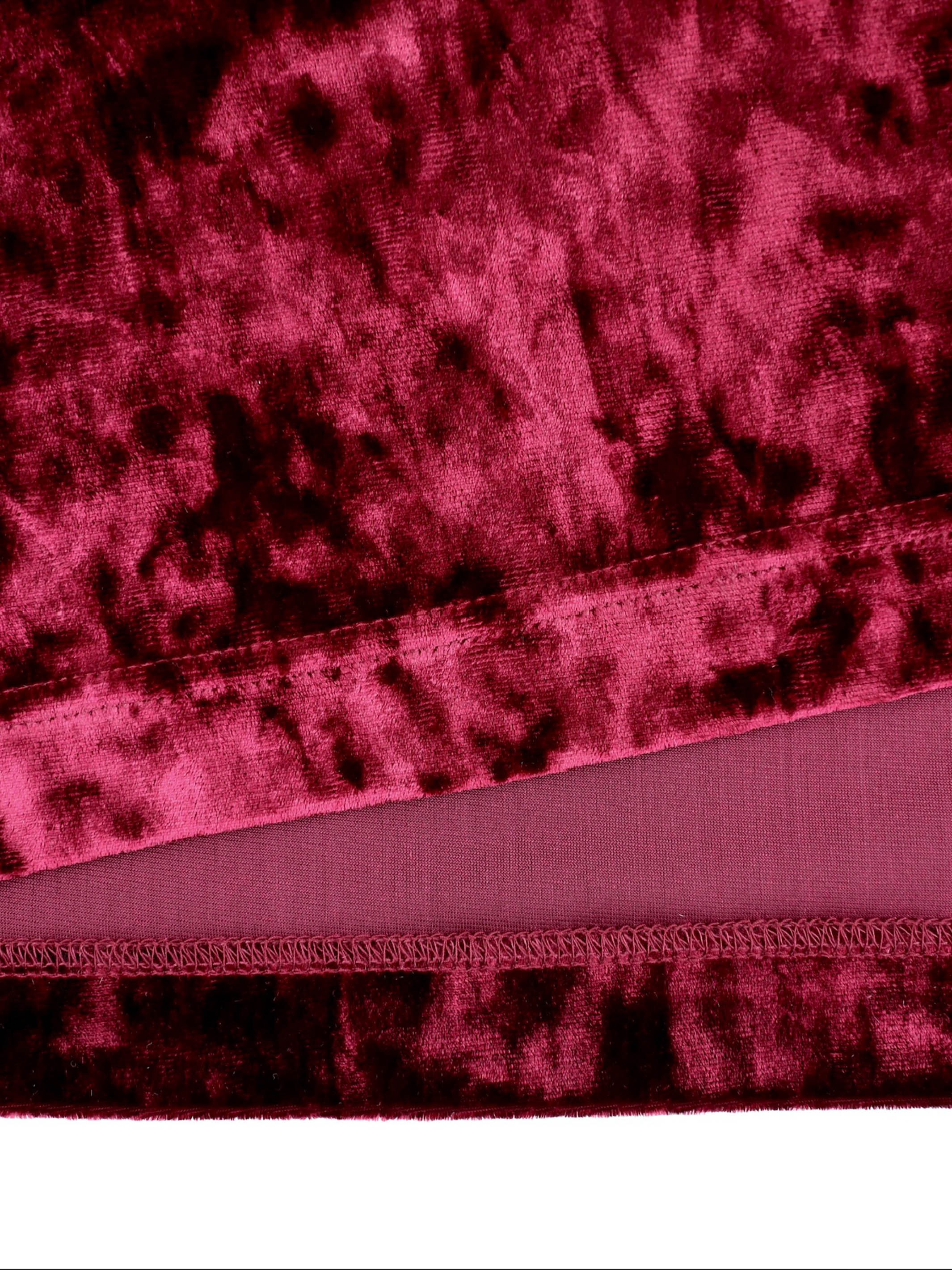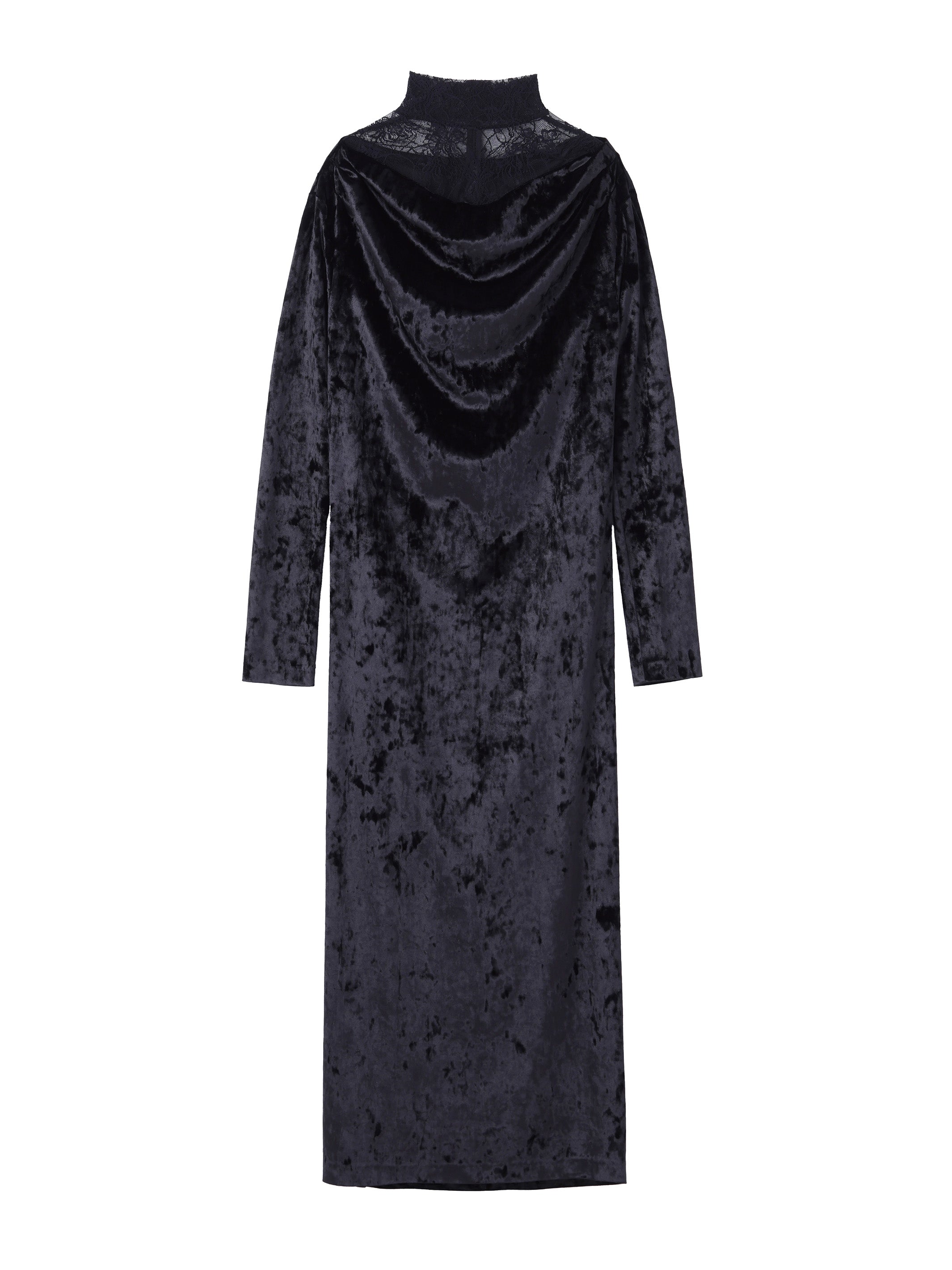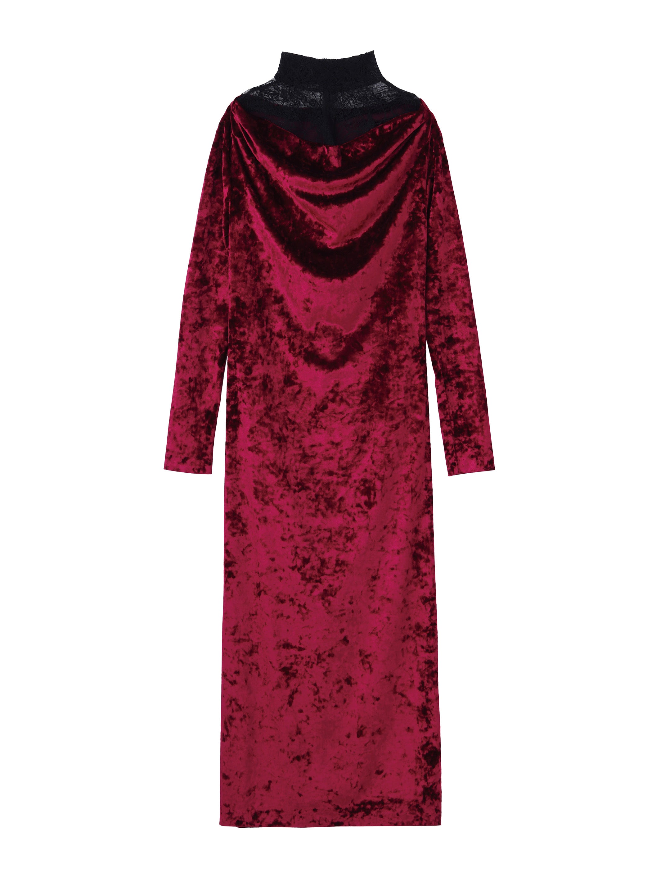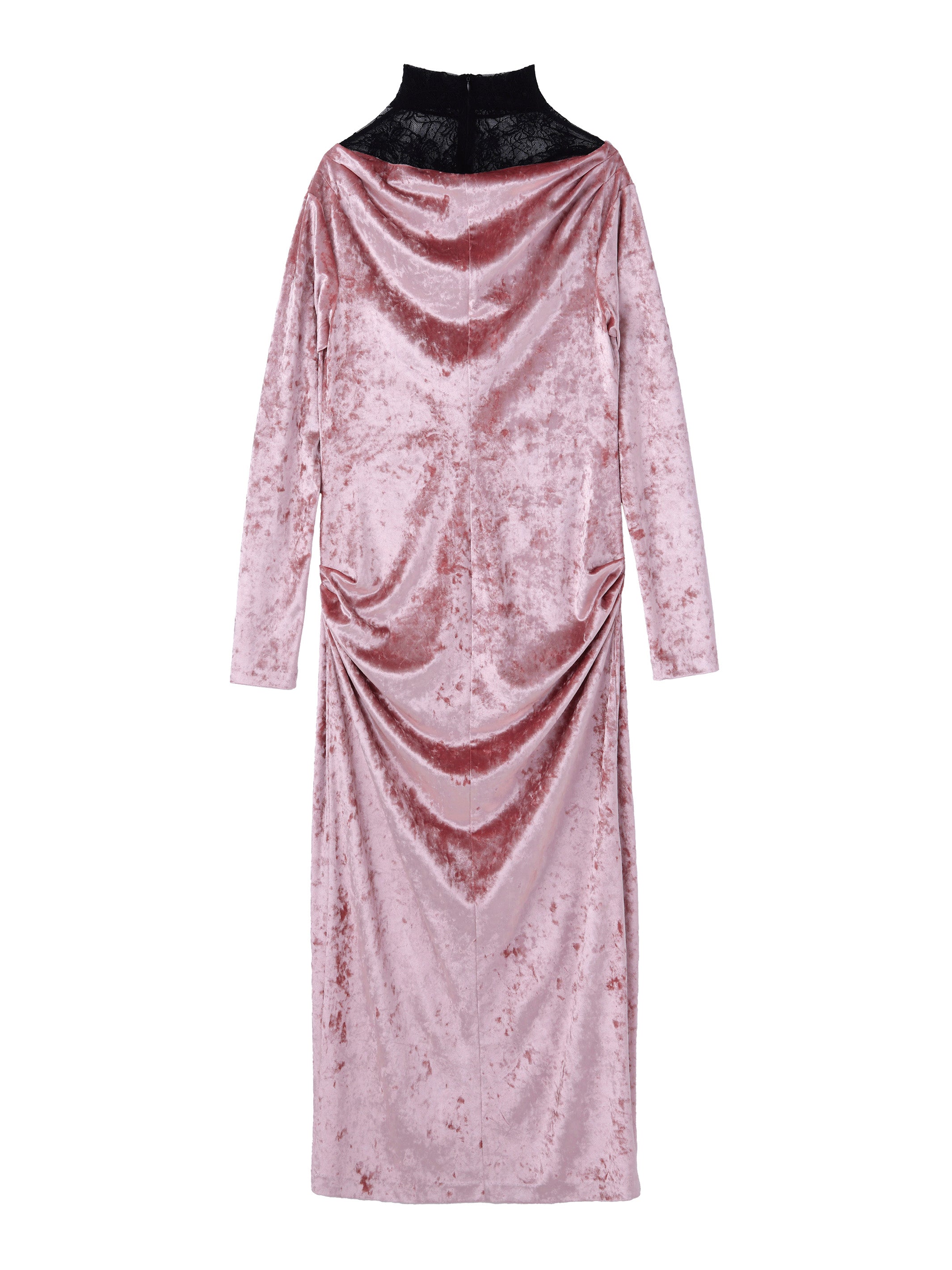 クラッシュベロアに繊細なストレッチレースを施したギャザードレス。