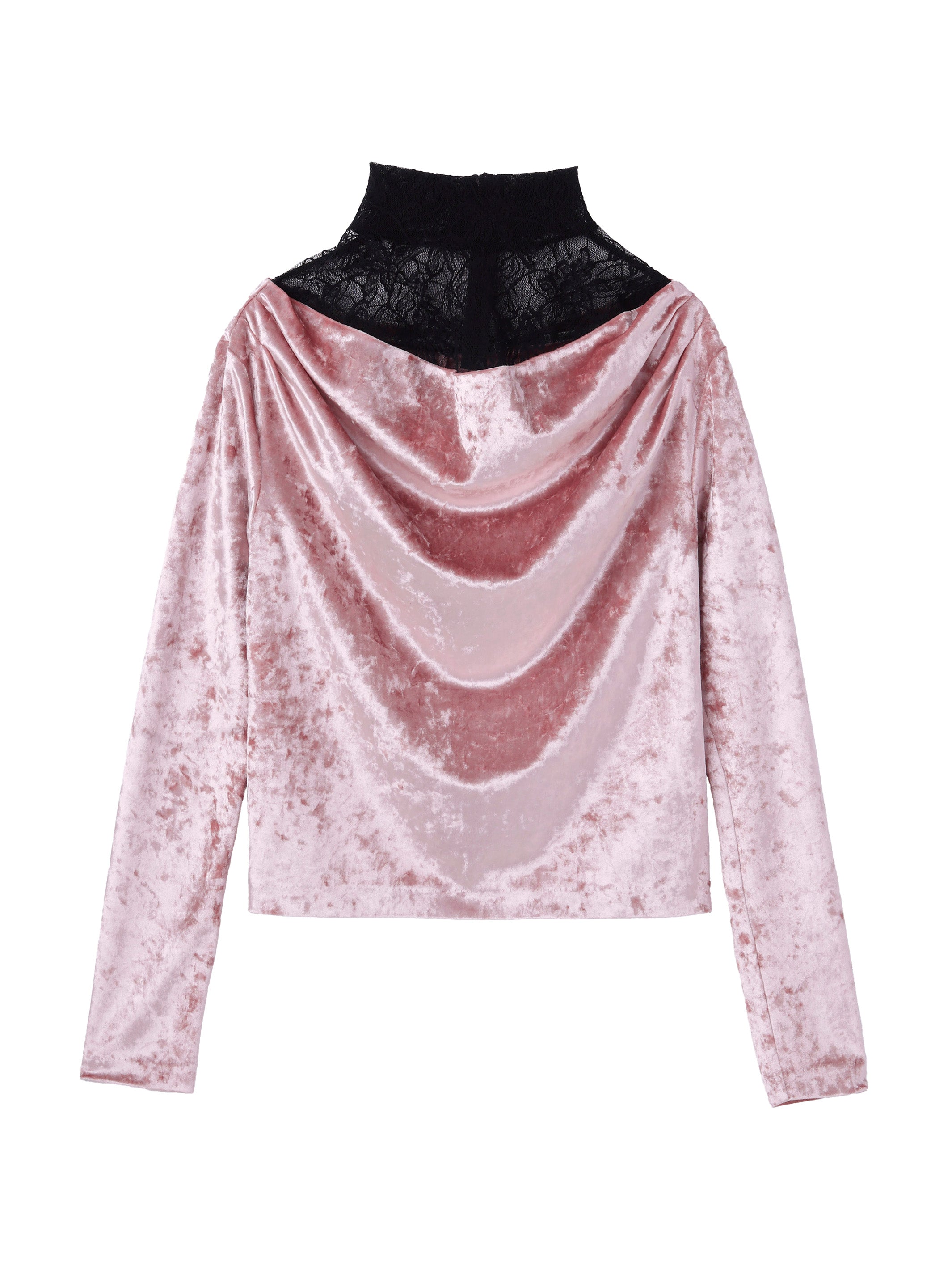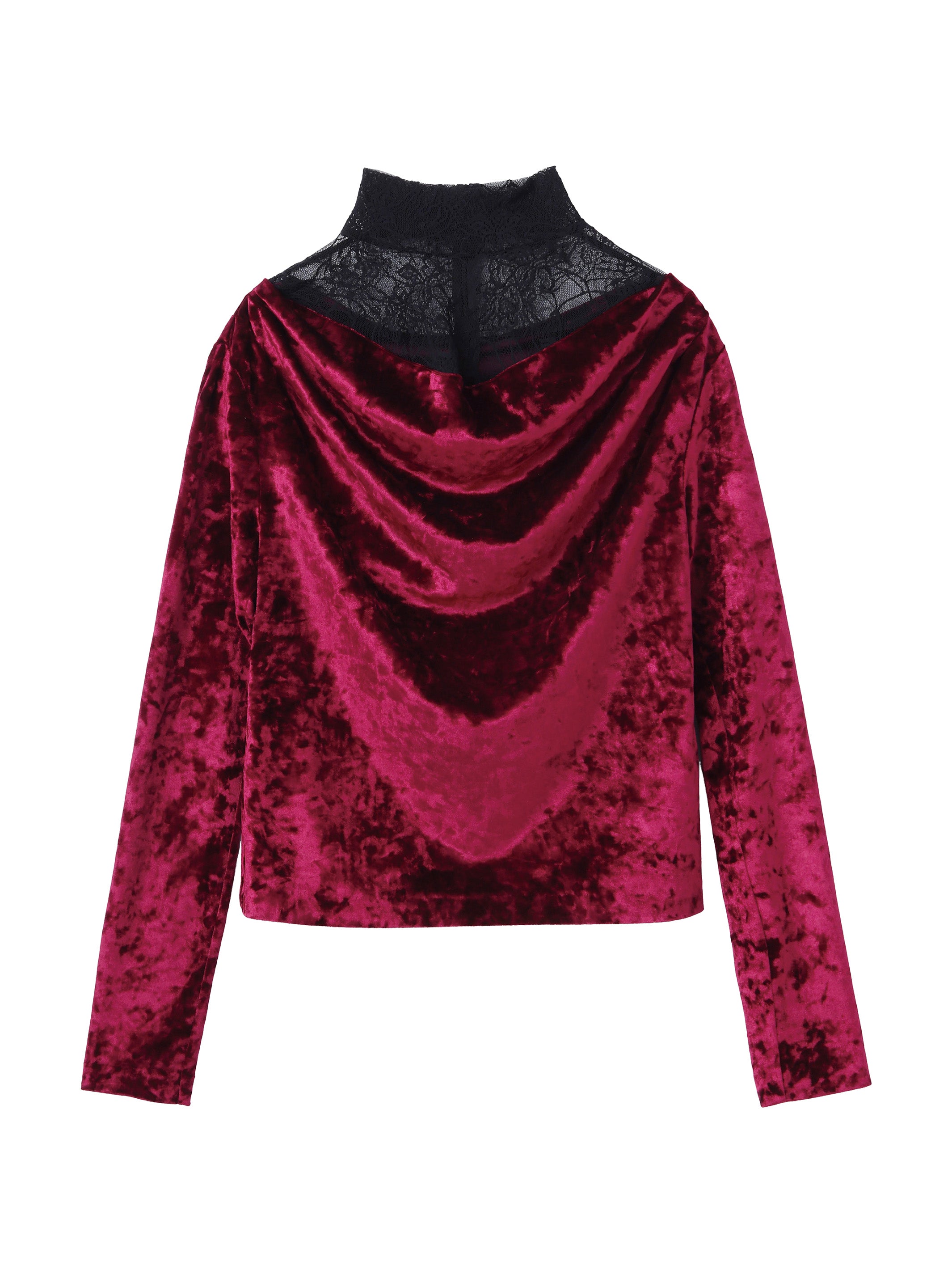 クラッシュベロアに繊細なストレッチレースを施したギャザートップス。