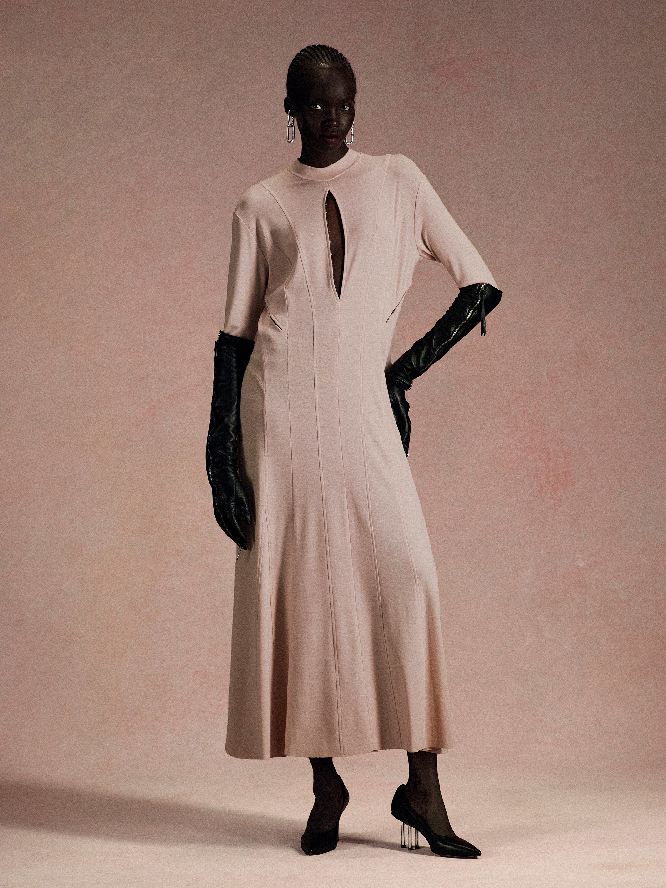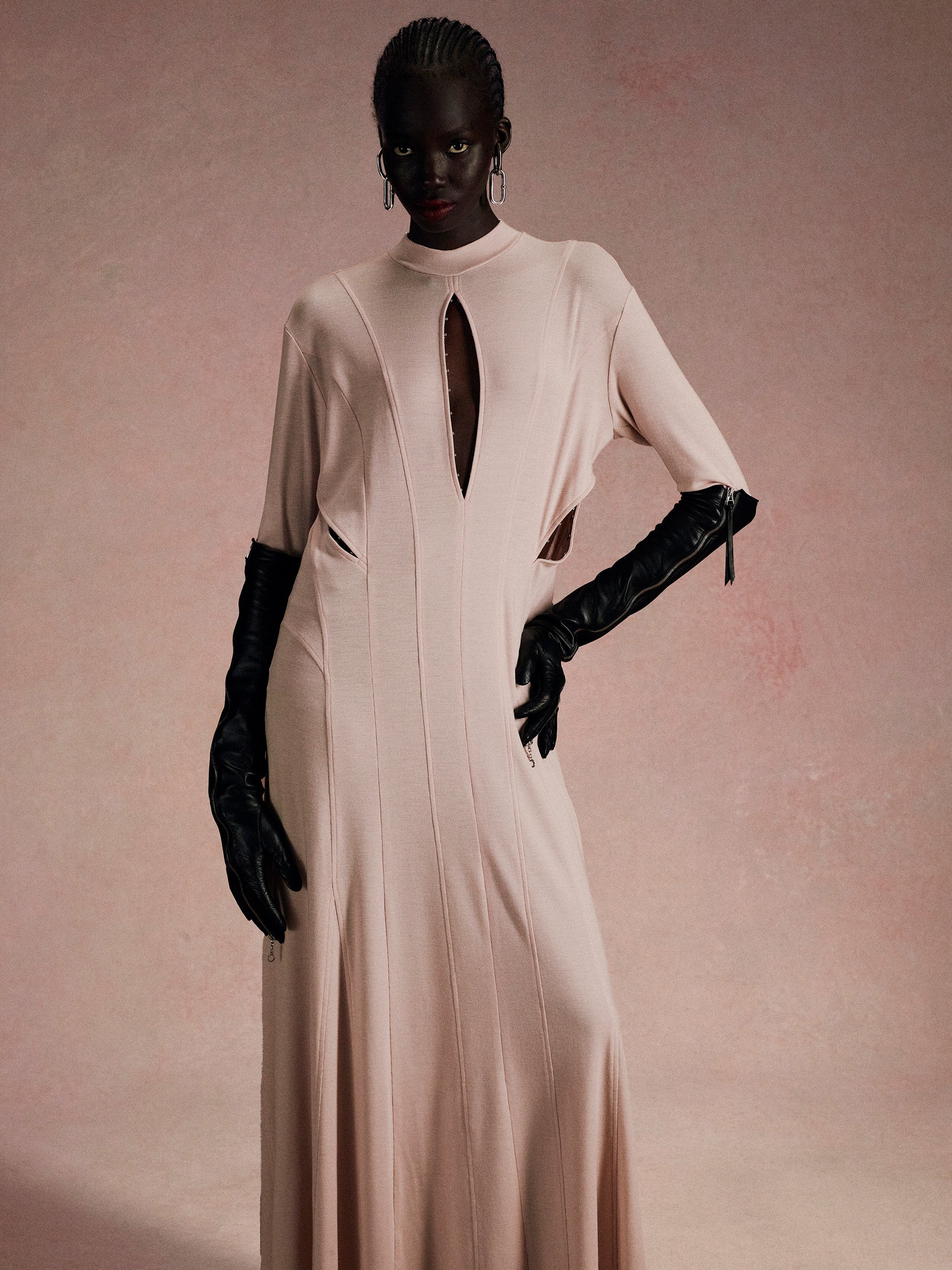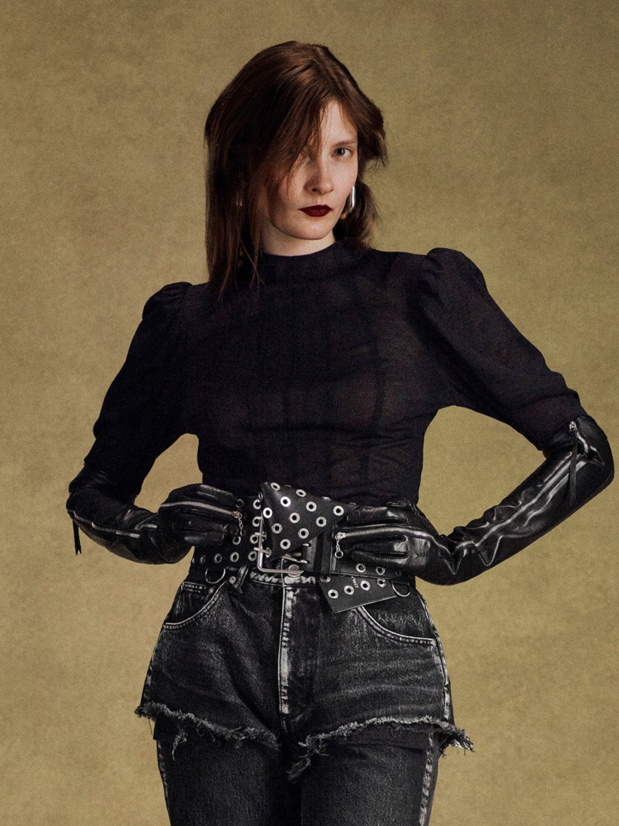 中指から袖口にかけて配置した逆開ファスナーが特徴的なレザーロンググローブ。