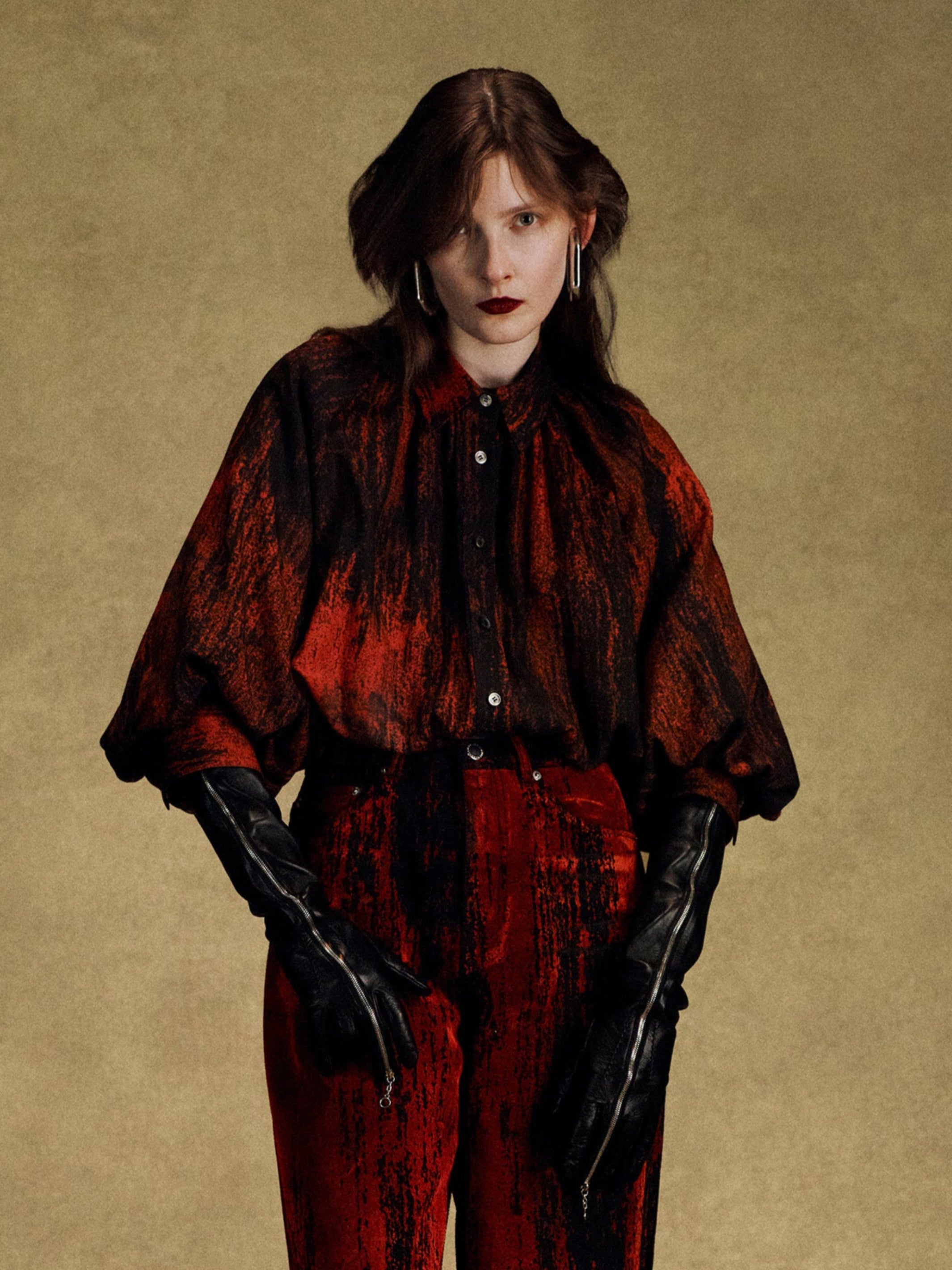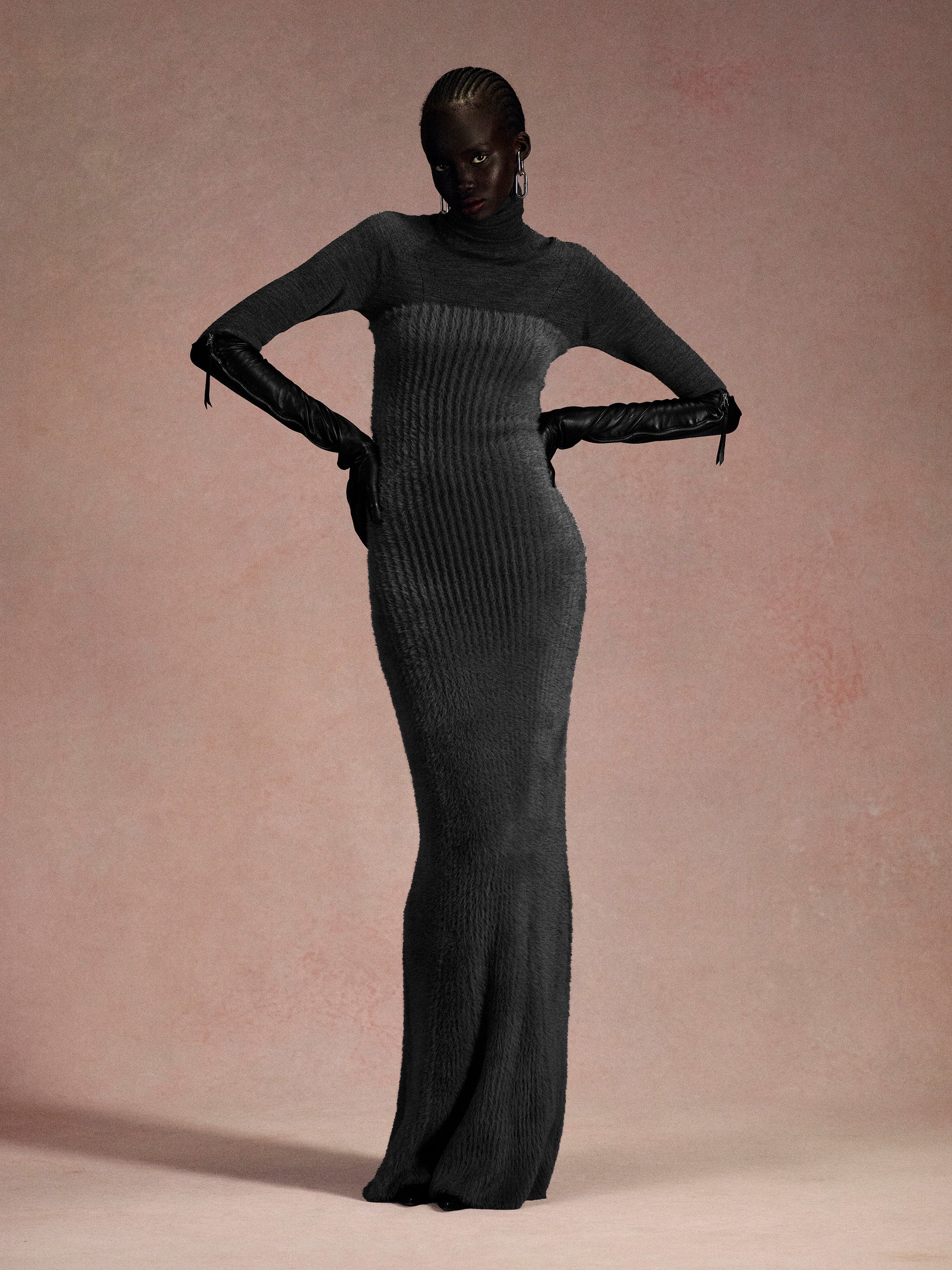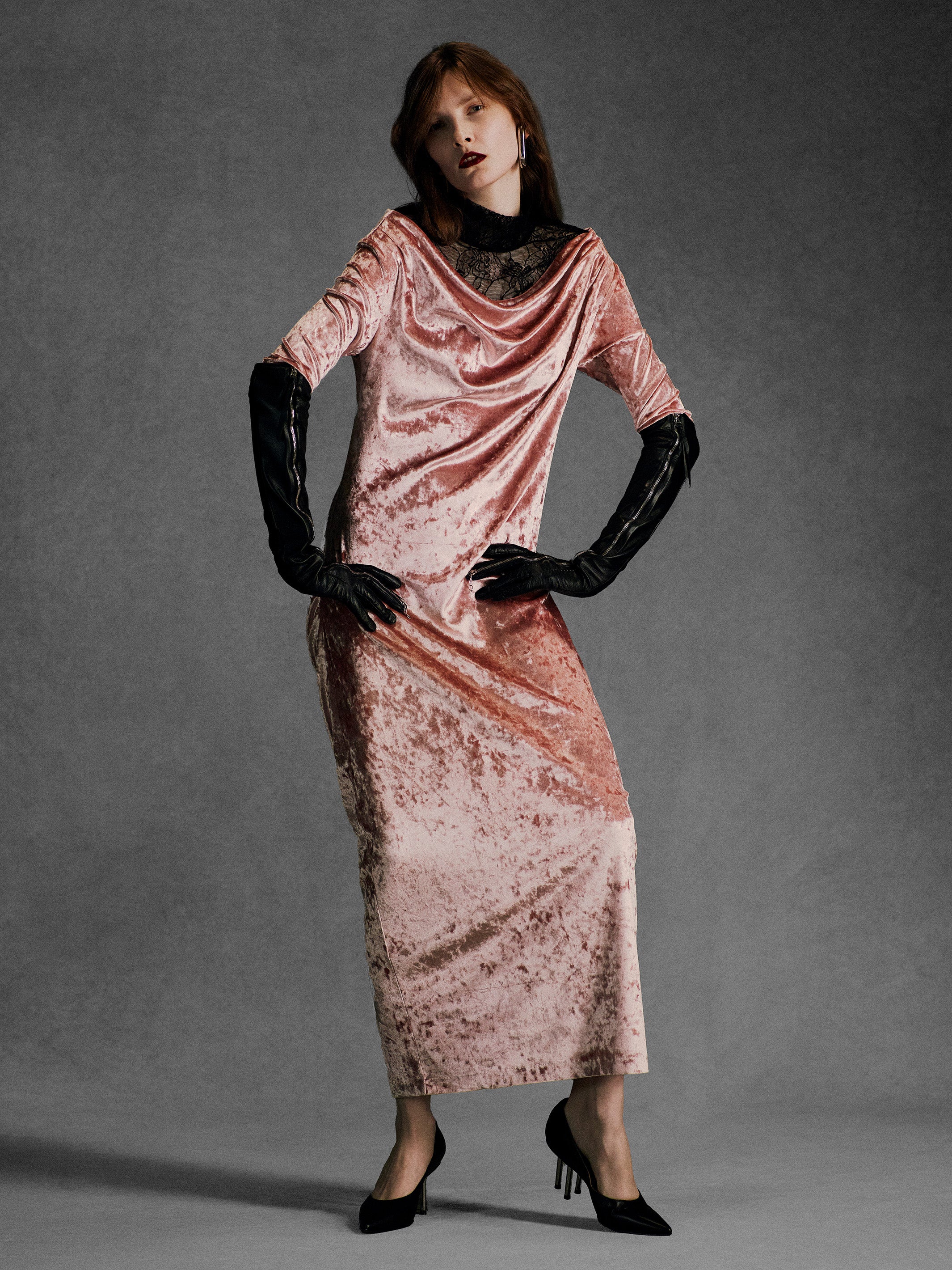 中指から袖口にかけて配置した逆開ファスナーが特徴的なレザーロンググローブ。