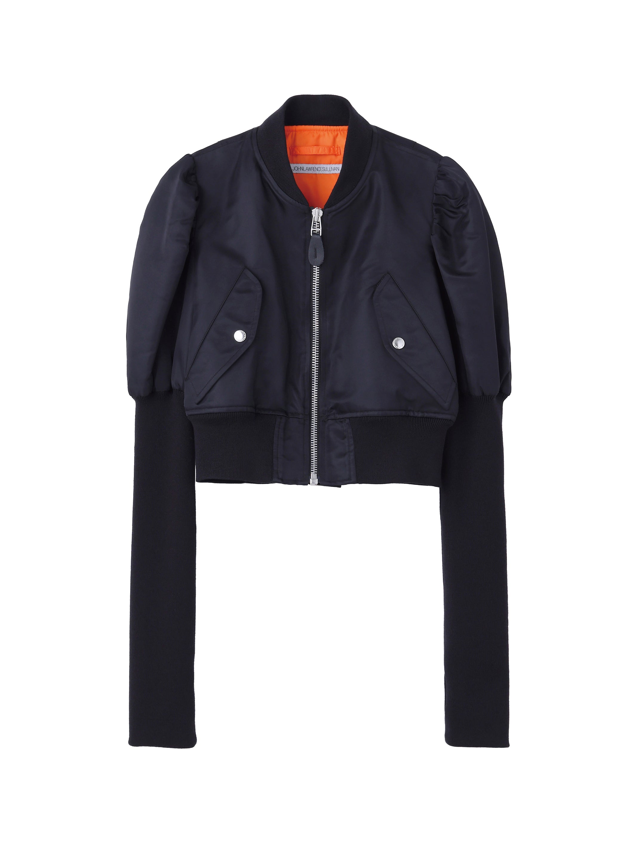 クロップド丈の身頃にドレス袖のようなボリュームのあるパフスリーブが特徴的なボンバージャケット。