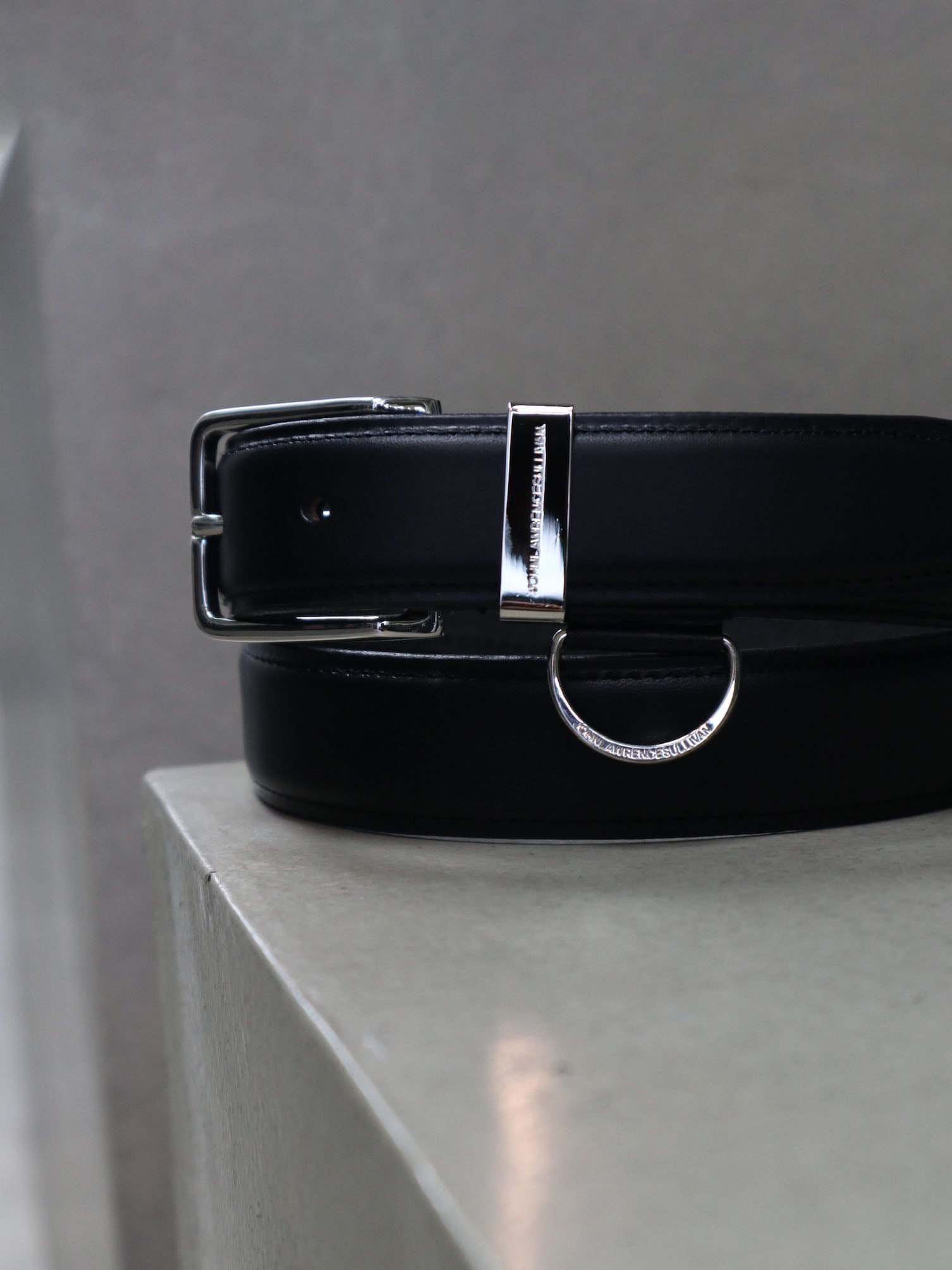 ブッテロレザーを使用したDリング付きピンバックルベルト。帯の中心が緩やかに盛り上がったフェザー仕上げで仕立てられており、フォーマルからカジュアルまで対応。