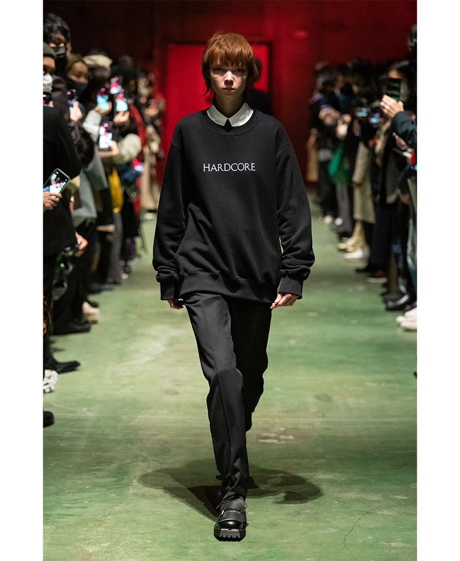 "HARDCORE"がプリントされた、ソフトな裏毛を使用したスウェットプルオーバー。