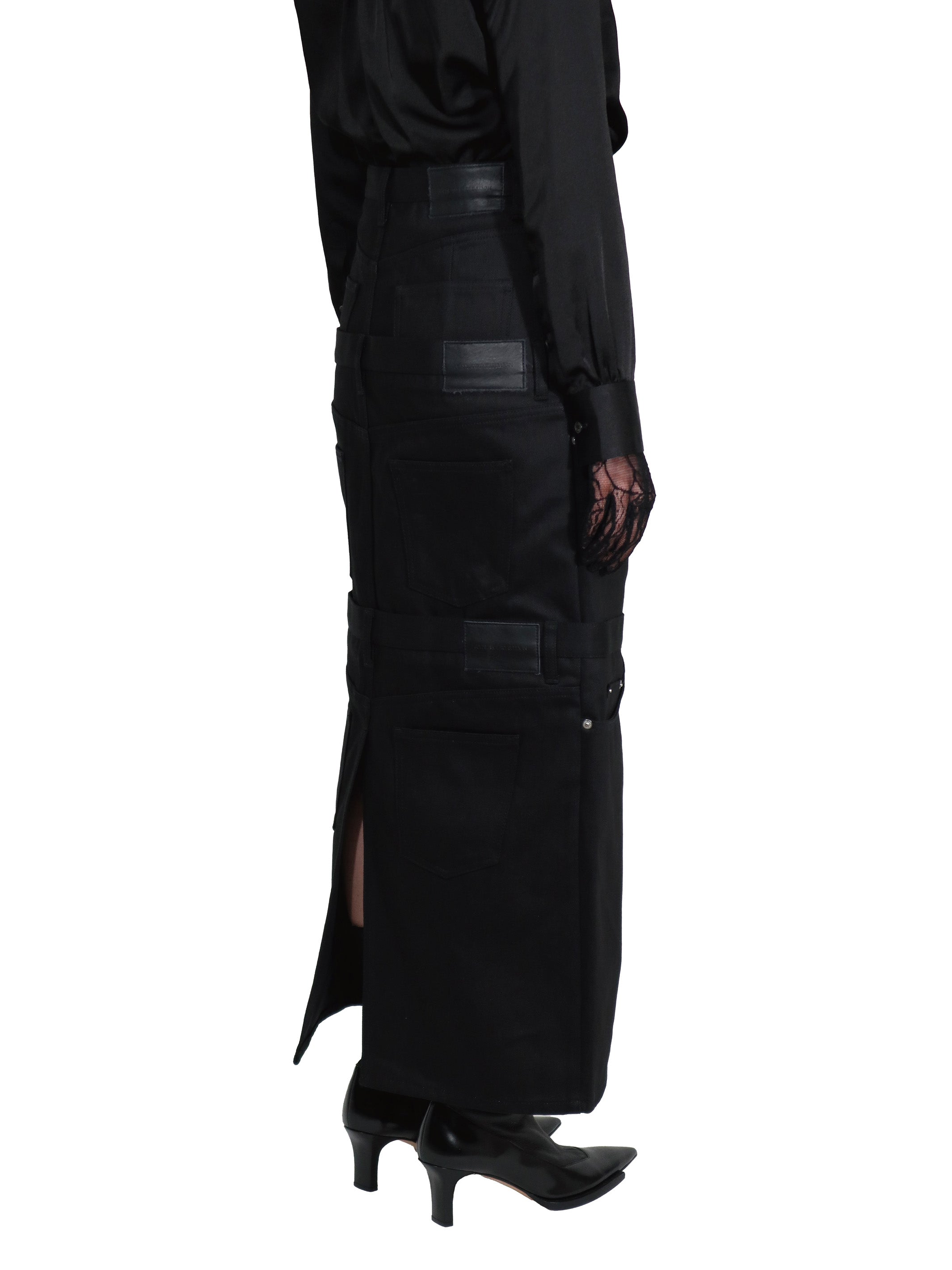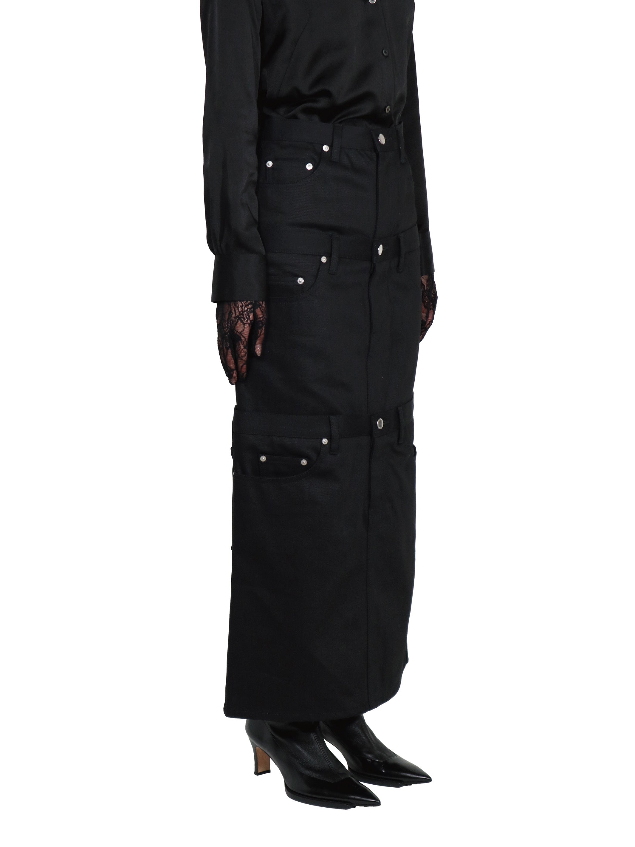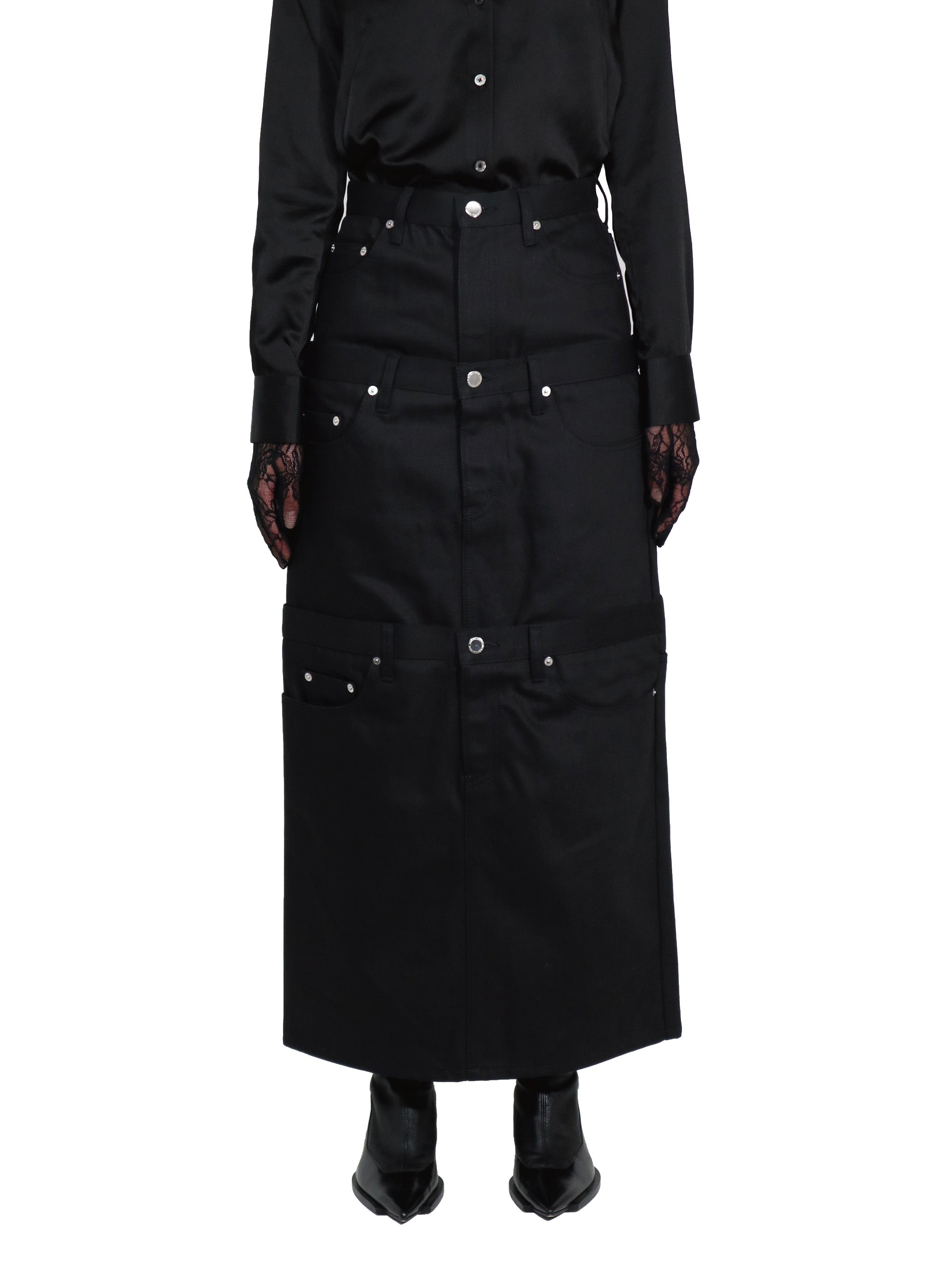 スタッキングのように同じアイテムを重ねたデザインが特徴のトリプルデニムスカート。