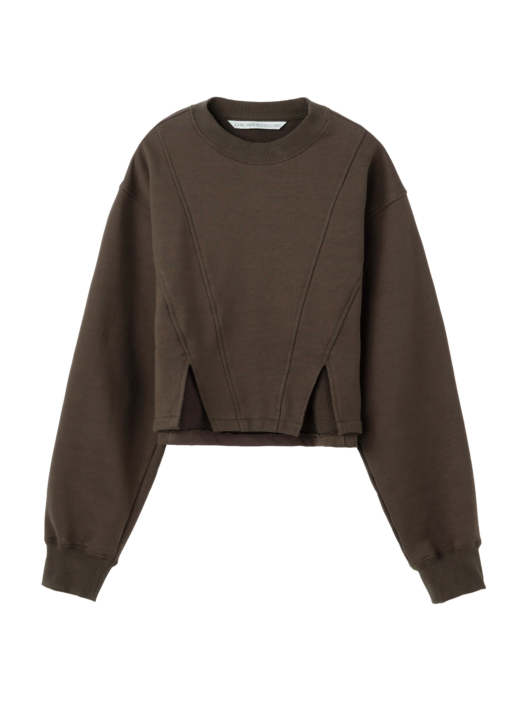 コルセットを思わせるカットラインと前スリットが特徴的なプルオーバー。