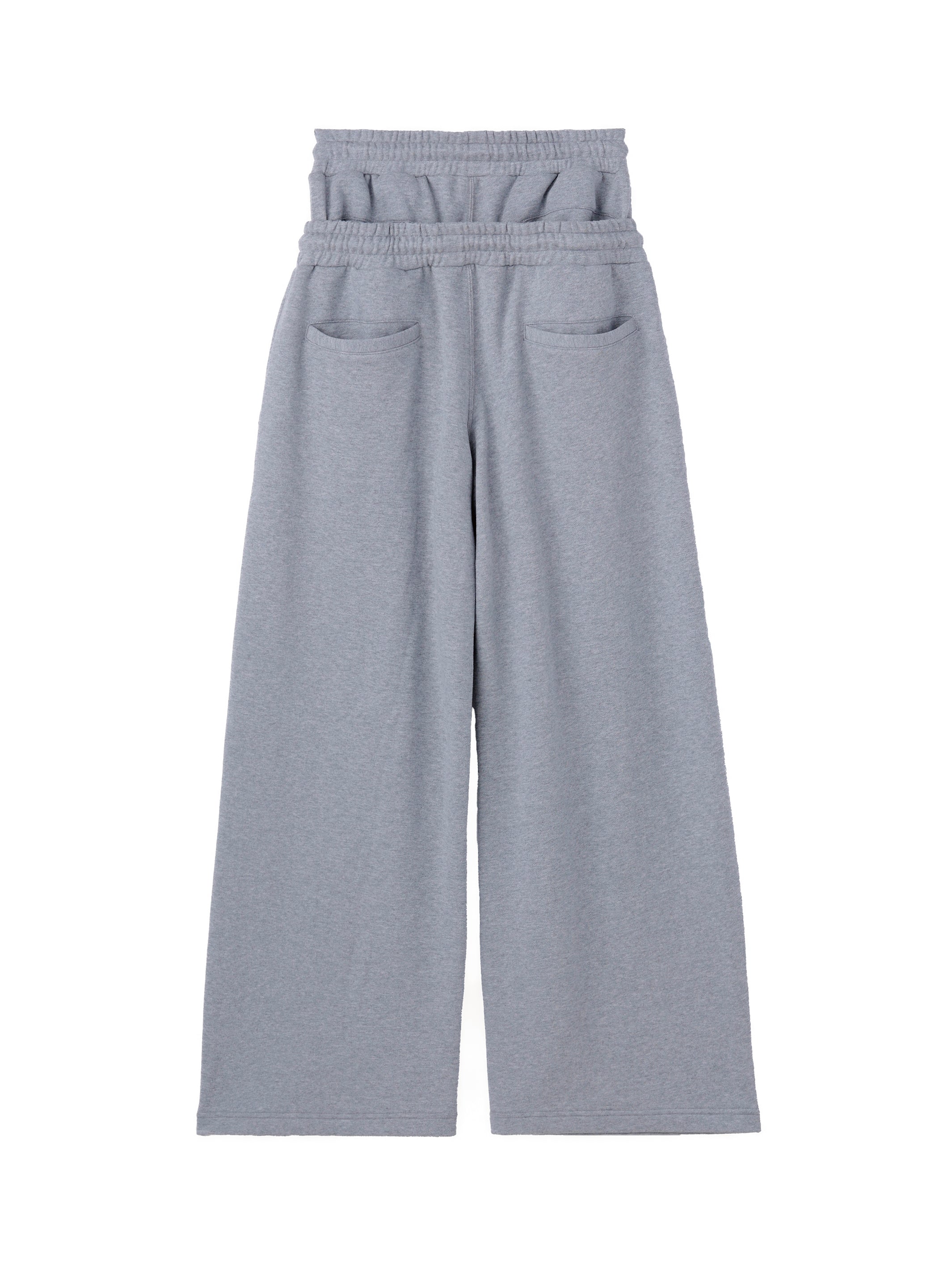 スタッキングのように同じアイテムを重ねたデザインが特徴的な2連スウェットパンツ。