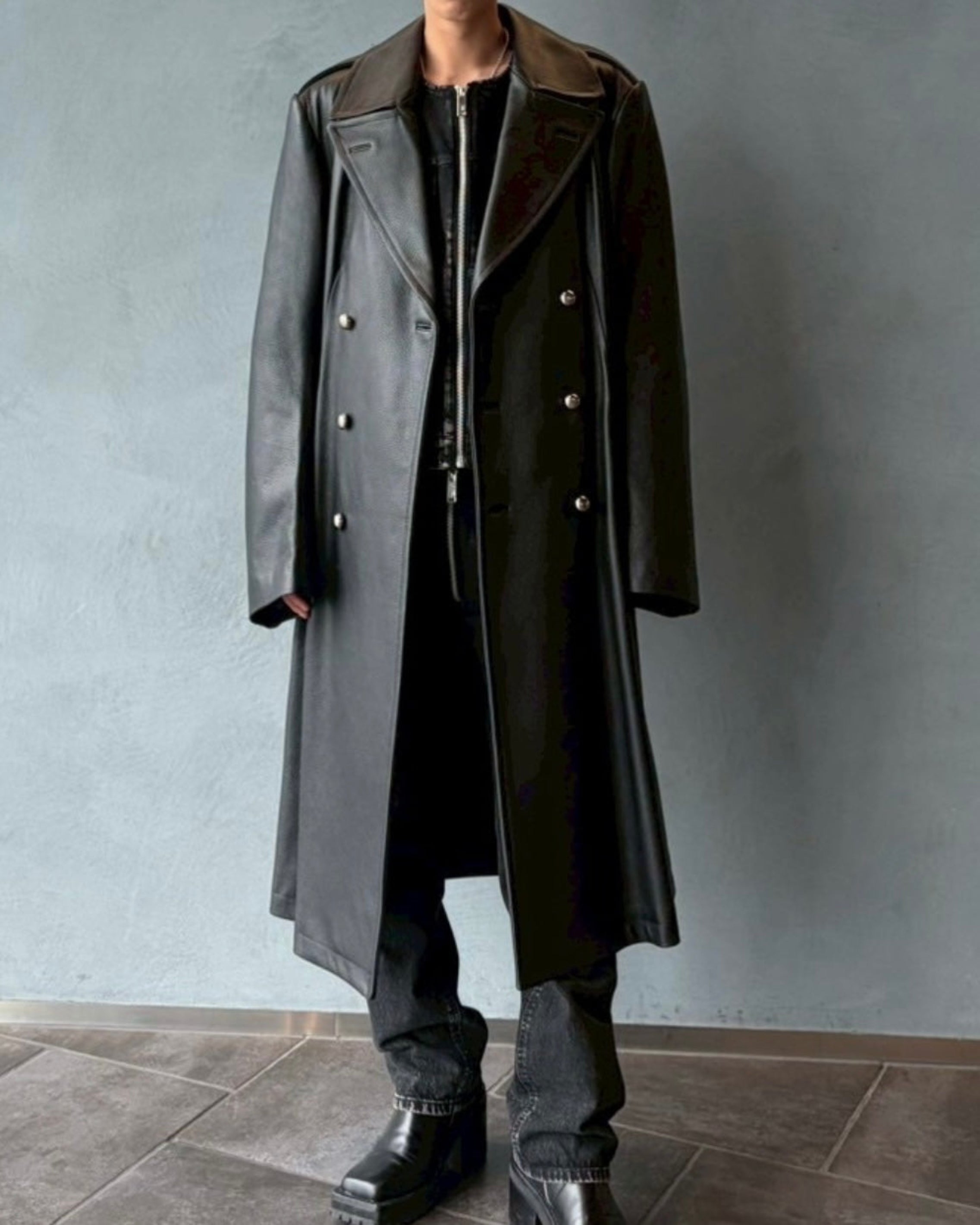 GRAIN LEATHER MASSIVE ROUNDED SLEEVE DOUBLE BREASTED COAT