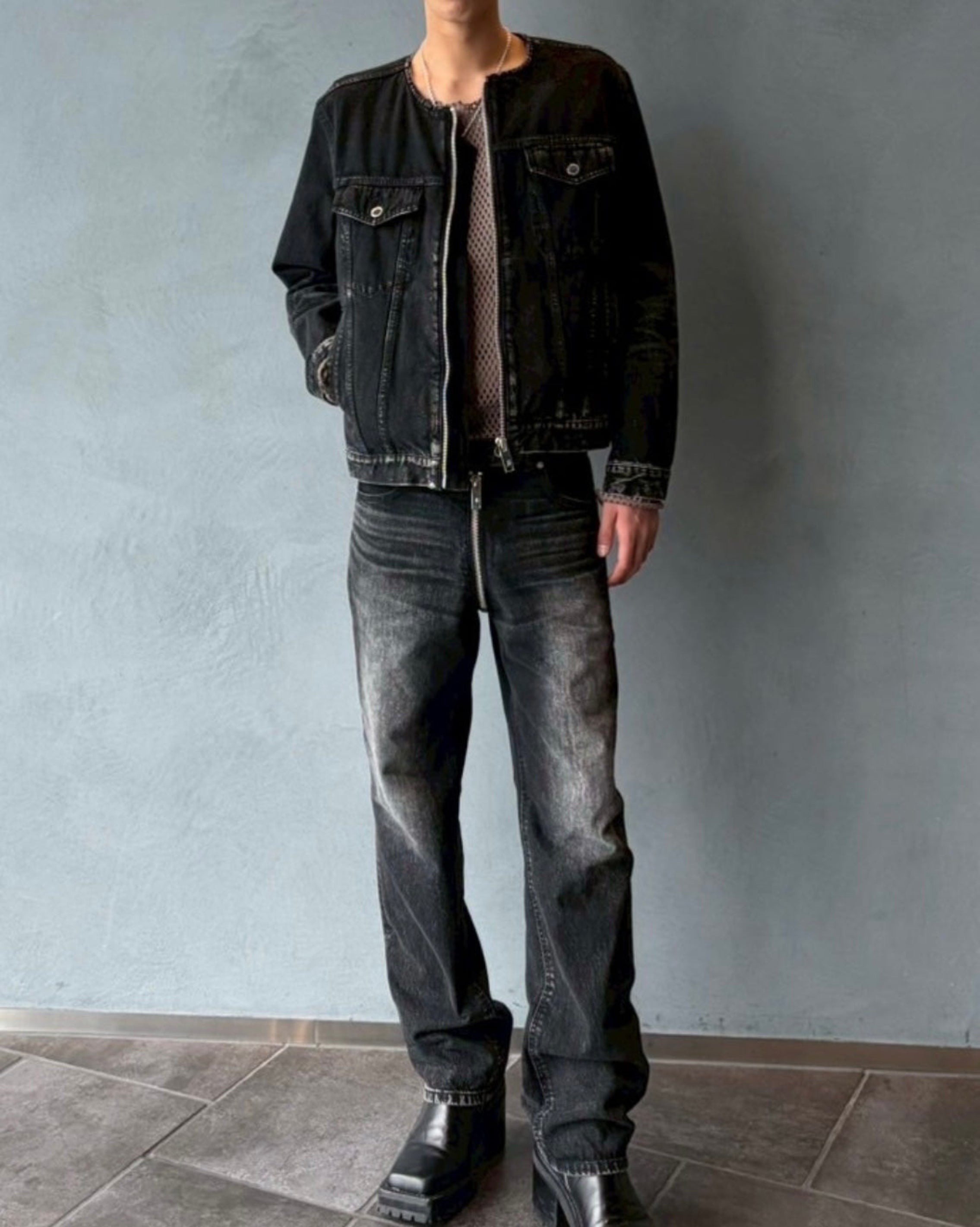 フロントを走る直線的なジップアップデザインが象徴的なノーカラーデニムジャケット。