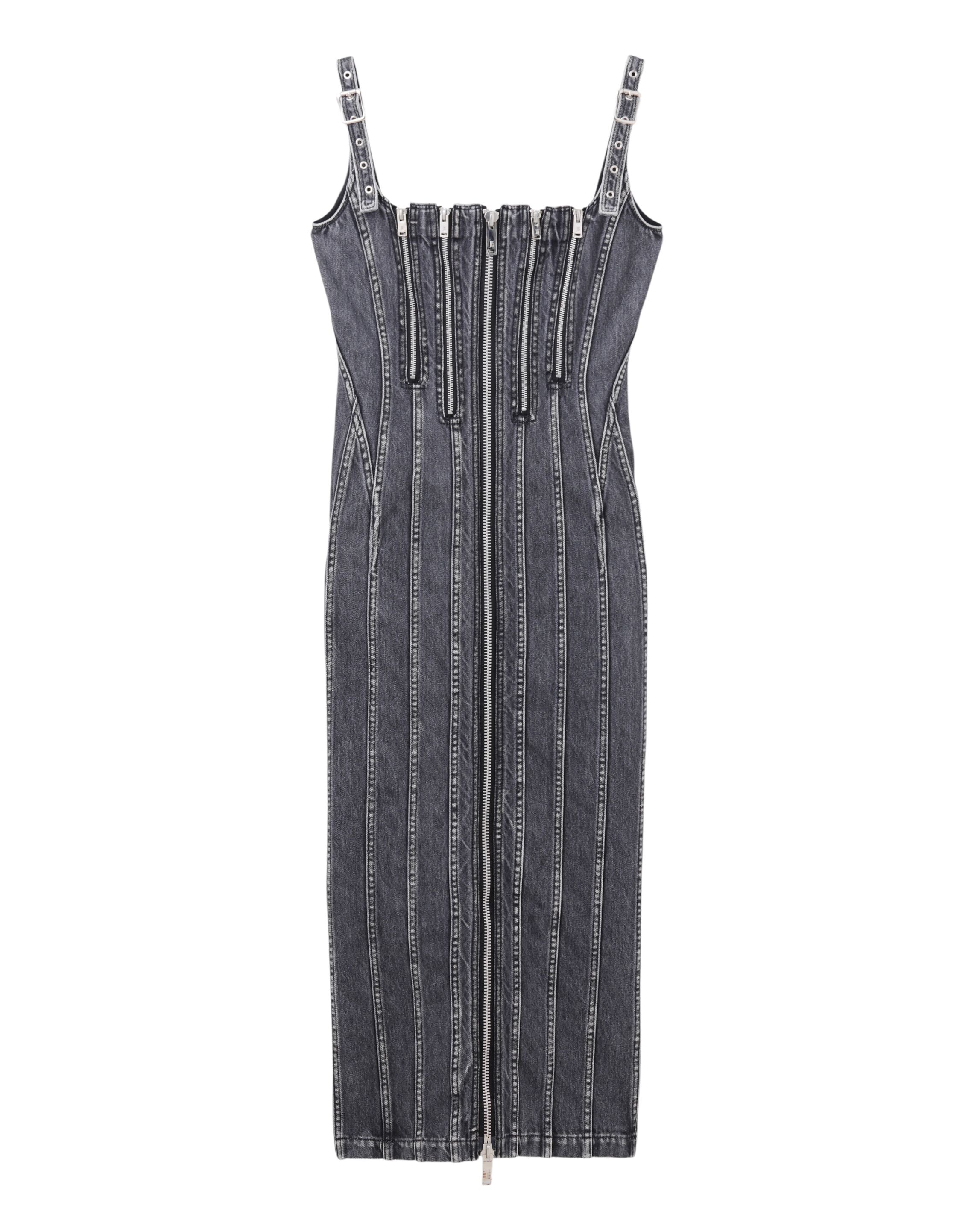 コルセットラインを効果的に取り入れたフェティッシュなアワーグラスラインが特徴のデニムドレス。