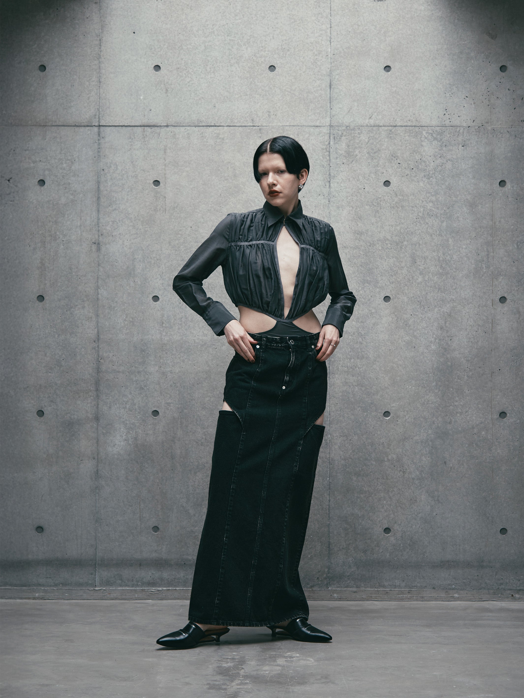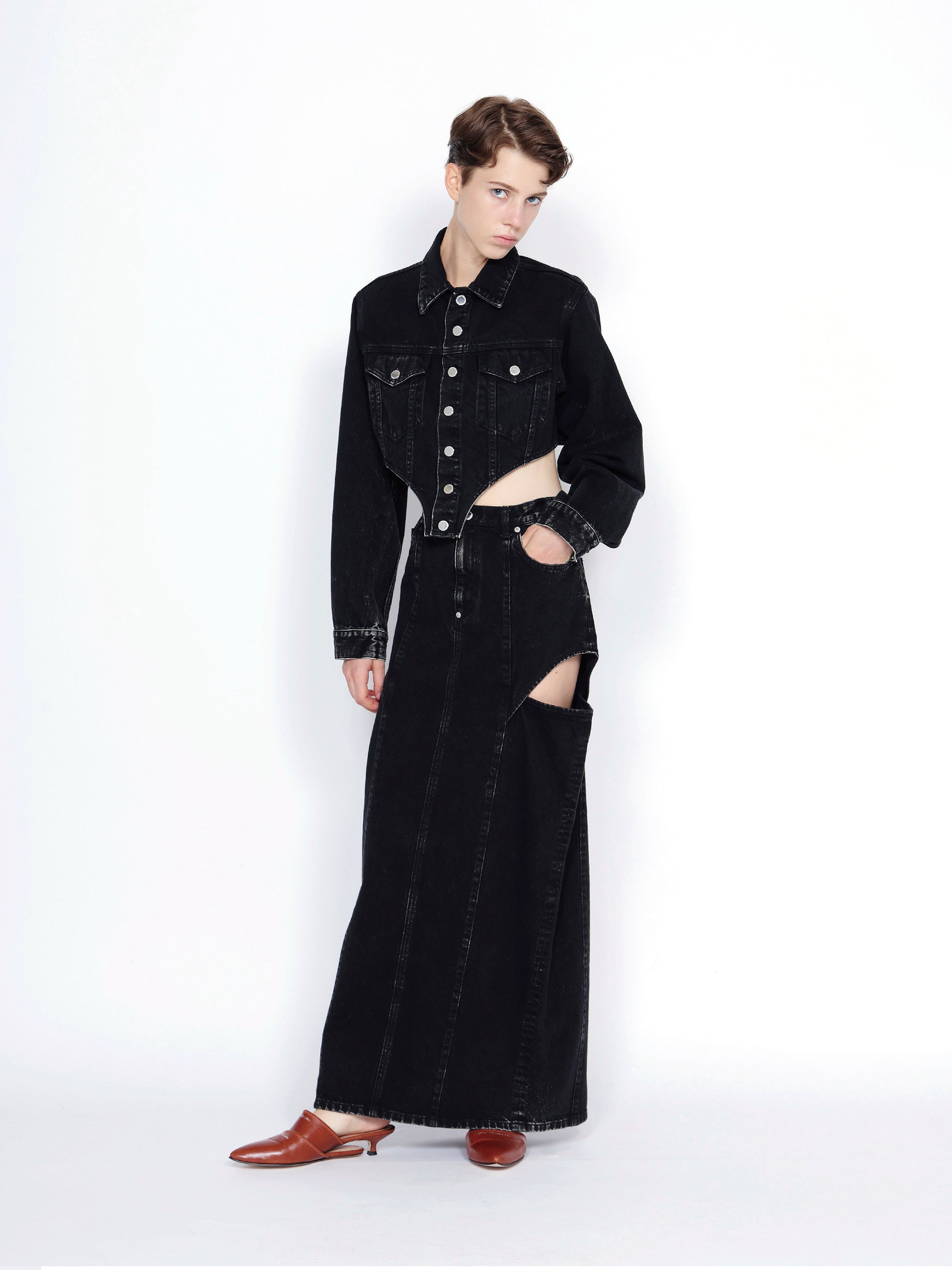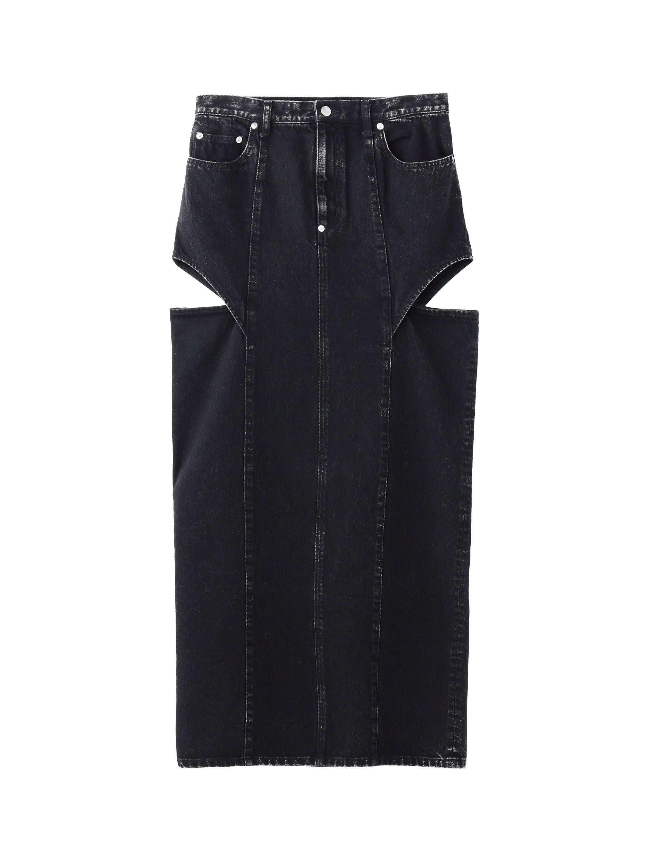 腿部分にカットアウトディテールの入った、フェティッシュなデザインのホローアウトタイトデニムスカート。