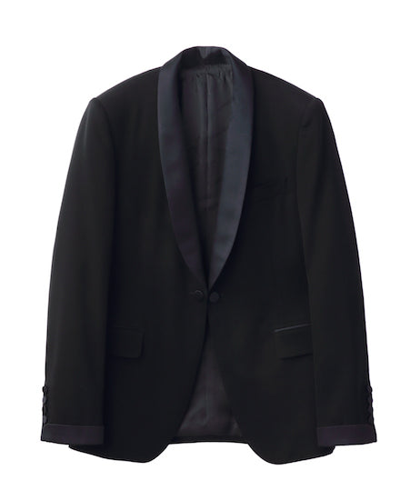 上質なタキシードクロスを使用したショールカラータキシードジャケット。同素材のトラウザーズ、ベストあり。